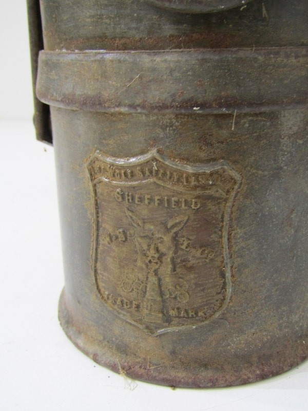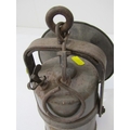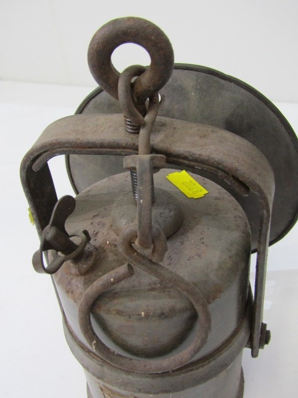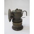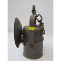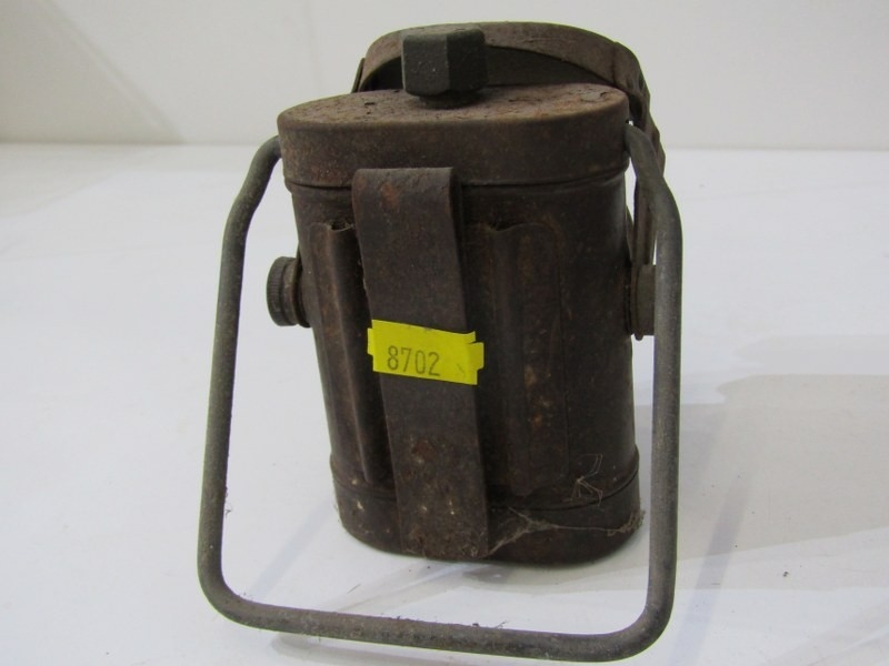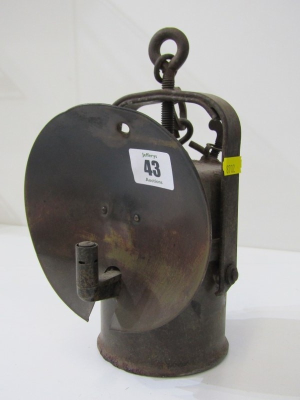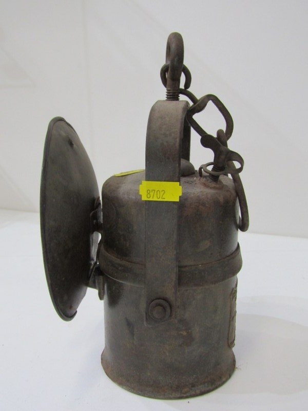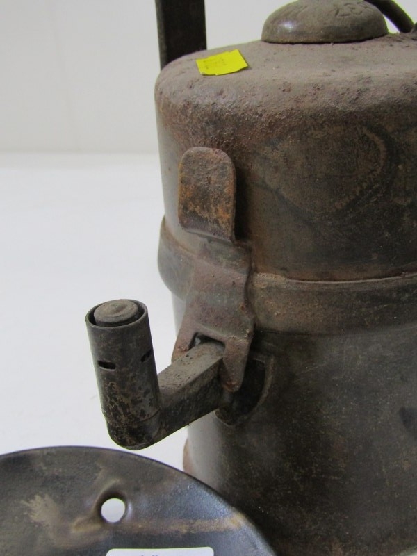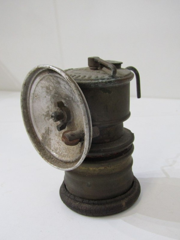 TWO MINER'S CARBIDE LAMPS, one cap lamp and one hand lamp, together with a World War II blackout bicycle lamp