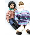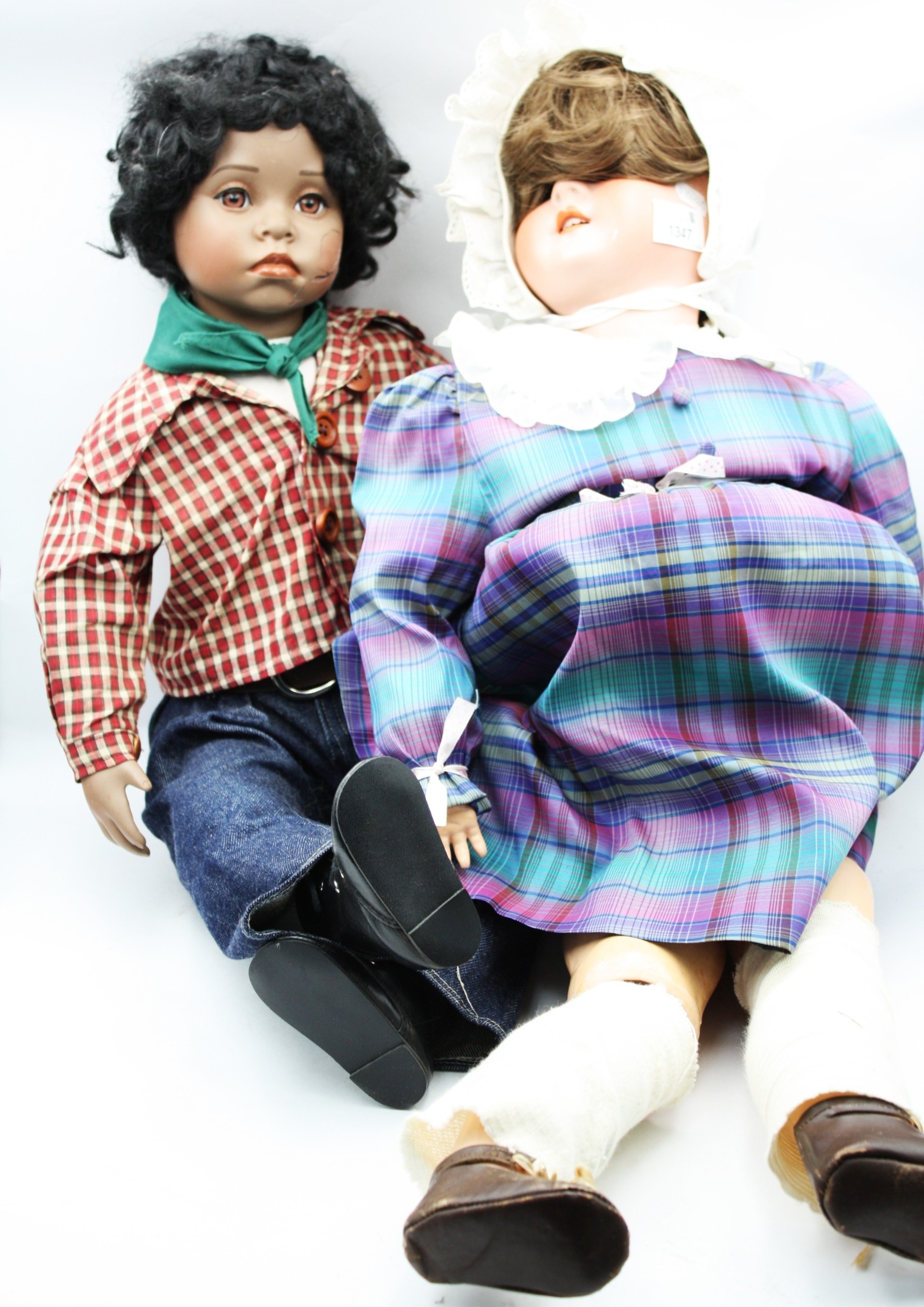 Two Large Vintage Bisque Head Dolls, including a German Simon & Halbig / Porzellanfabrik Burggrub dolly face girl doll (L74cm), marked "S&H / PB 914 12 1/2" and a Black African American weighted seat doll (H42cm), marked "AB 39 A", both with costumes. (2) [739986]