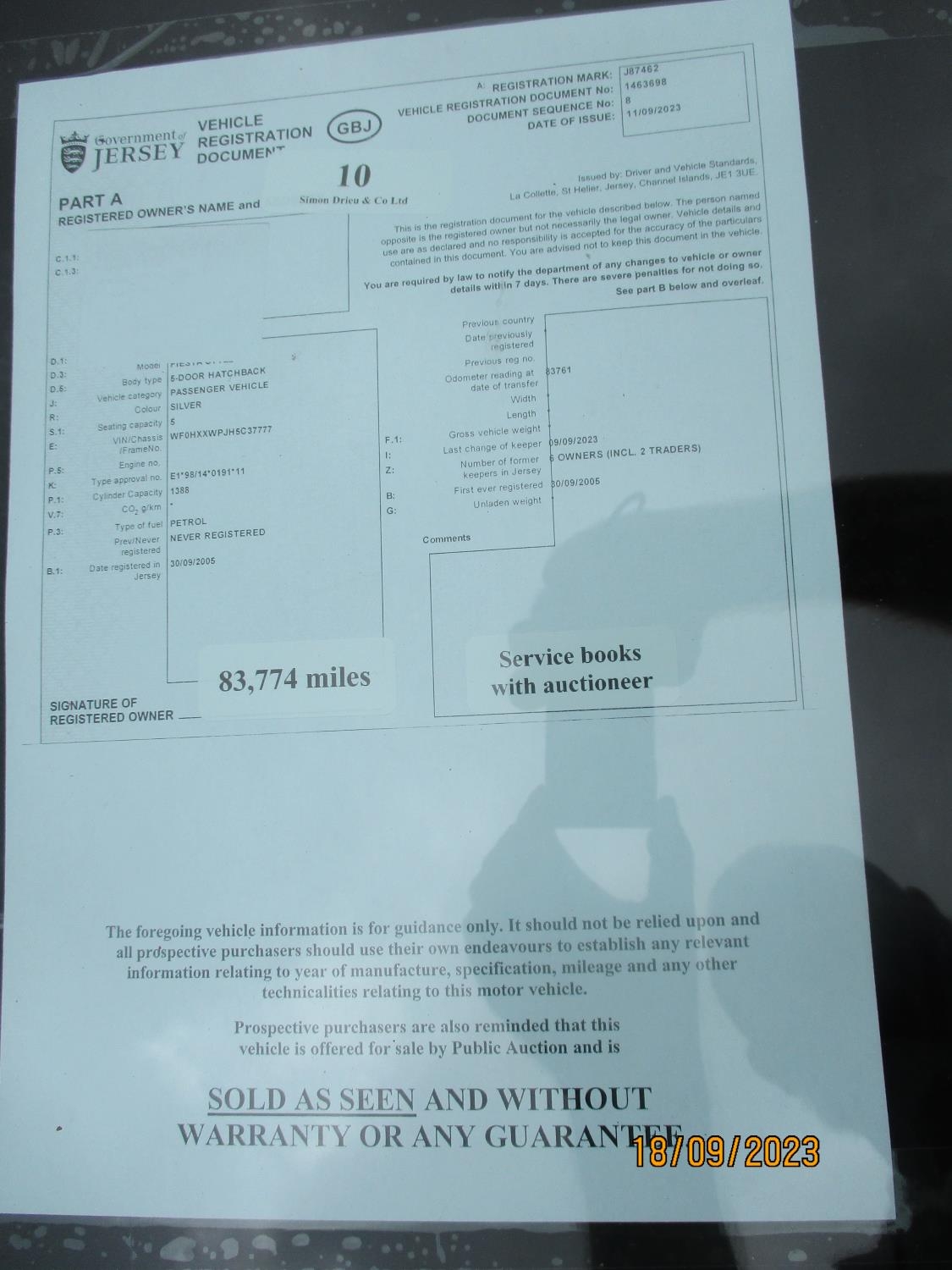 A 2005 Ford Fiesta Style 1.4 five door hatchback J87462 (petrol/manual), odometer reading 83,774 miles