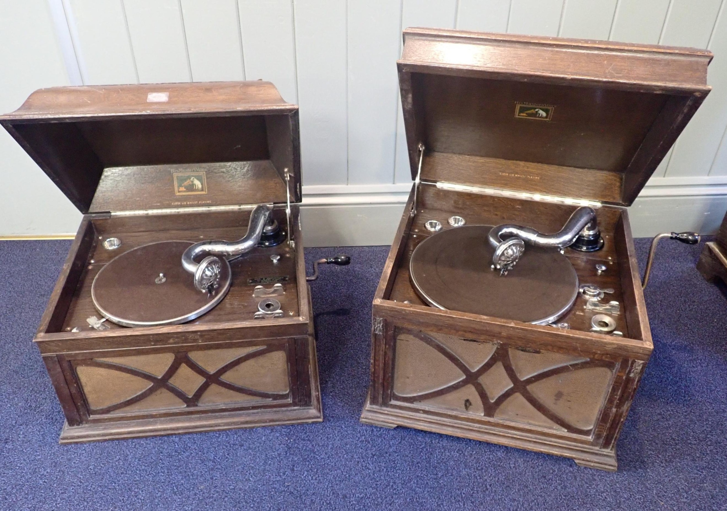 HMV MODEL 130 AND 104 GRAMOPHONESoak cased, both with 5A soundboxes (running, but cases scruffy) (2)
