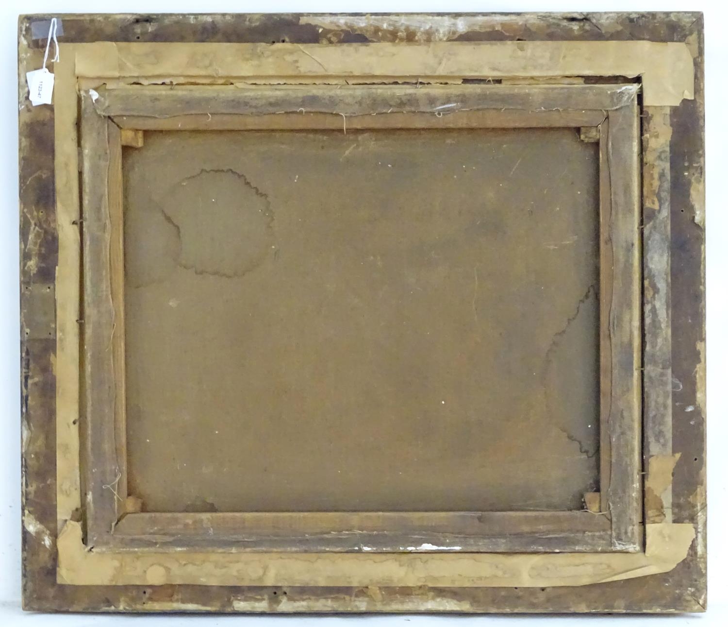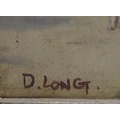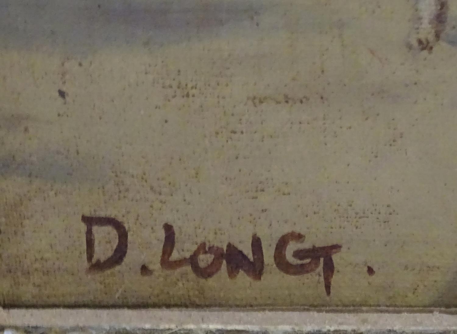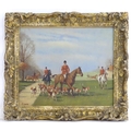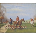 D. Long, XIX, English School, Oil on canvas, A country landscape with a pack of hounds / hunting dogs and gentlemen in hunting pinks on horseback before the hunt. Signed lower left. Approx. 19 1/2" x 23 1/2"