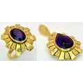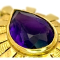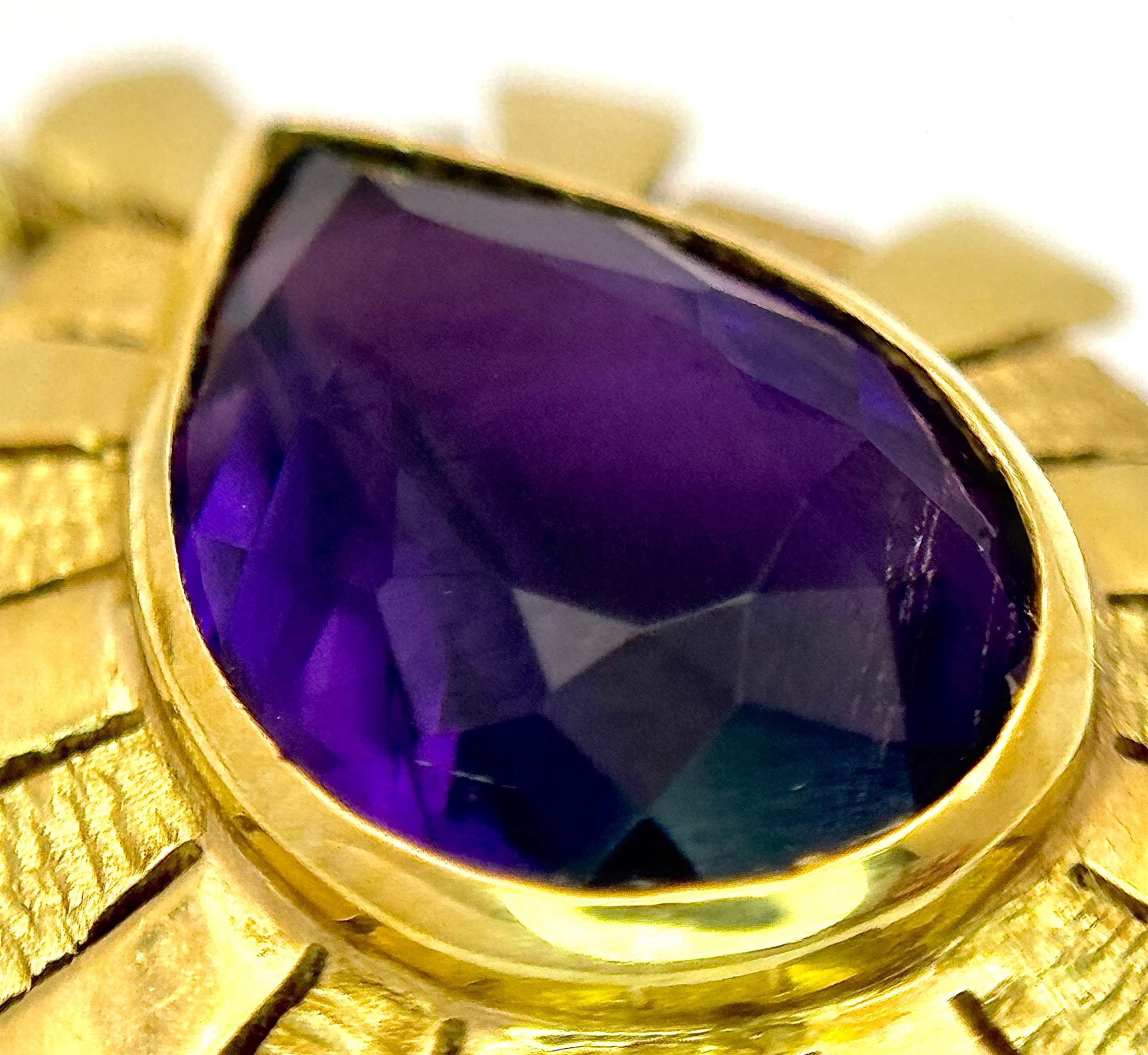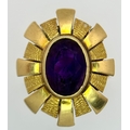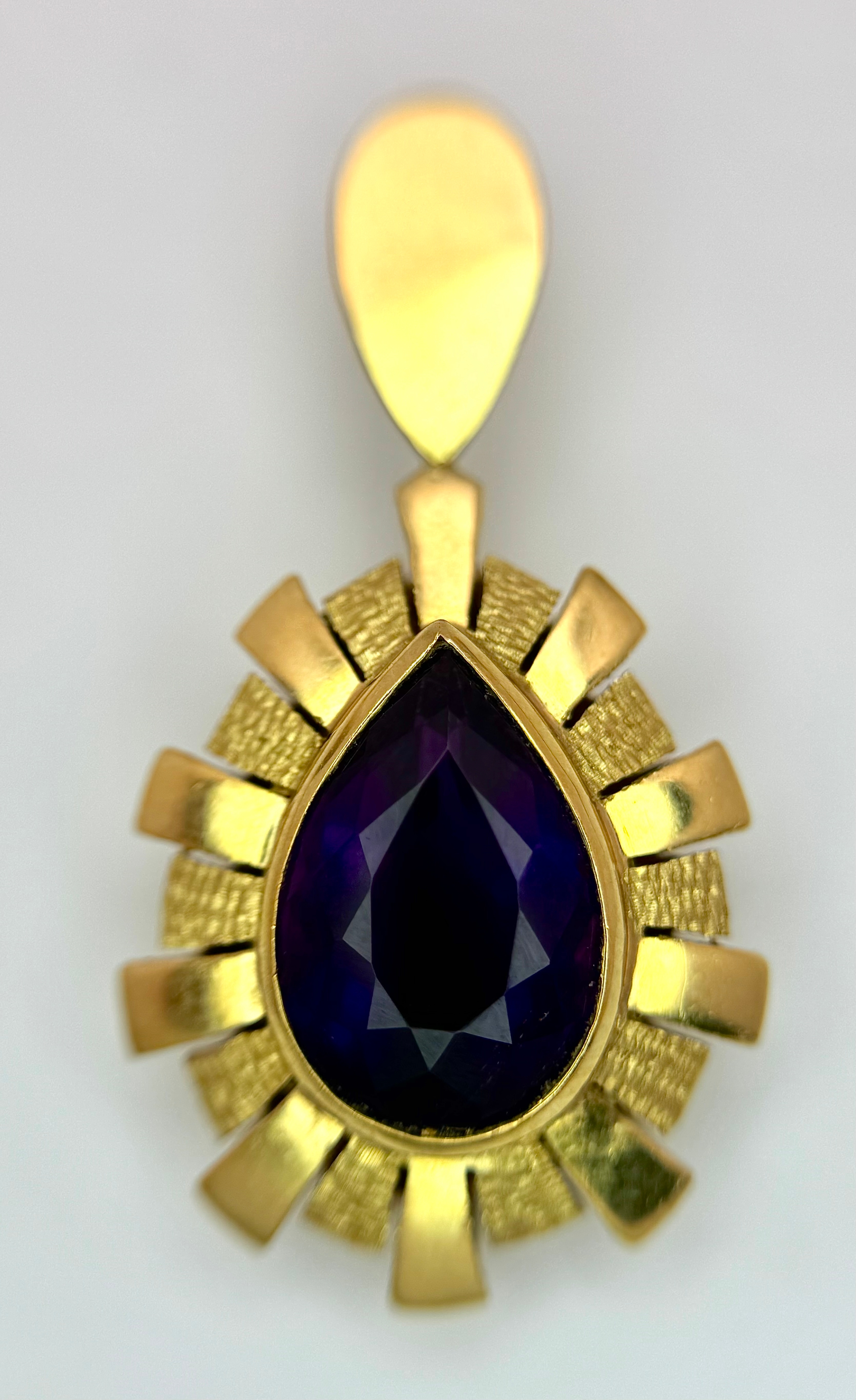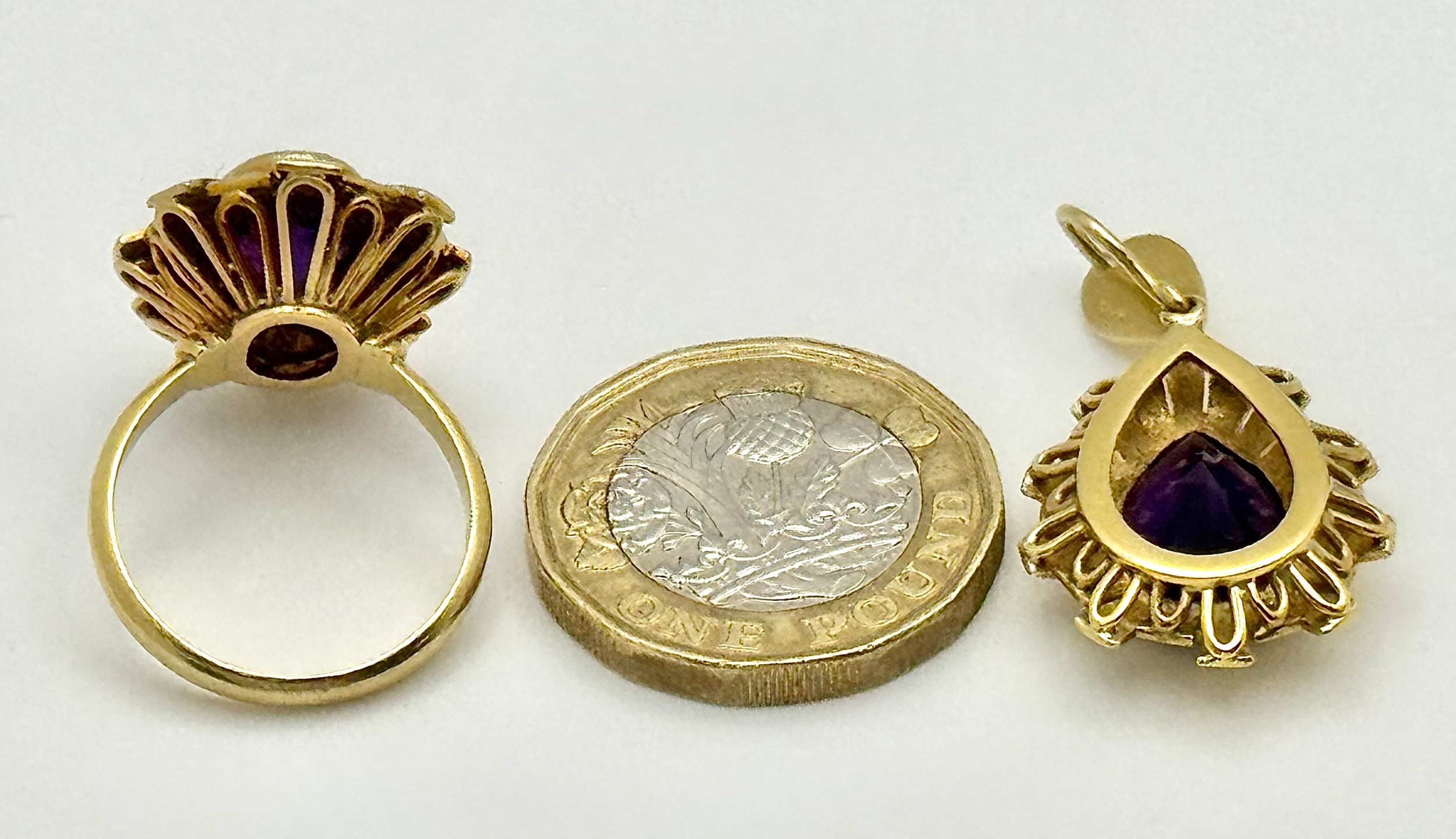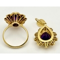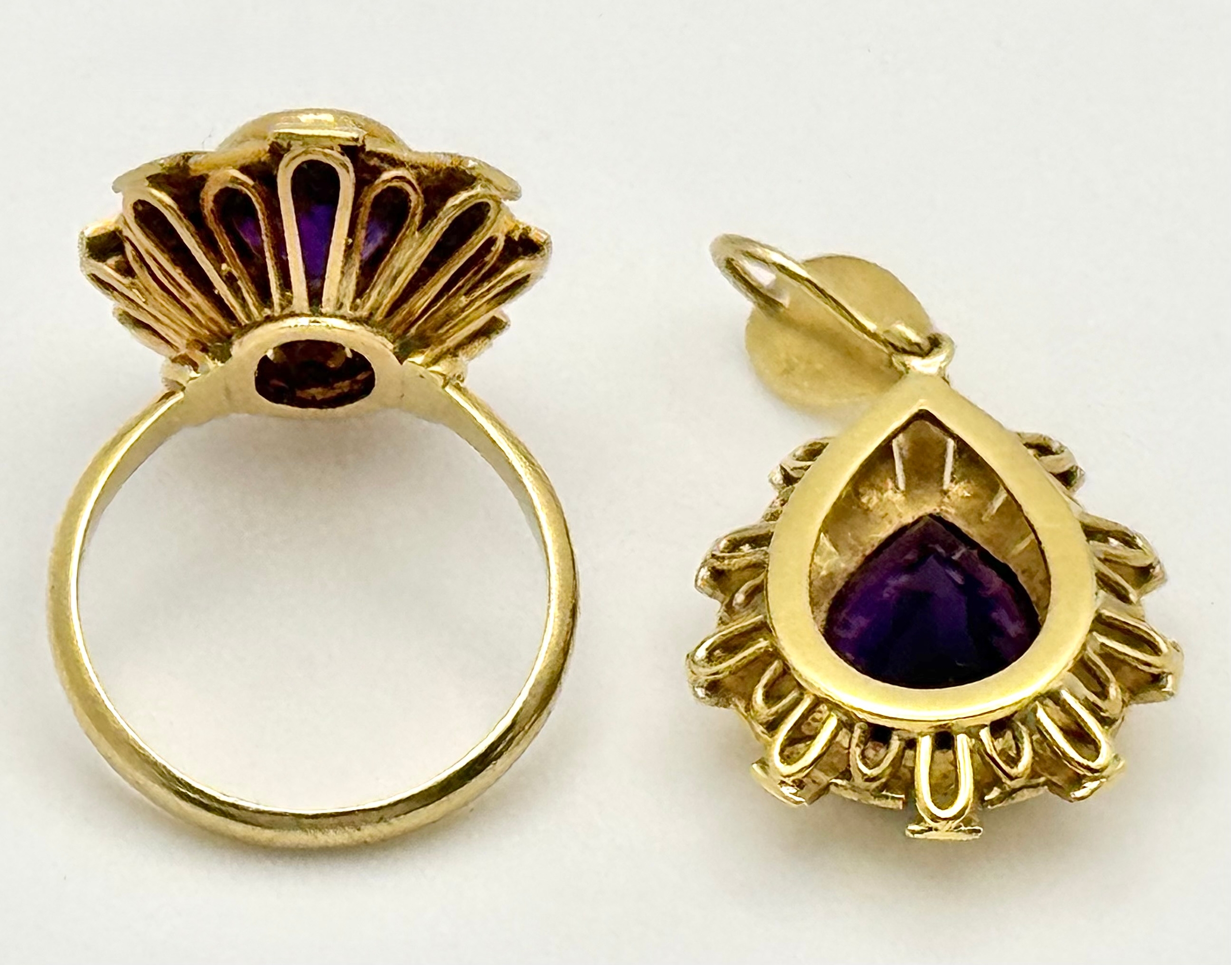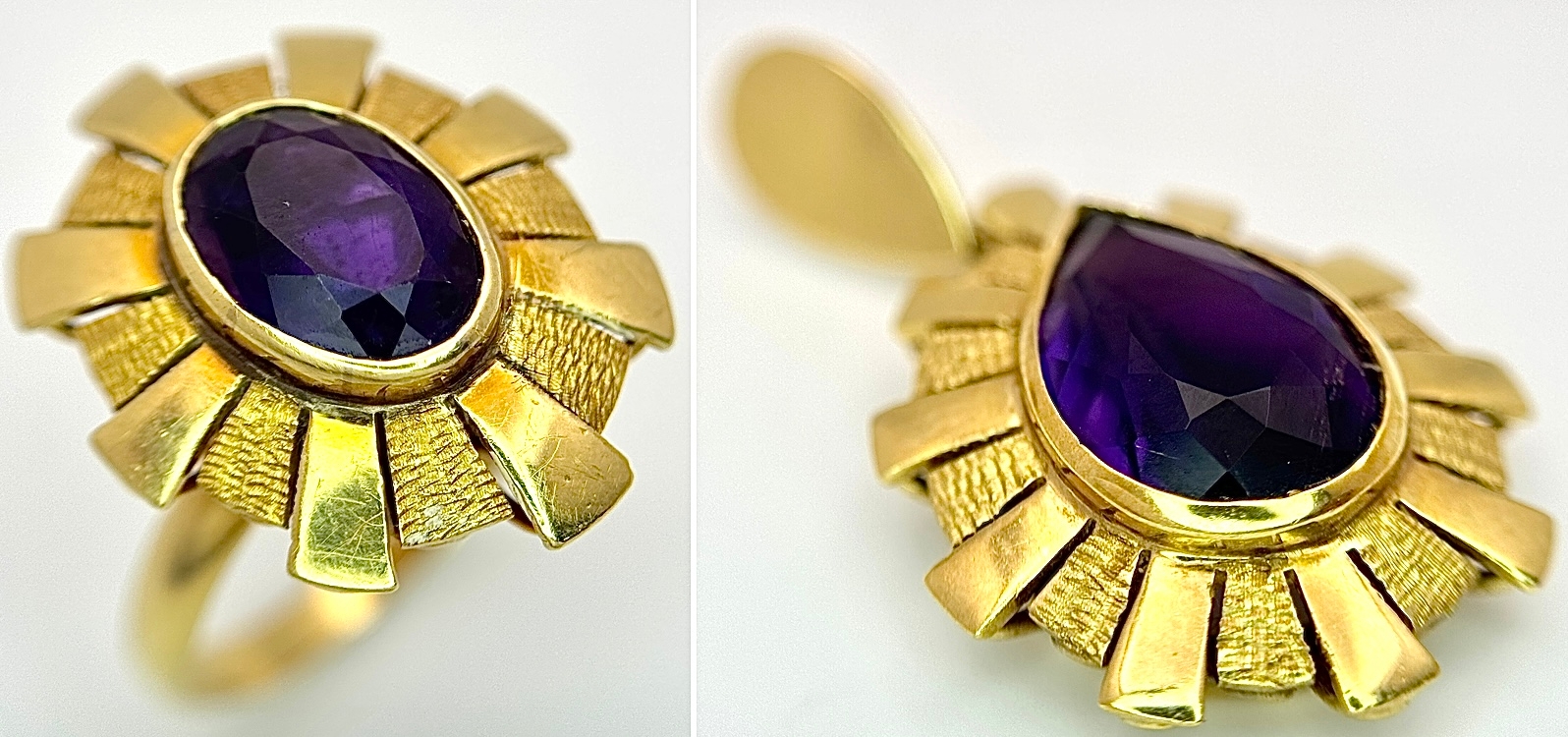 An 18K Yellow Gold, Amethyst Pendant and Ring Set. An oval and pear cut centre stone - 4ctw set in a starburst setting. Pendant - 3.2cm. Ring - size M 1/2. 11.3g total weight.