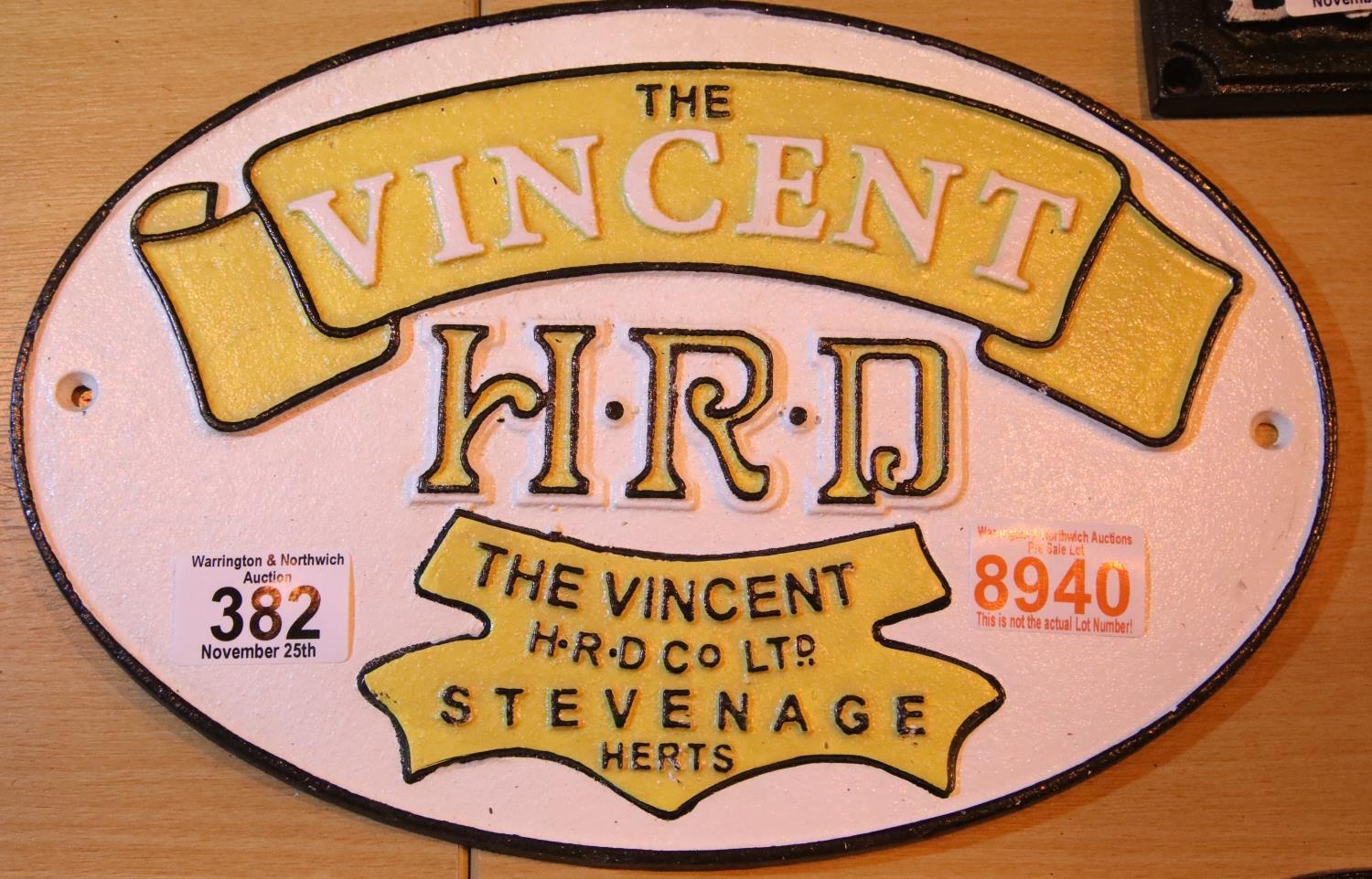 Cast iron The Vincent HRD sign, 30 x 20 cm. P&P Group 1 (£14+VAT for the first lot and £1+VAT for subsequent lots)
