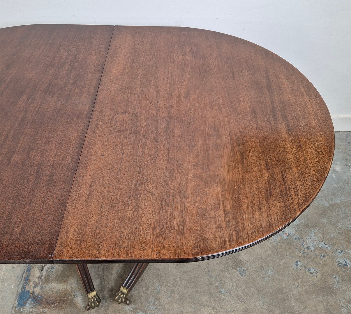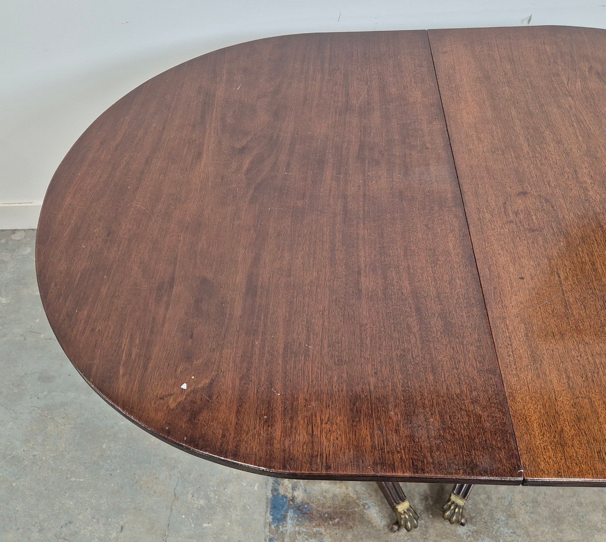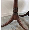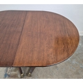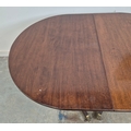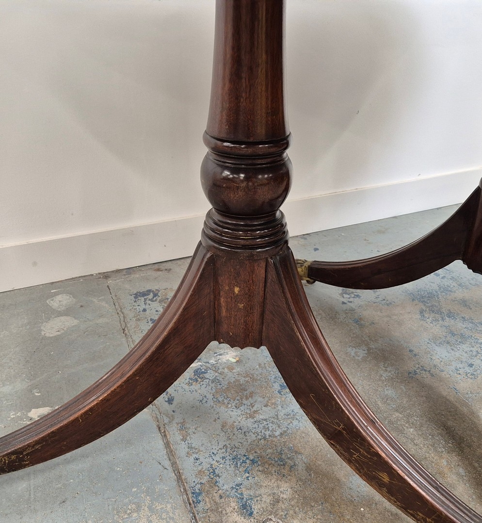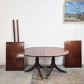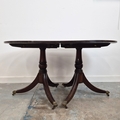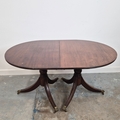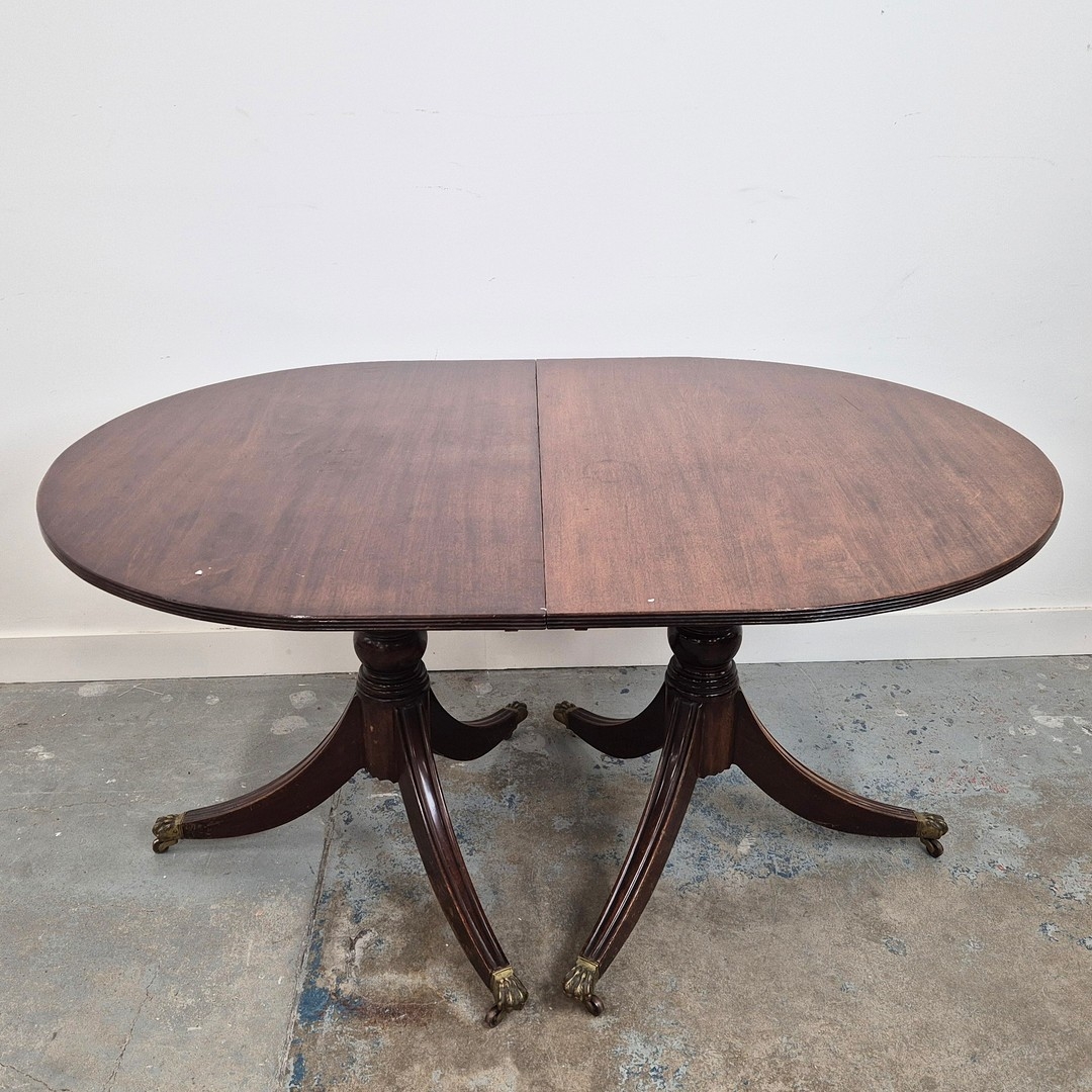 DINING TABLE, REGENCY STYLE. mahogany, with two pedestals each with tripod supports, with two leaves, approx. 260cm long extended x 99cm d.