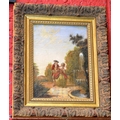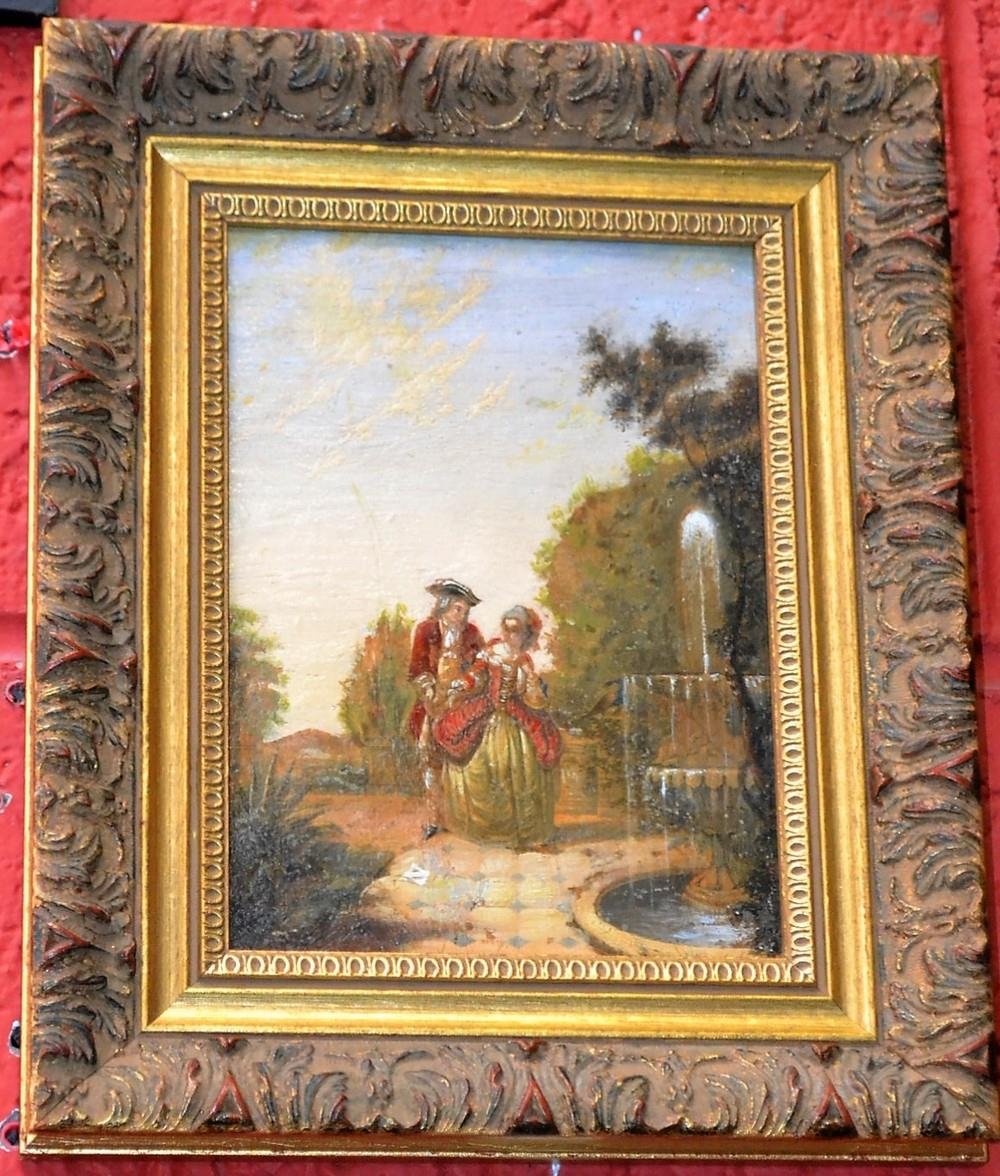English School (19th century) Courting Couple Beside a Fountain unsigned, oil overpainted on panel, gilt frame, c.1880