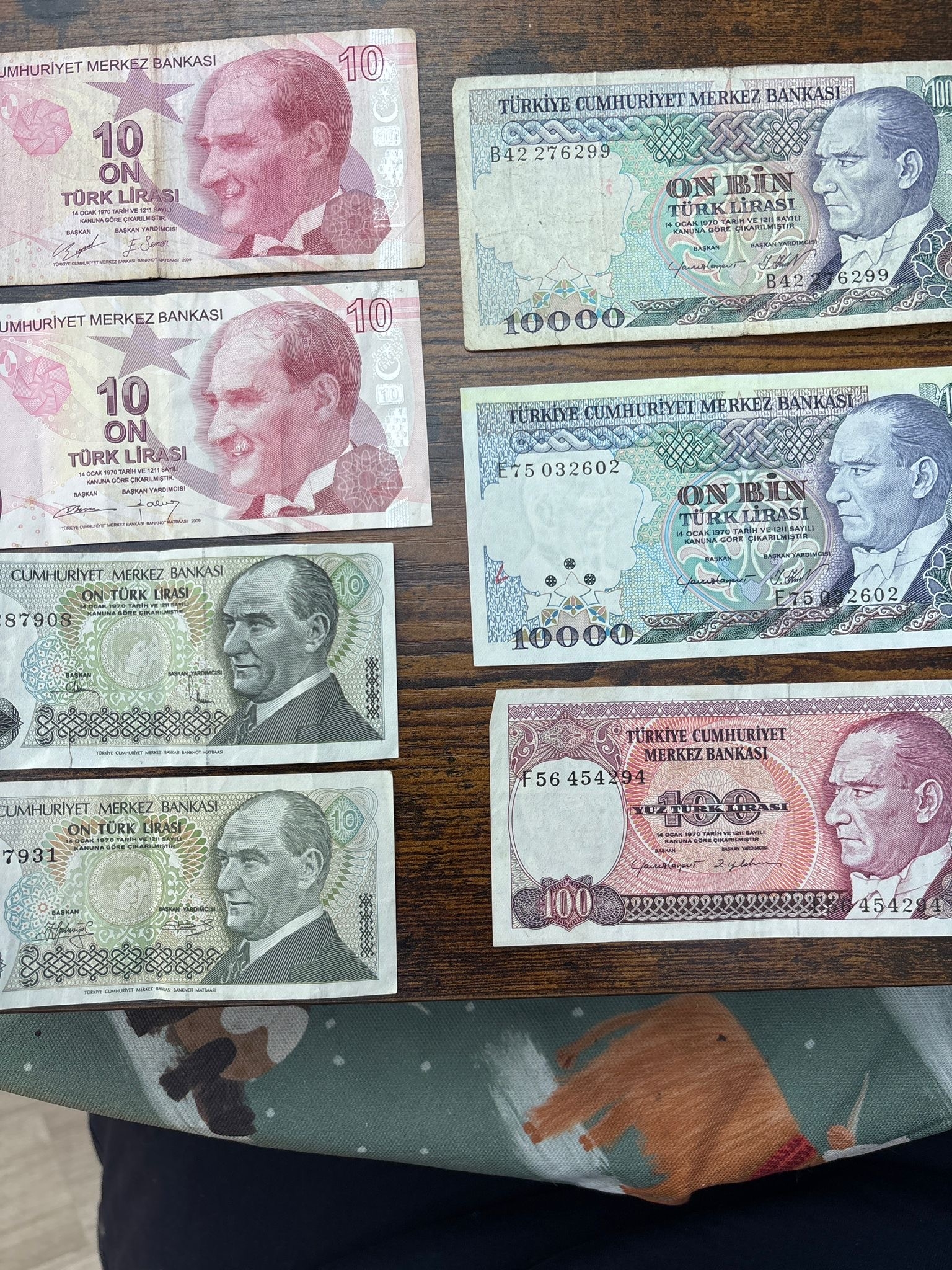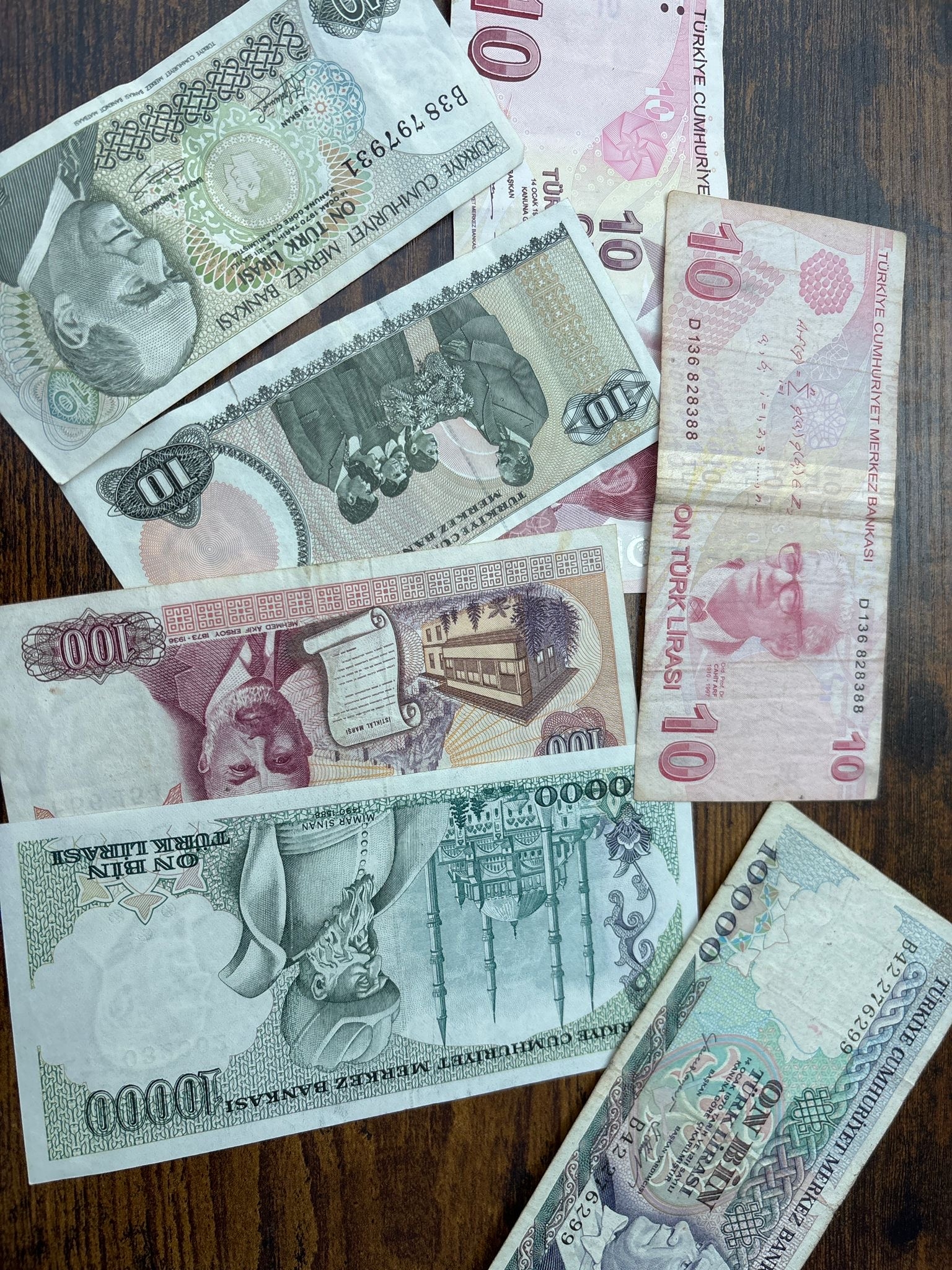Turkey Banknote Collection – 7 Notes (Mixed Denominations, Atatürk Series) A varied group of seven Turkish banknotes featuring Mustafa Kemal Atatürk, including multiple 10 Lira notes, 100 Lira, and high-denomination 10,000 Lira issues. A good mix of older pre-revaluation notes alongside more modern designs, showing the transition of Turkish currency over time.
