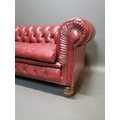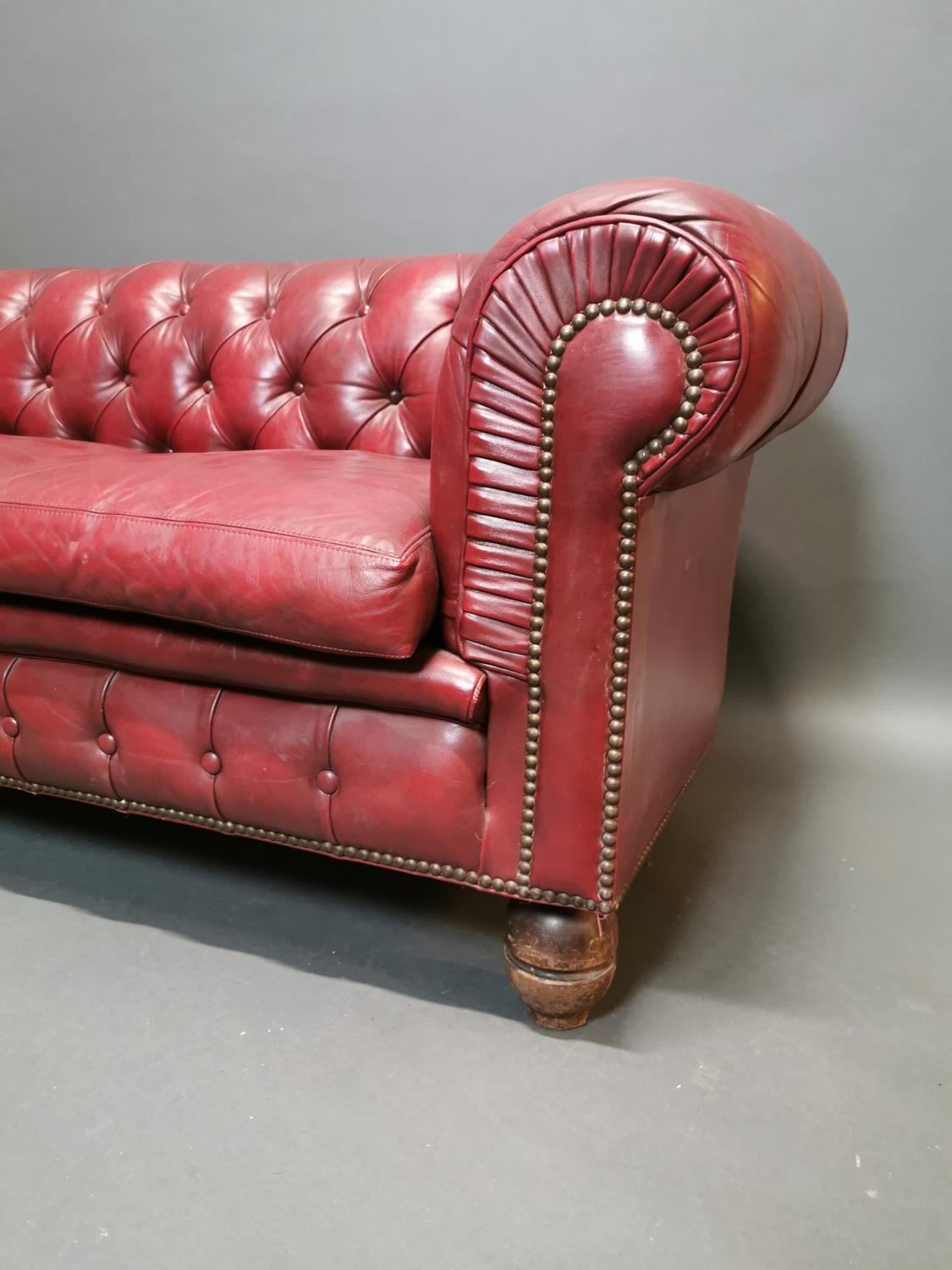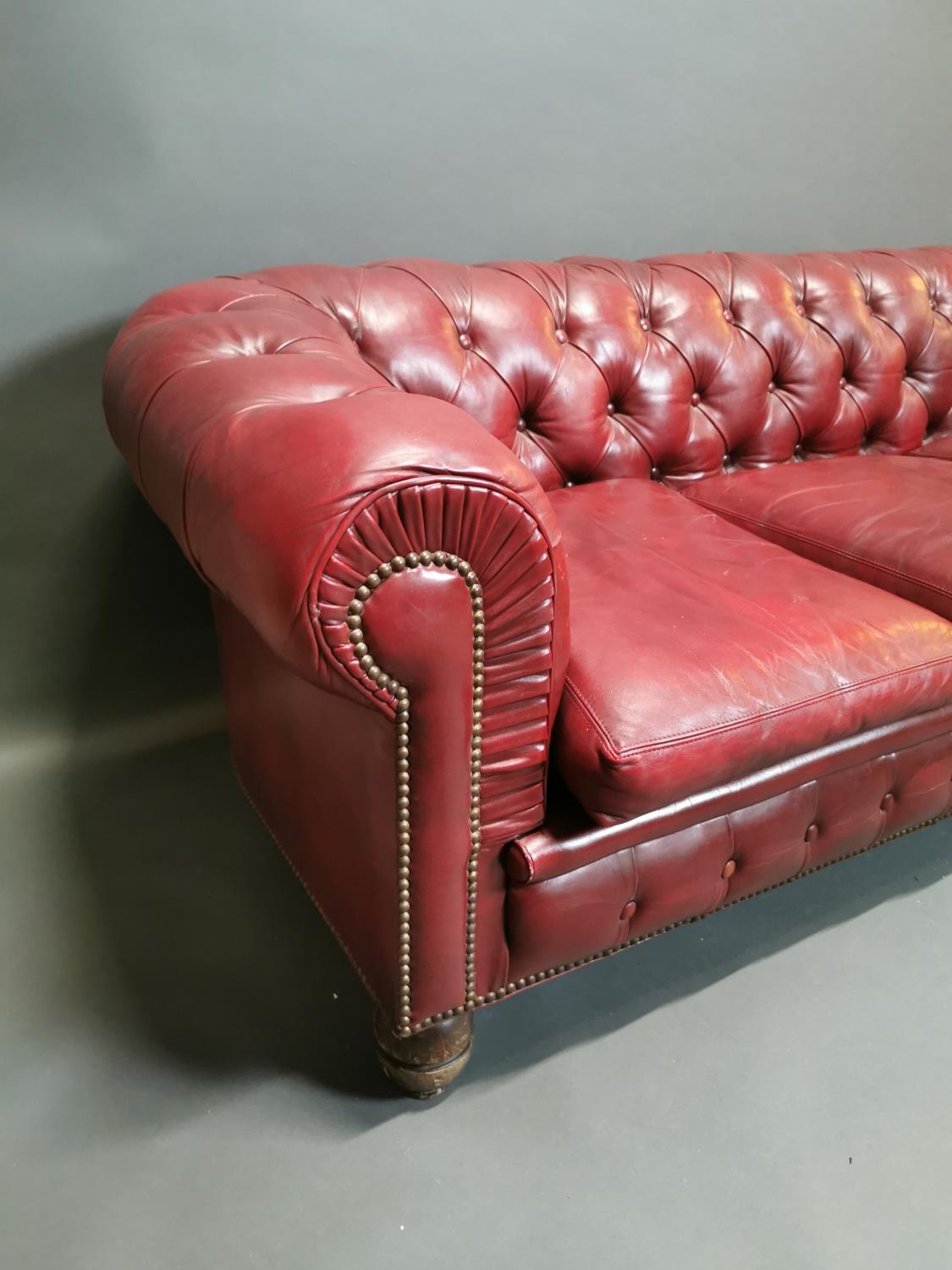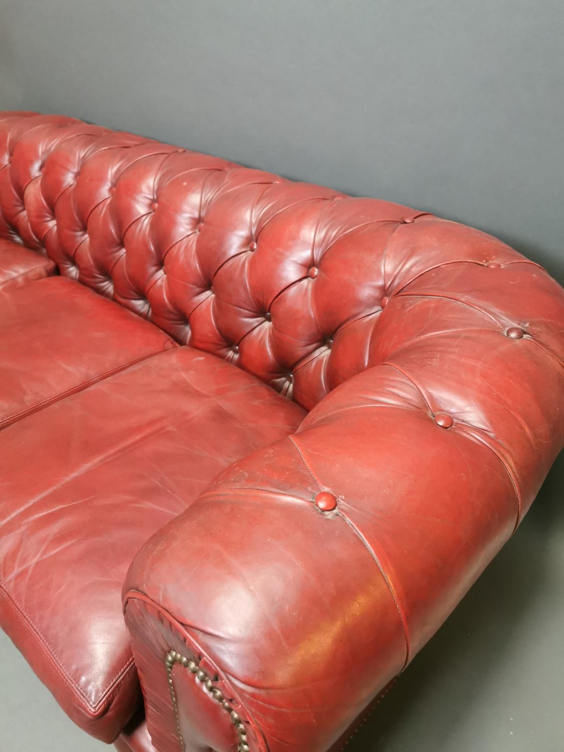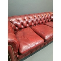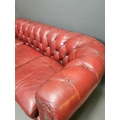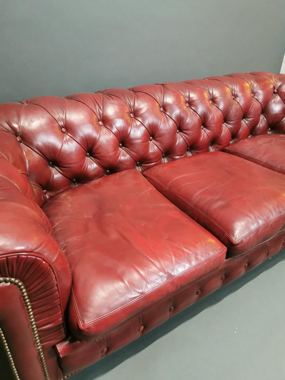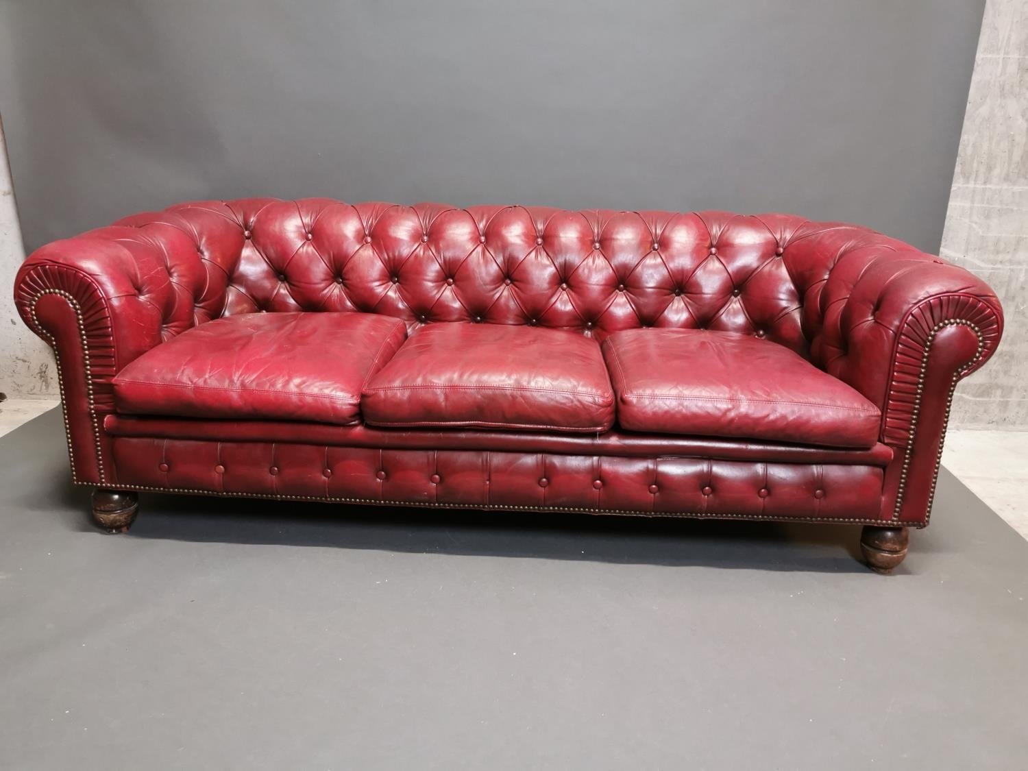 Good quality hand died leather ox blood deep buttoned three seater Chesterfield sofa on turned legs {66 cm H x 195 cm W x 82 cm D}.