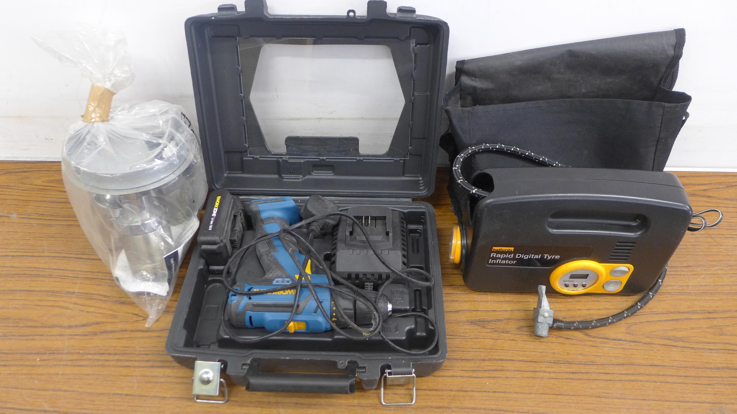 A Workzone 16V cordless drill, a Halfords rapid digital tyre...