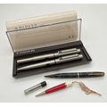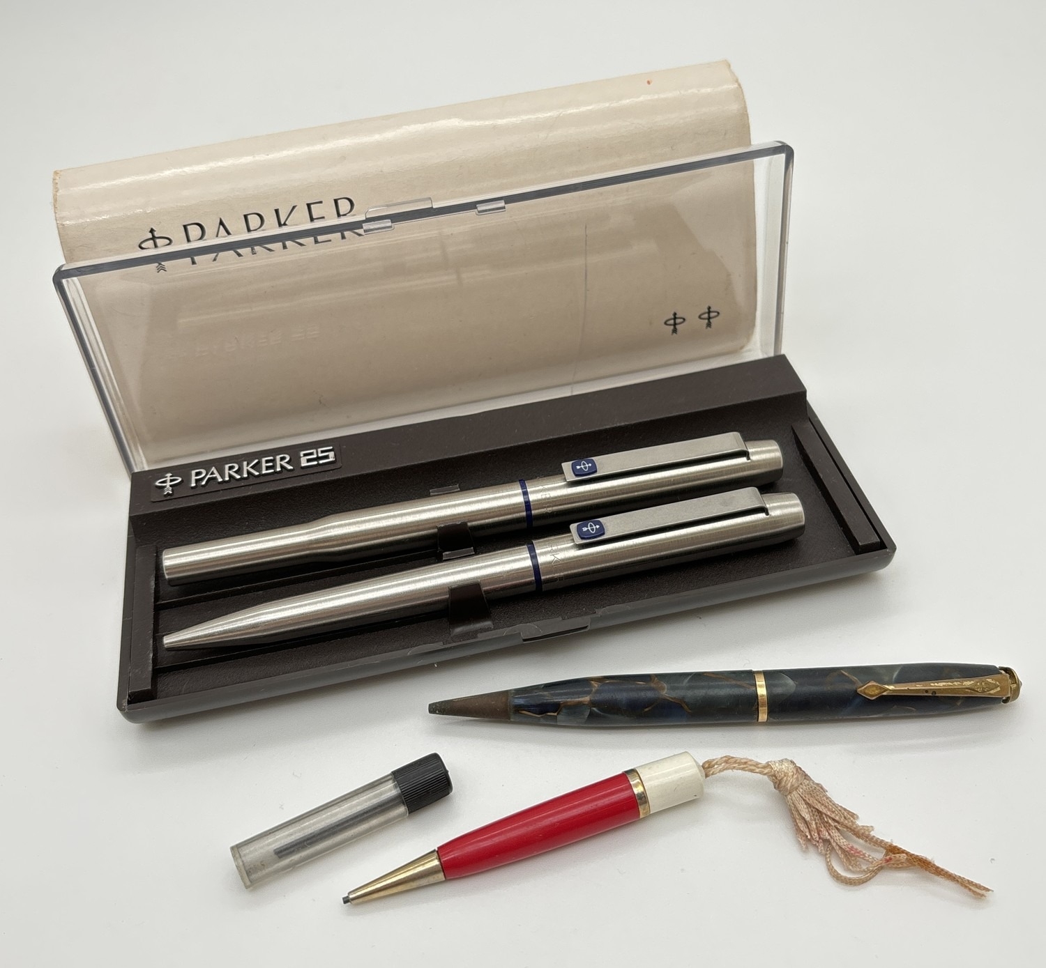 A vintage 1980's Parker 25 pen set together with a vintage Conway Stuart No.25 mechanical pencil & one other. Parker stainless steel fountain & ballpoint pen set with blue trim, in original plastic case with card sleeve. Conway Stewart blue marble pencil comes with a small case with leads.