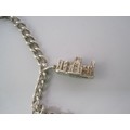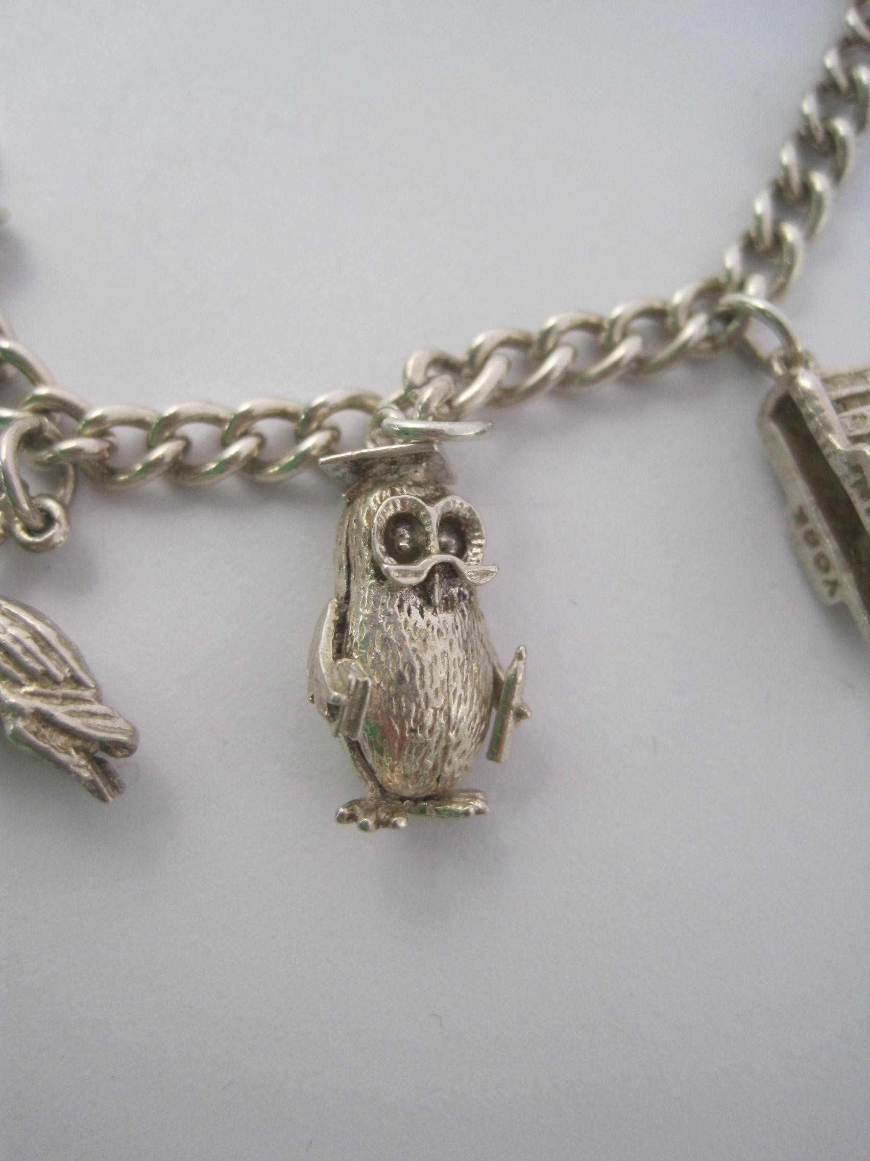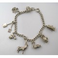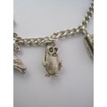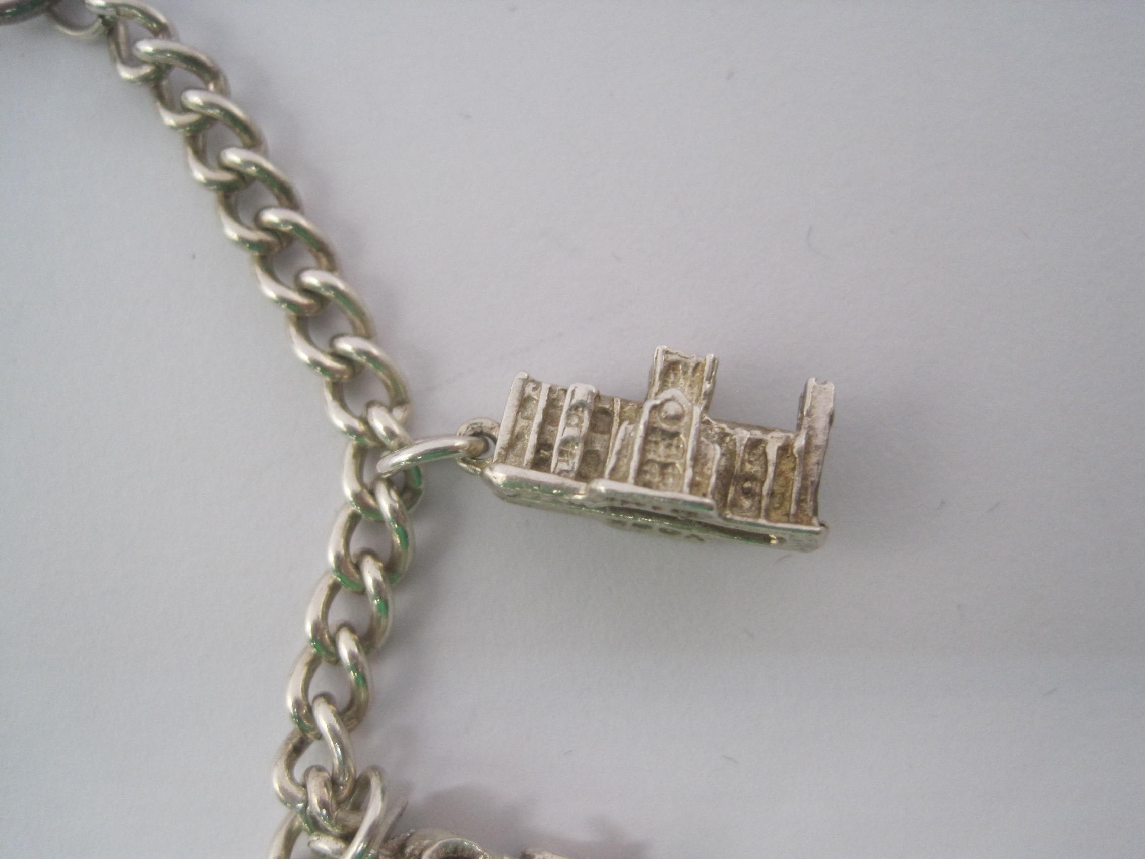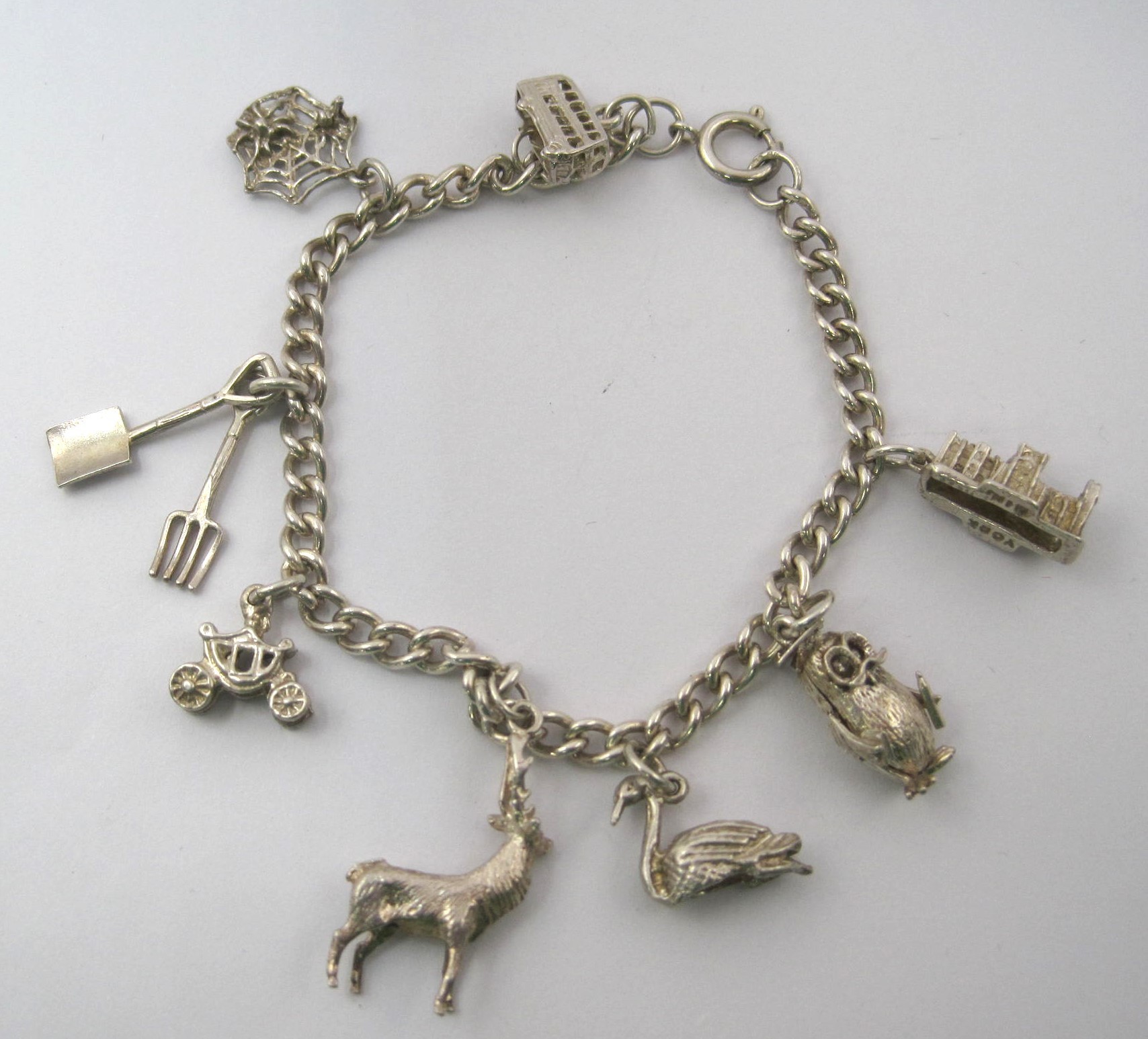 A white metal charm bracelet, clasp stamped sterling, with eight white metal charms - York Minster, articulated owl scholar, swan, deer, Royal coach, spade and fork, spiders web, and London bus. Combined gross weight approx. 23.5g