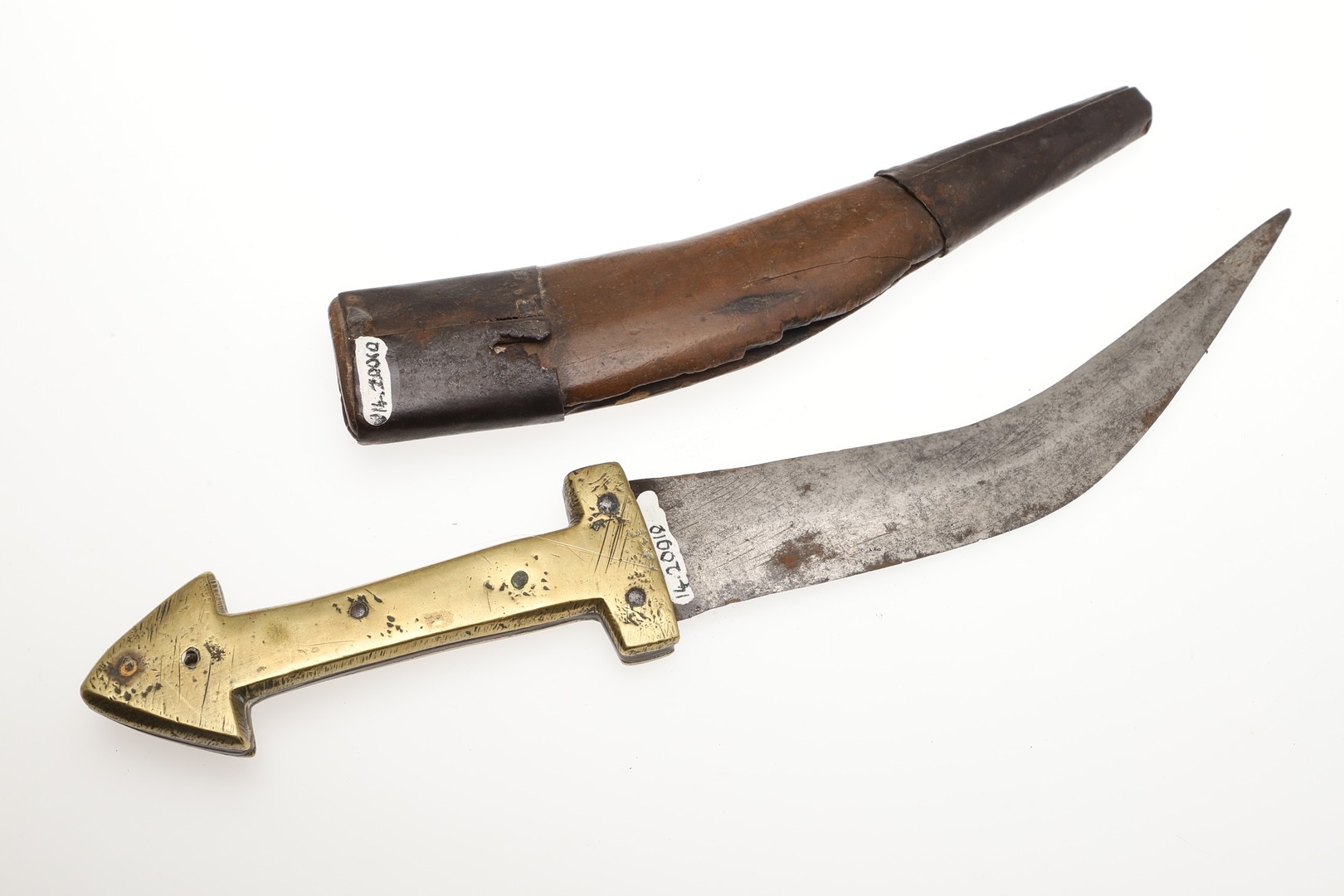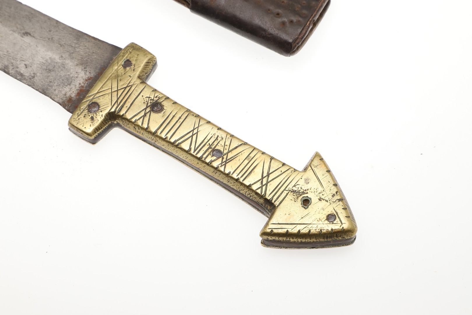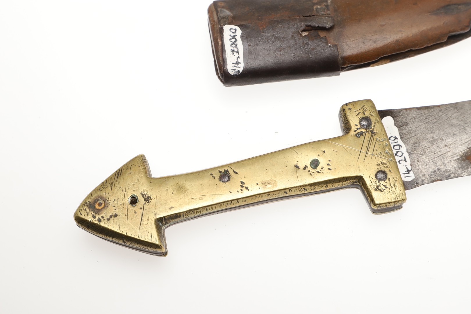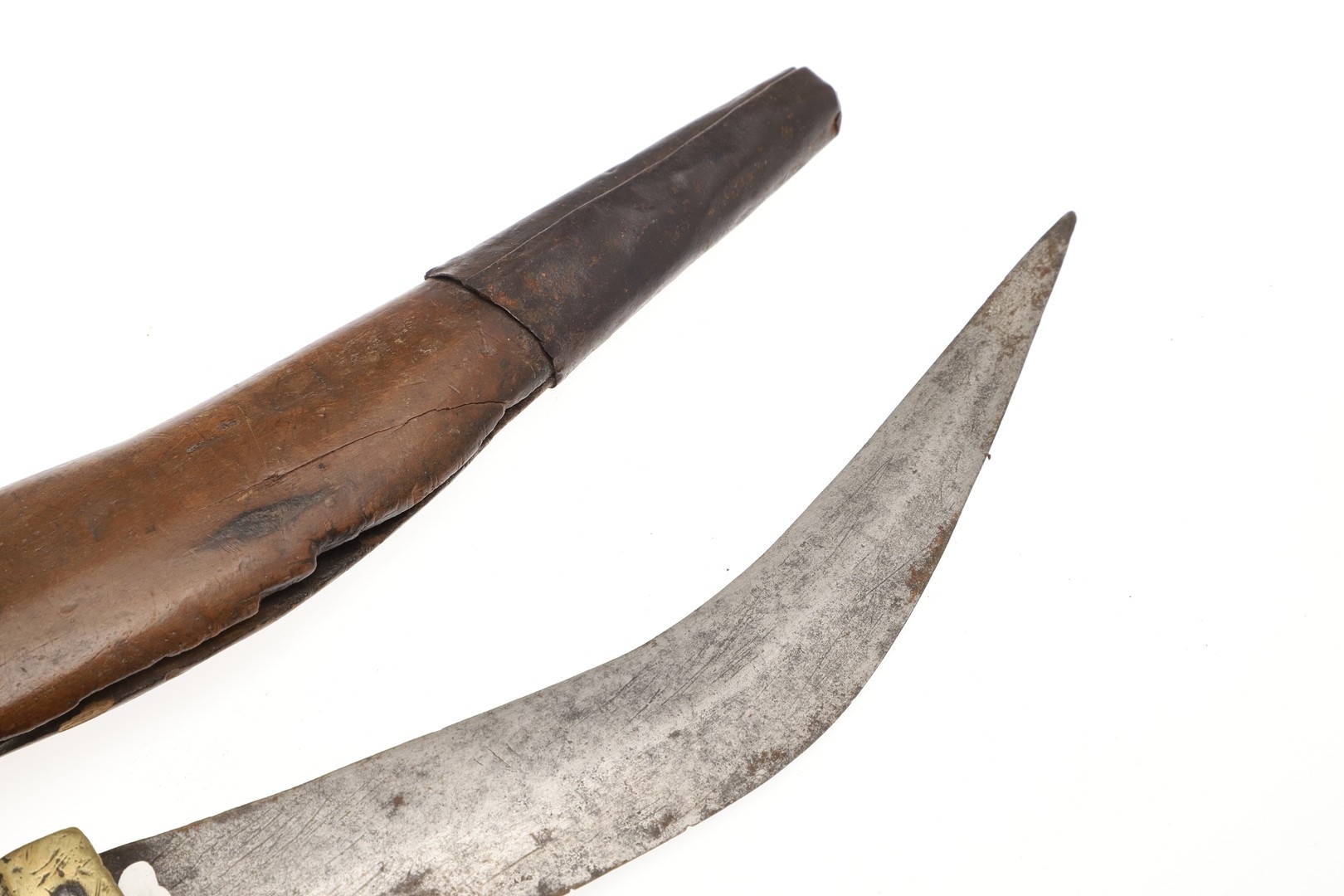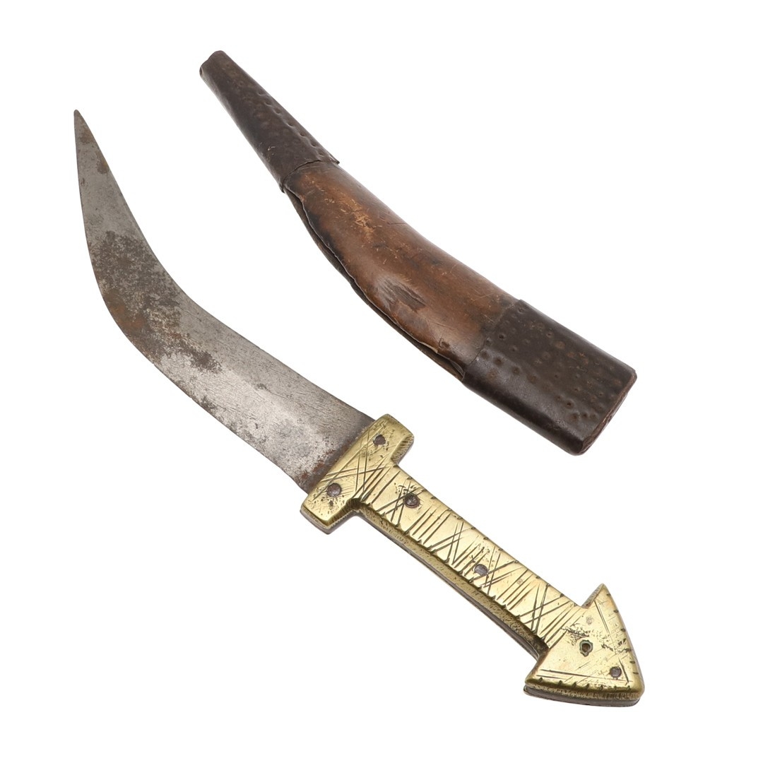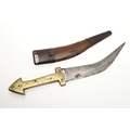A NORTH AFRICAN JAMBIYYA AND LEATHER SCABBARD. The 17 cm curved, pointed blade with central spine, the brass mounted hilt with triangular pommel. In a crudely decorated scabbard. Possibly North African. 33 cm.