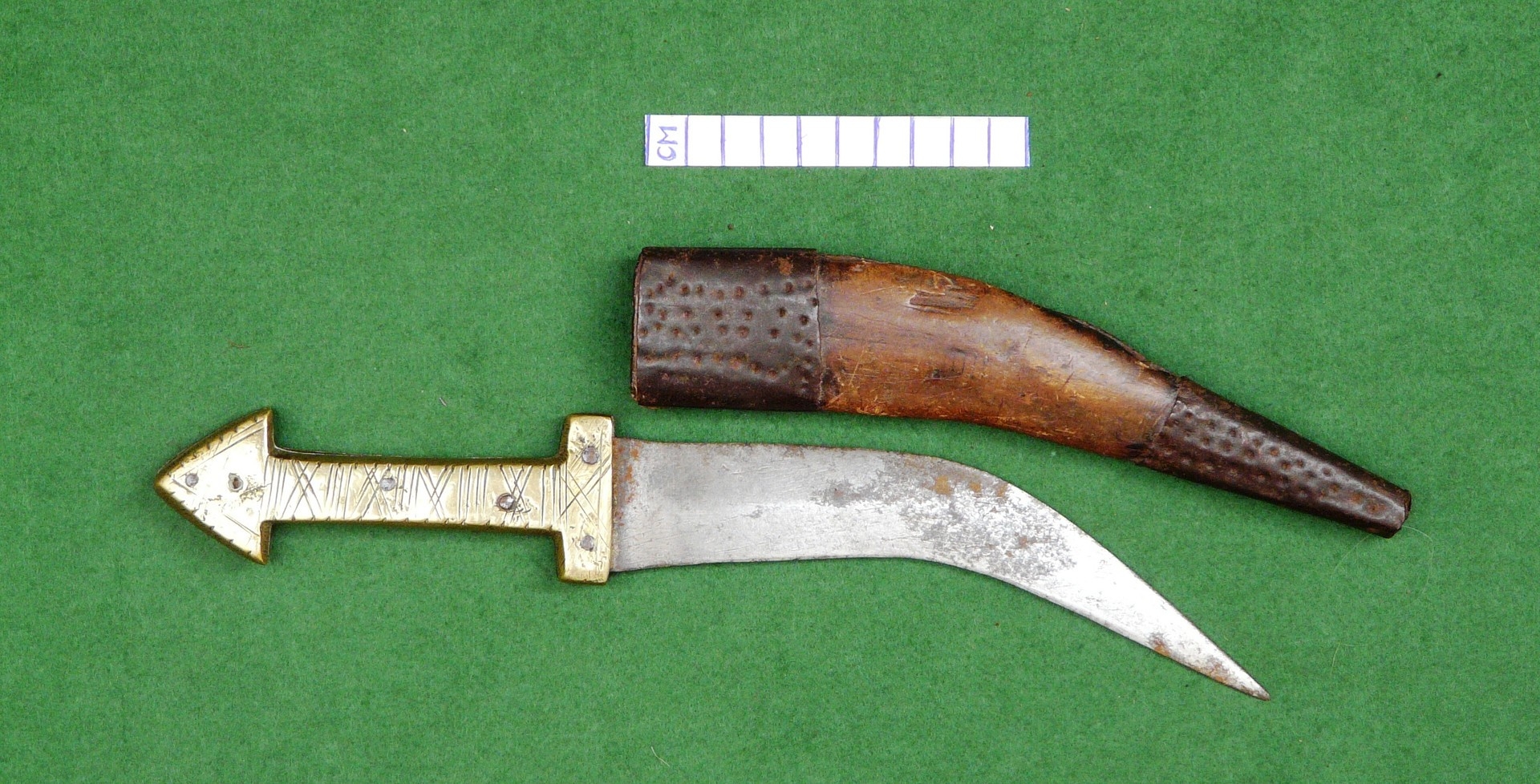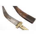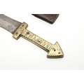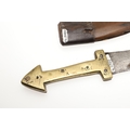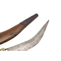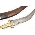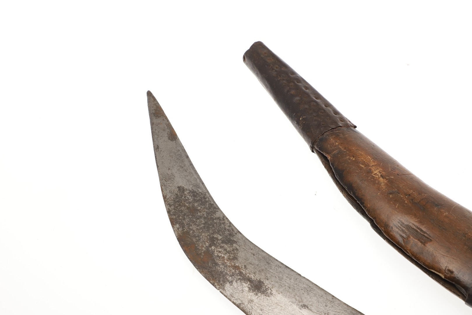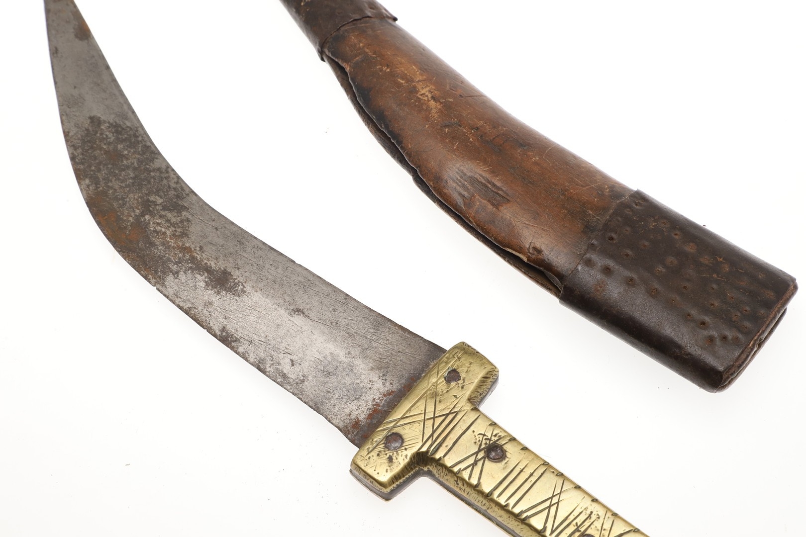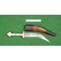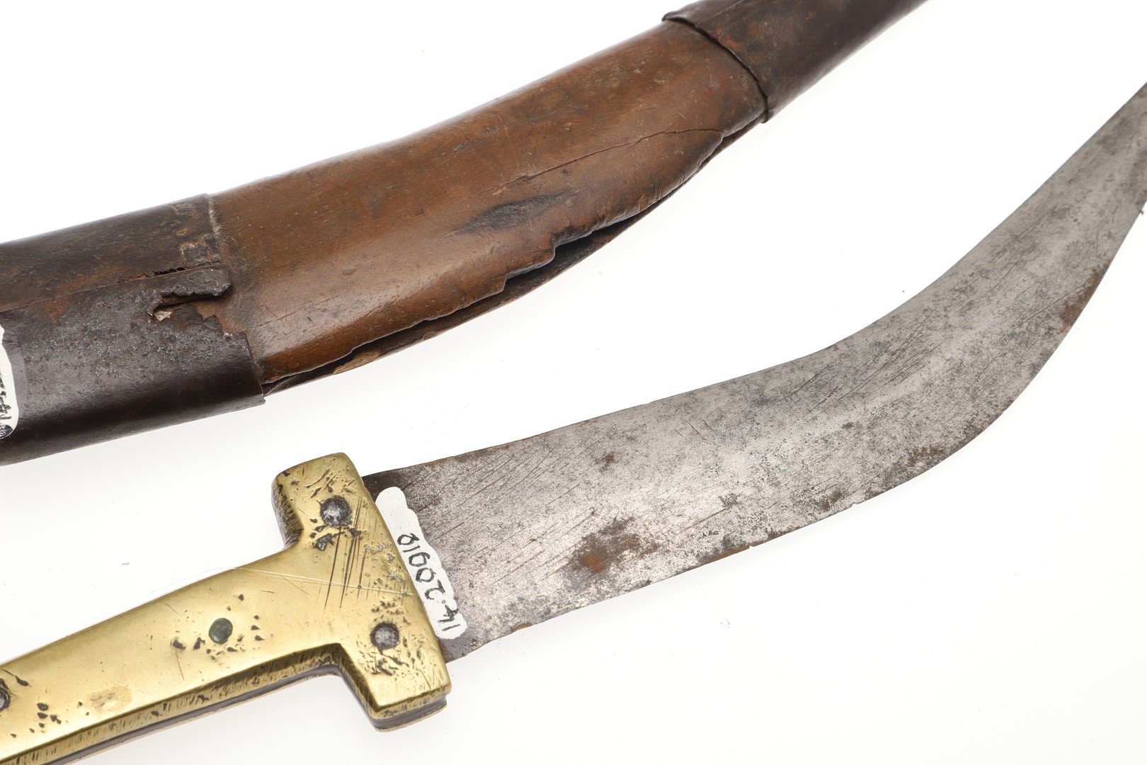 A NORTH AFRICAN JAMBIYYA AND LEATHER SCABBARD. The 17 cm curved, pointed blade with central spine, the brass mounted hilt with triangular pommel. In a crudely decorated scabbard. Possibly North African. 33 cm.