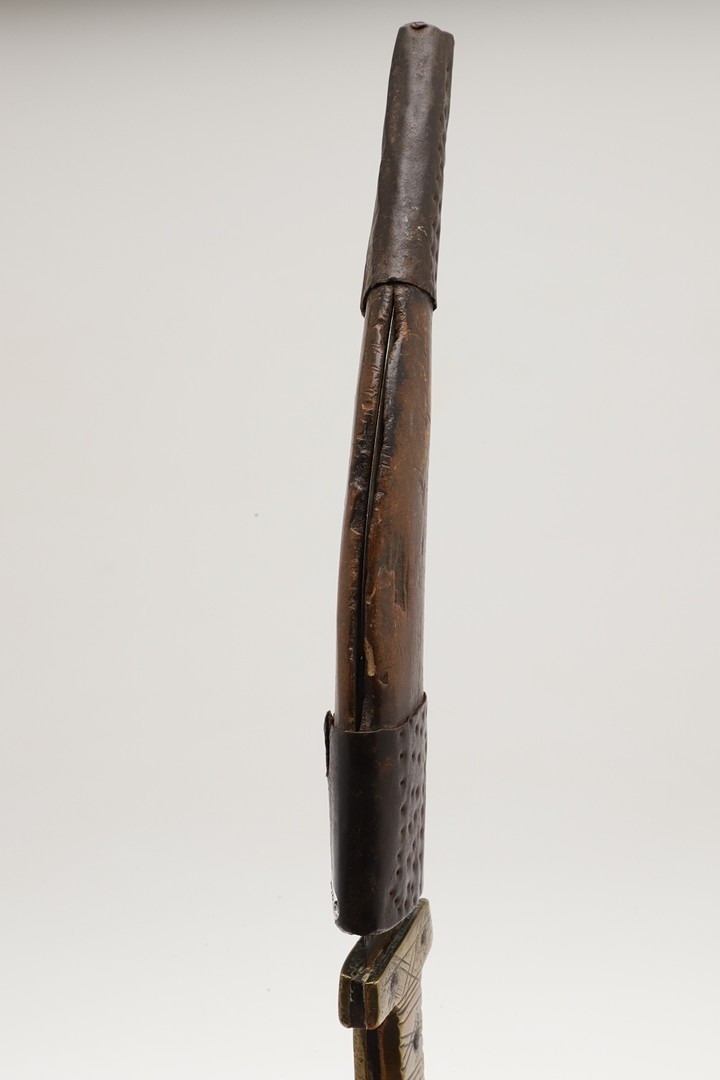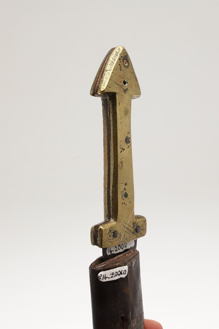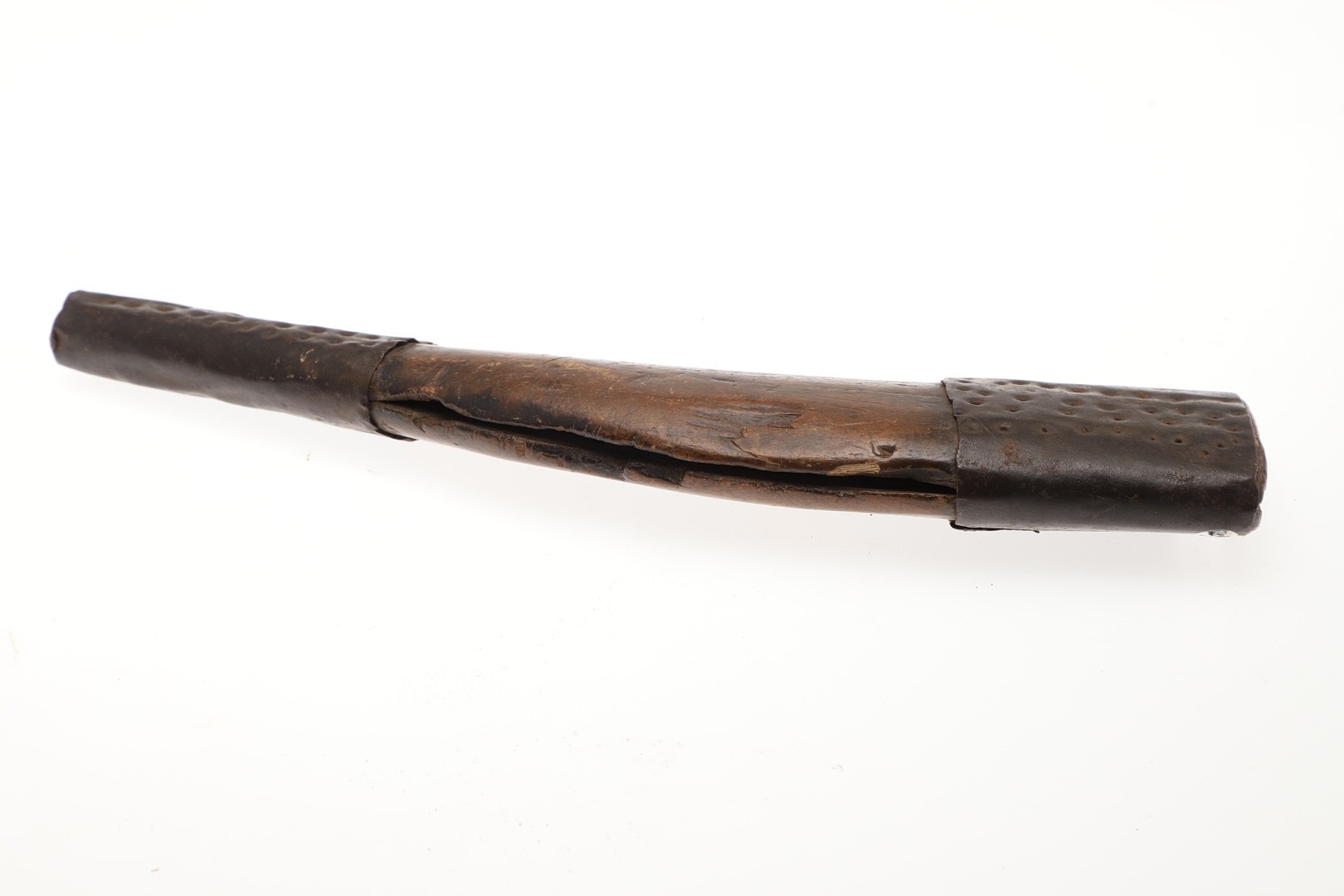 Split to scabbard, wear and marking to surfaces. Collection number to both parts.