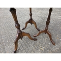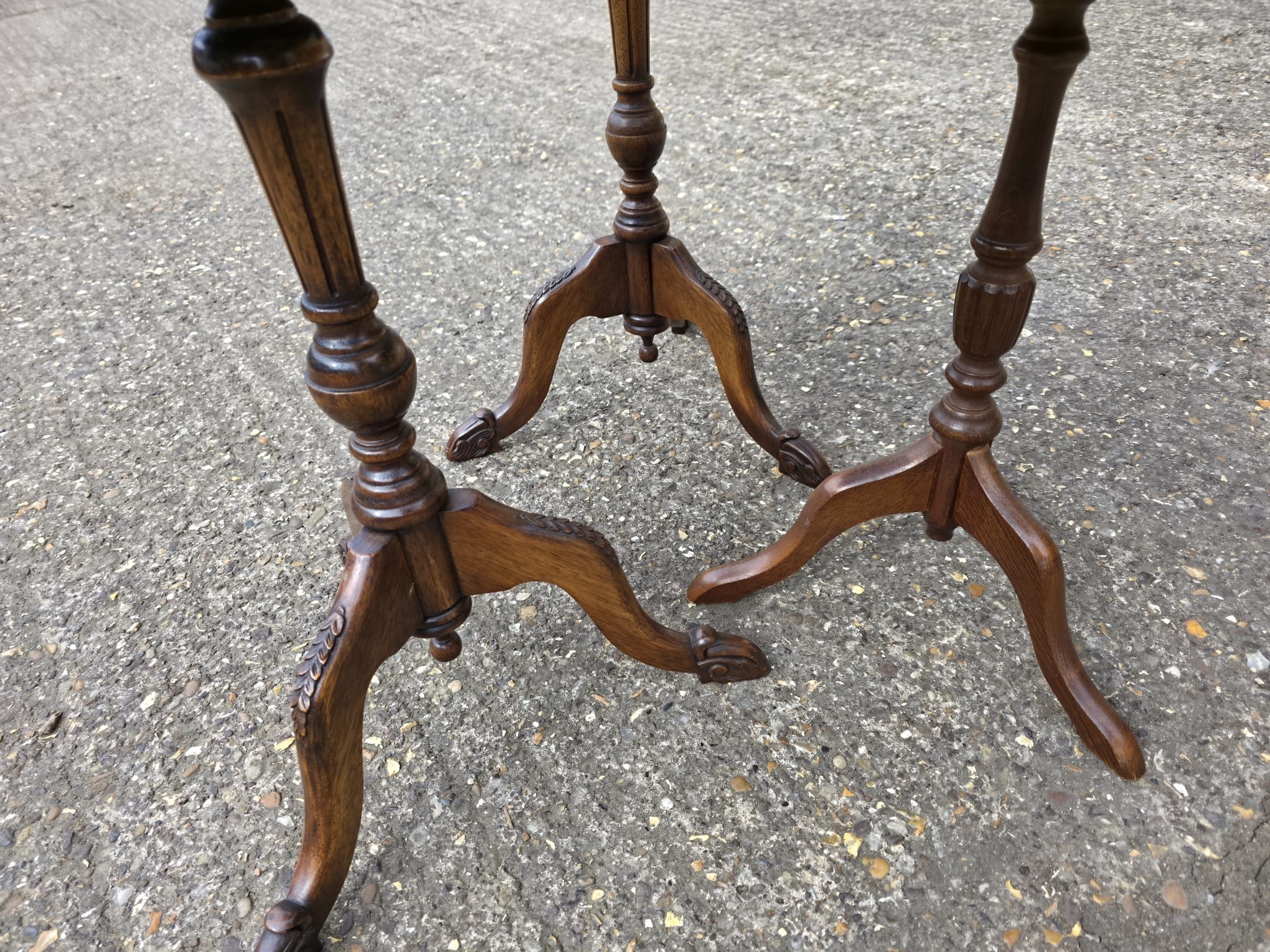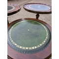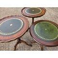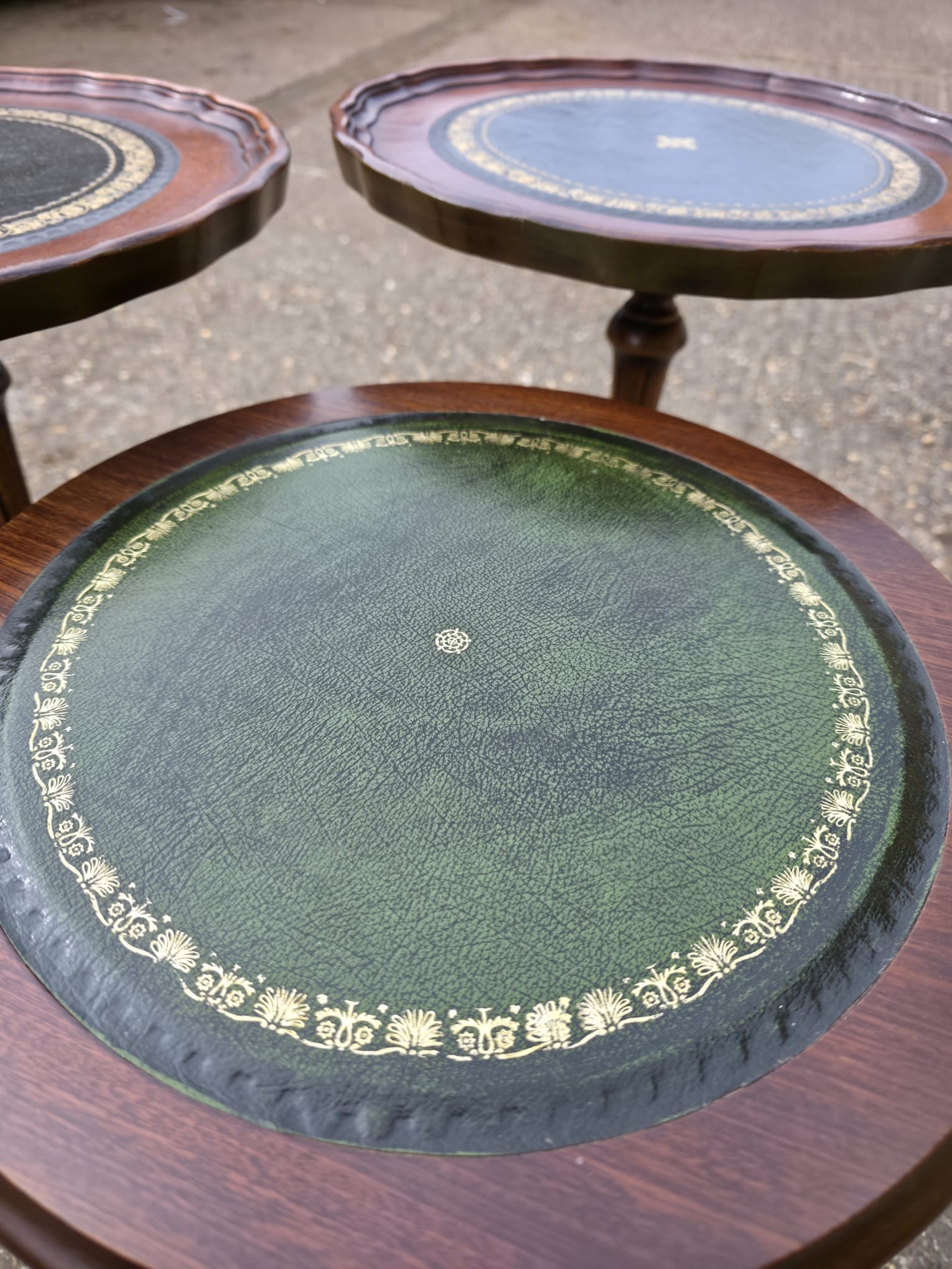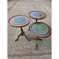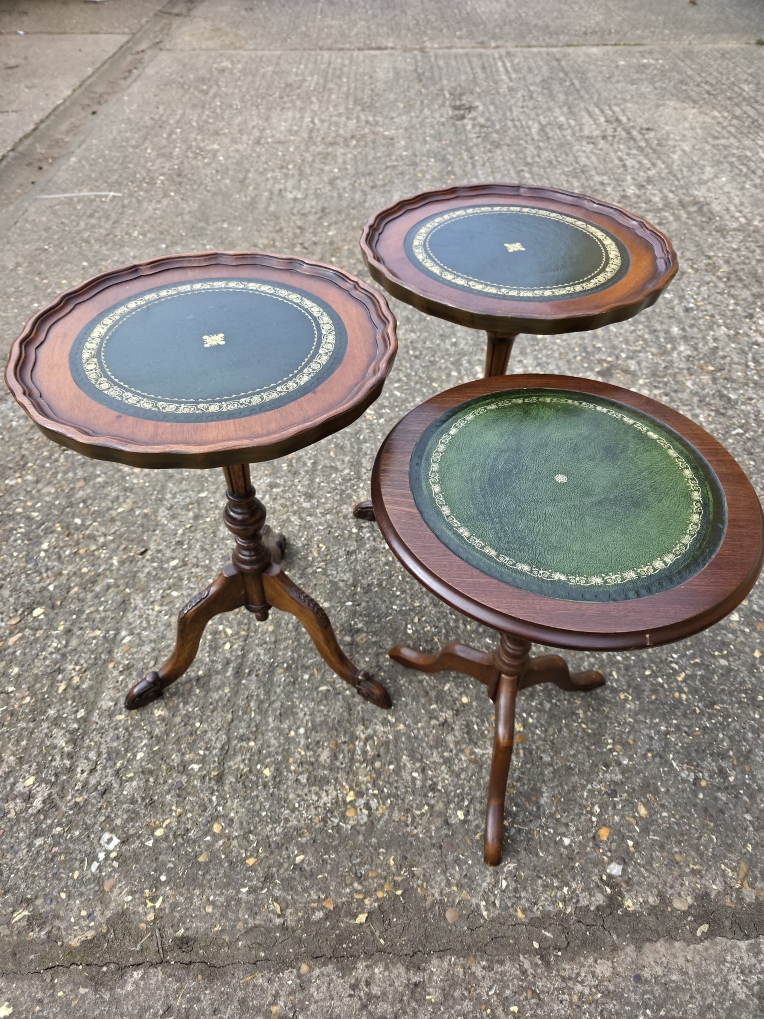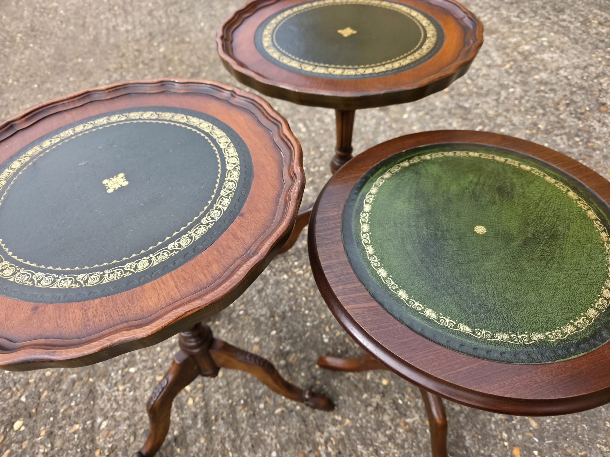Set of three mahogany occasional/wine tables, two matching with scalloped edges and inset leather tops, the third of similar form with green leather top. All raised on turned supports with tripod bases.