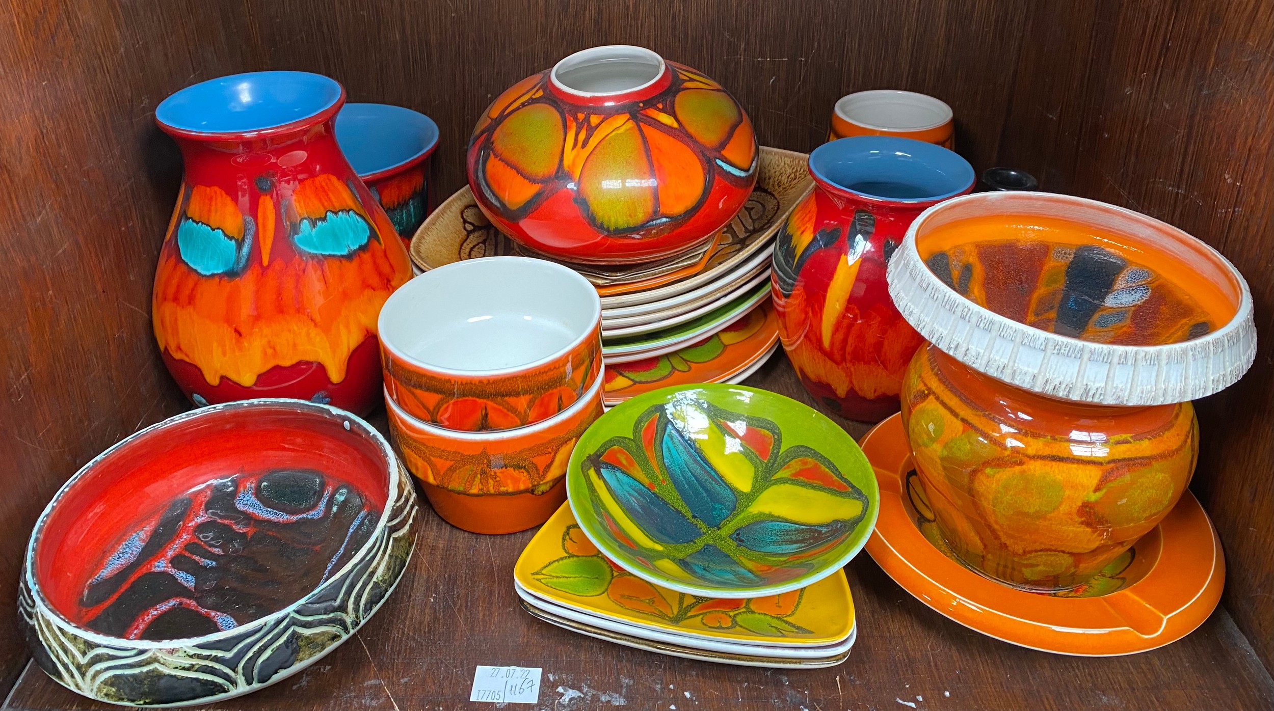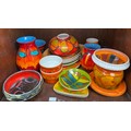 A collection of assorted Poole Pottery items including vases, plates, dishes, pots and an ashtray etc. some in the volcano pattern (SECTION 38)