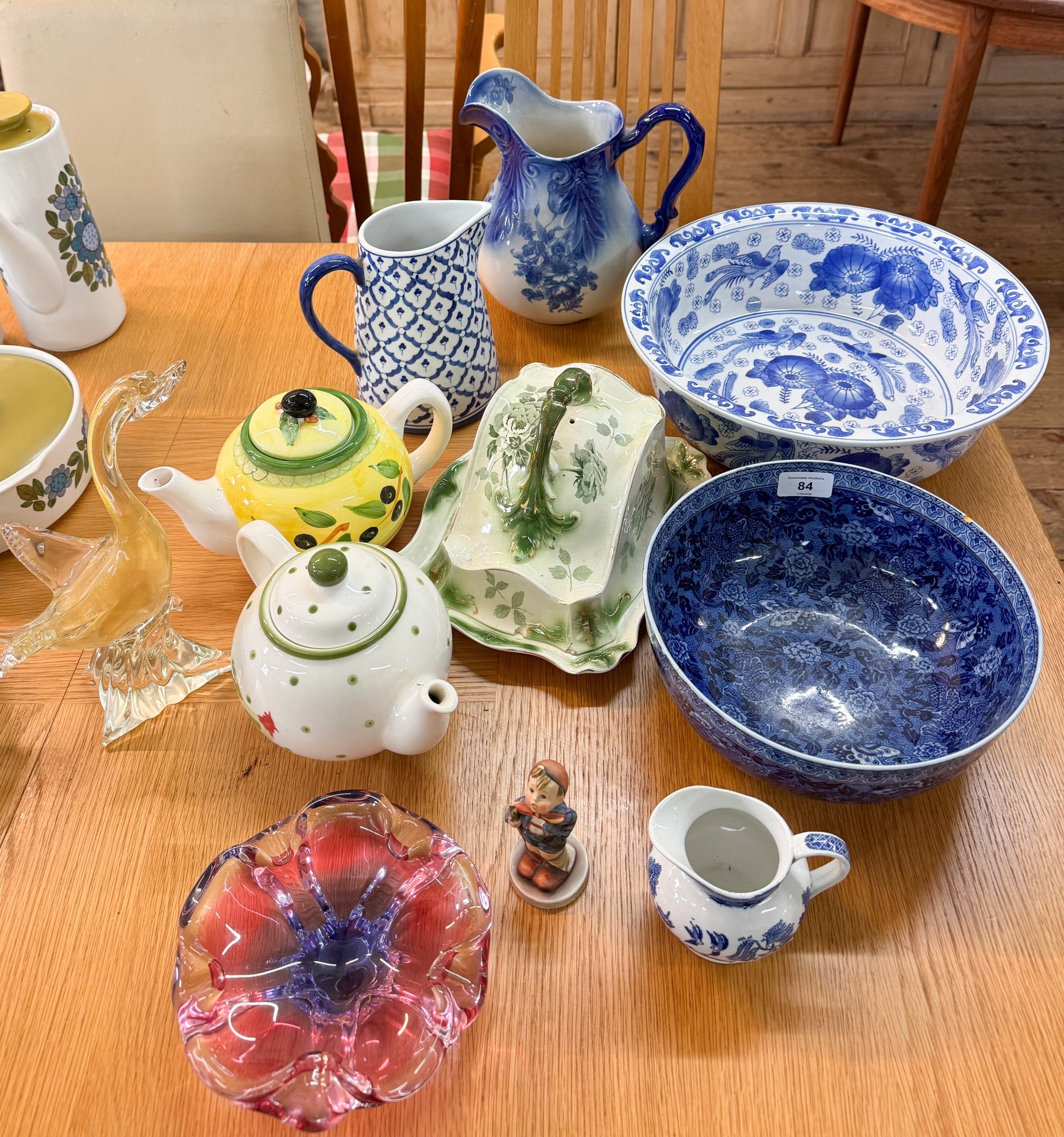 An Art Glass model of a swan together with a decorative ash tray, a Hummel figure and various blue and white china