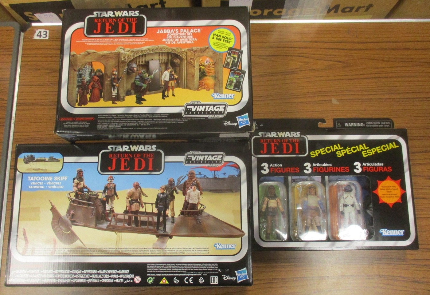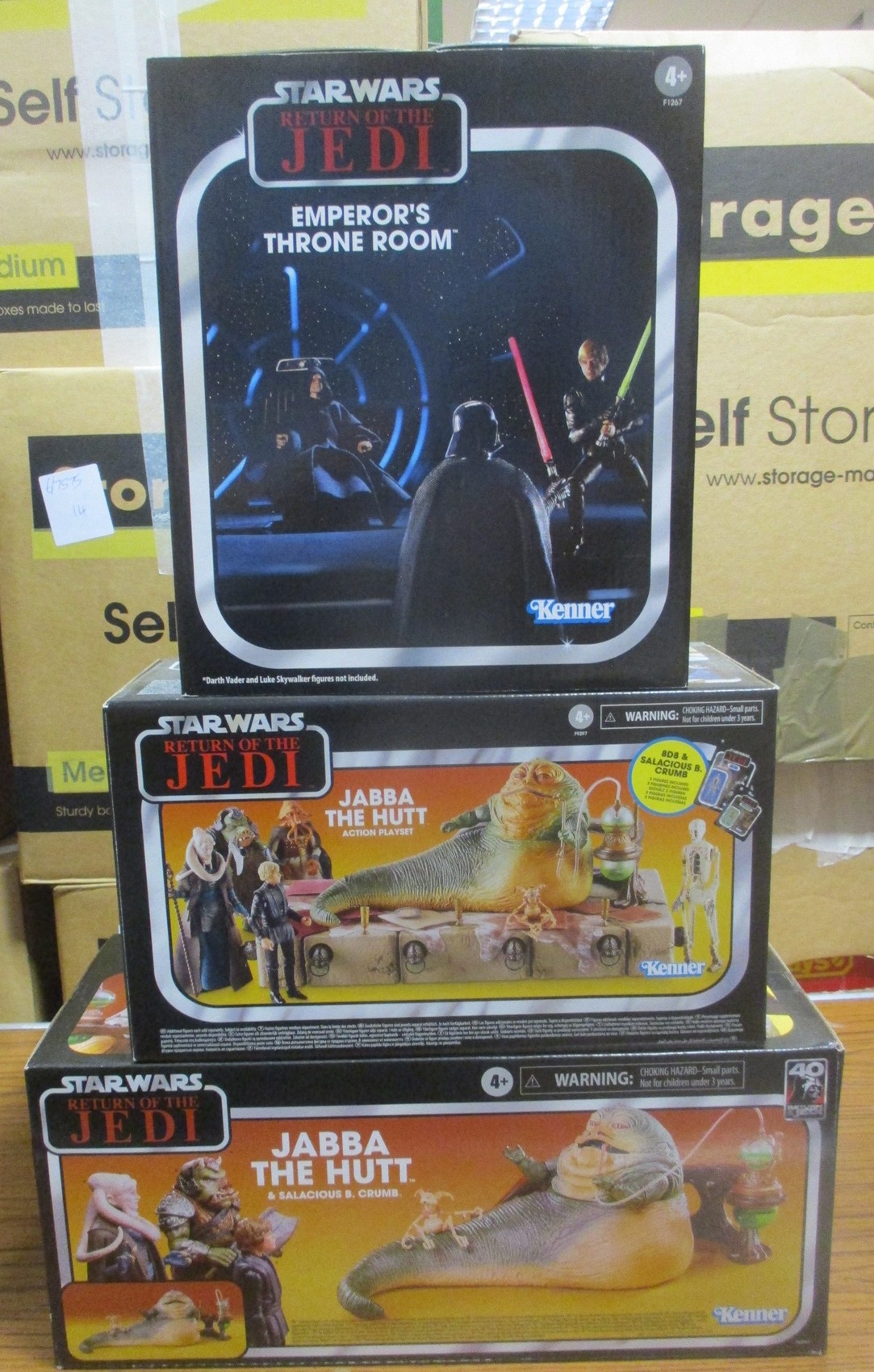 Star Wars. Hasbro. The Vintage Collection Return of the Jedi range, generally mint in near mint boxes, with Emperor's Throne Room, Jabba the Hutt & Salacious B Crumb, Jabba the Hutt Action Playset, Jabba's Palace, Tatooine Skiff and figure set of 3. Qty 6 (B)