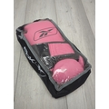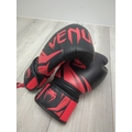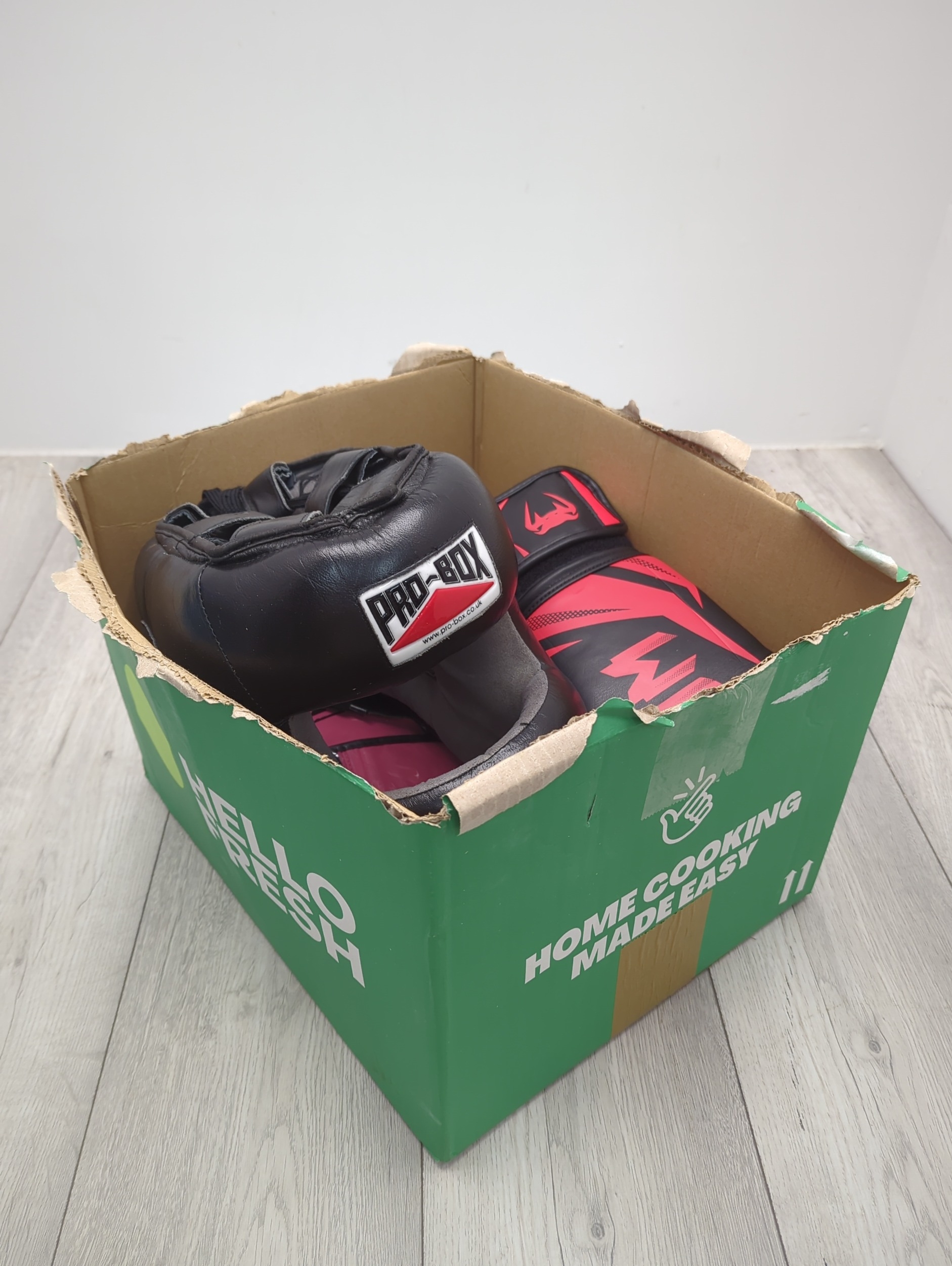 This selection of boxing gear includes a Pro-Box headguard, Venum boxing gloves, and a pair of Demon wrist supports. The Pro-Box headguard offers substantial protection with its well-padded design. The Venum boxing gloves feature a striking red and black design, ideal for training and sparring. The Demon wrist supports provide additional stability and protection. A pink pair of gloves is also included in its original packaging.