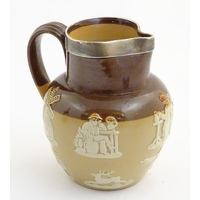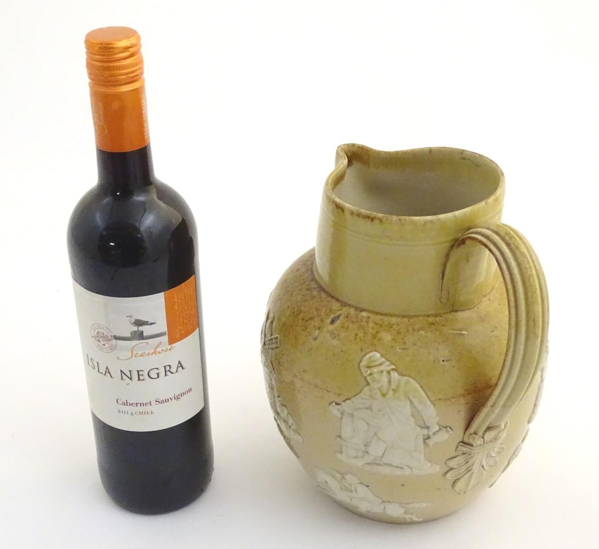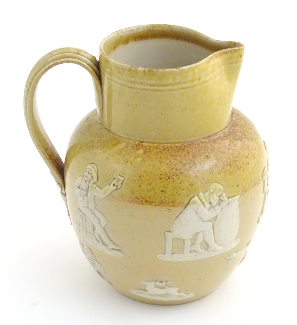 A Royal Doulton salt glaze jug with relief decoration of harvest and hunting scenes, including a deer, dogs, and gentleman on horseback with a hunting horn, trees, a windmill and figures drinking and smoking. Impressed Royal Doulton mark, maker's mark hb, possibly E. Violet Hayward, and 2892 to base. Approx. 8 1/4'' high.