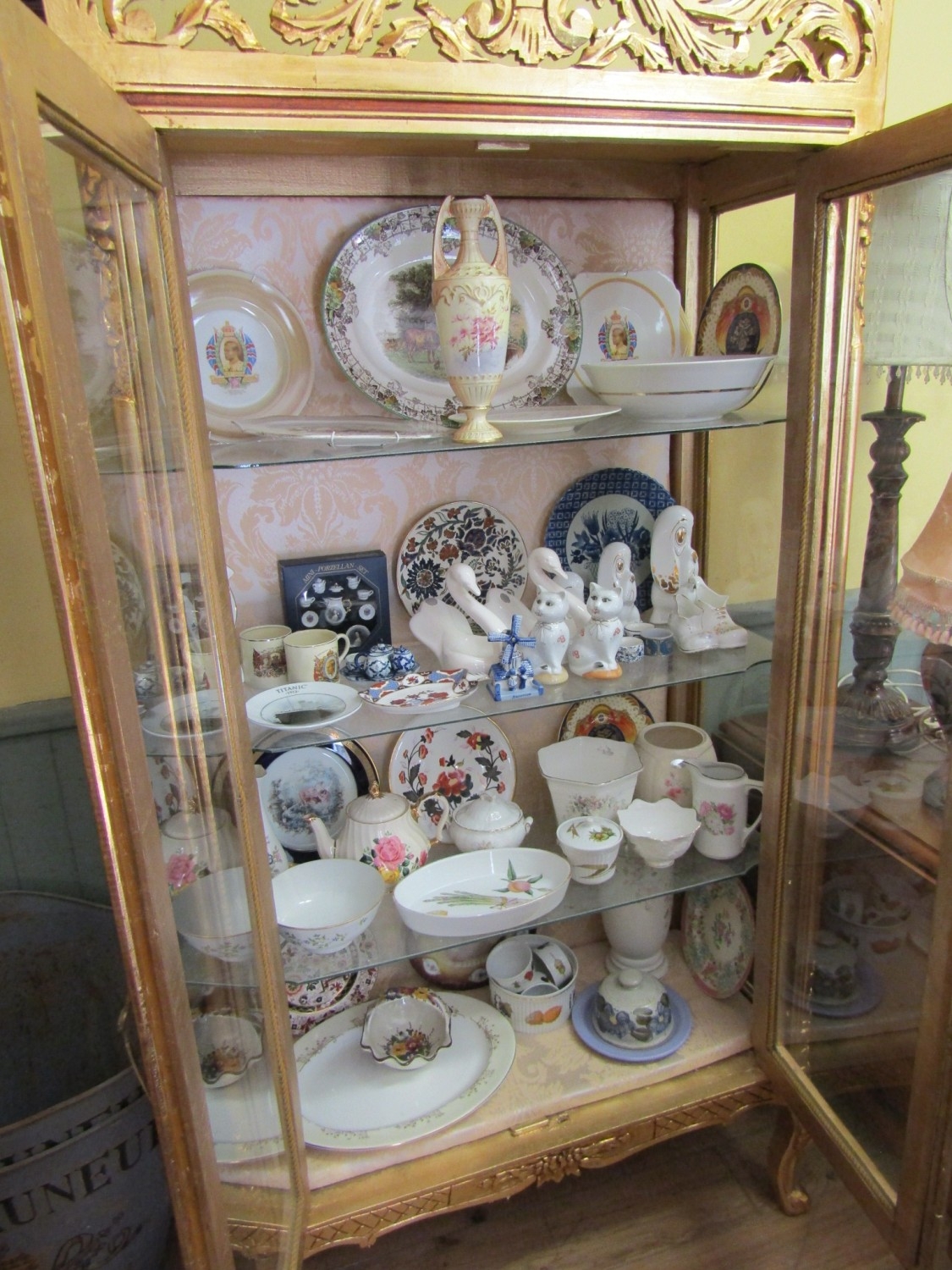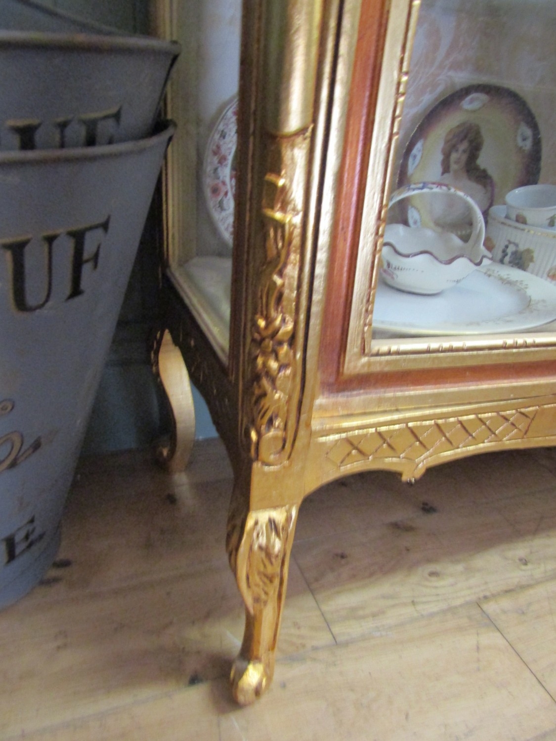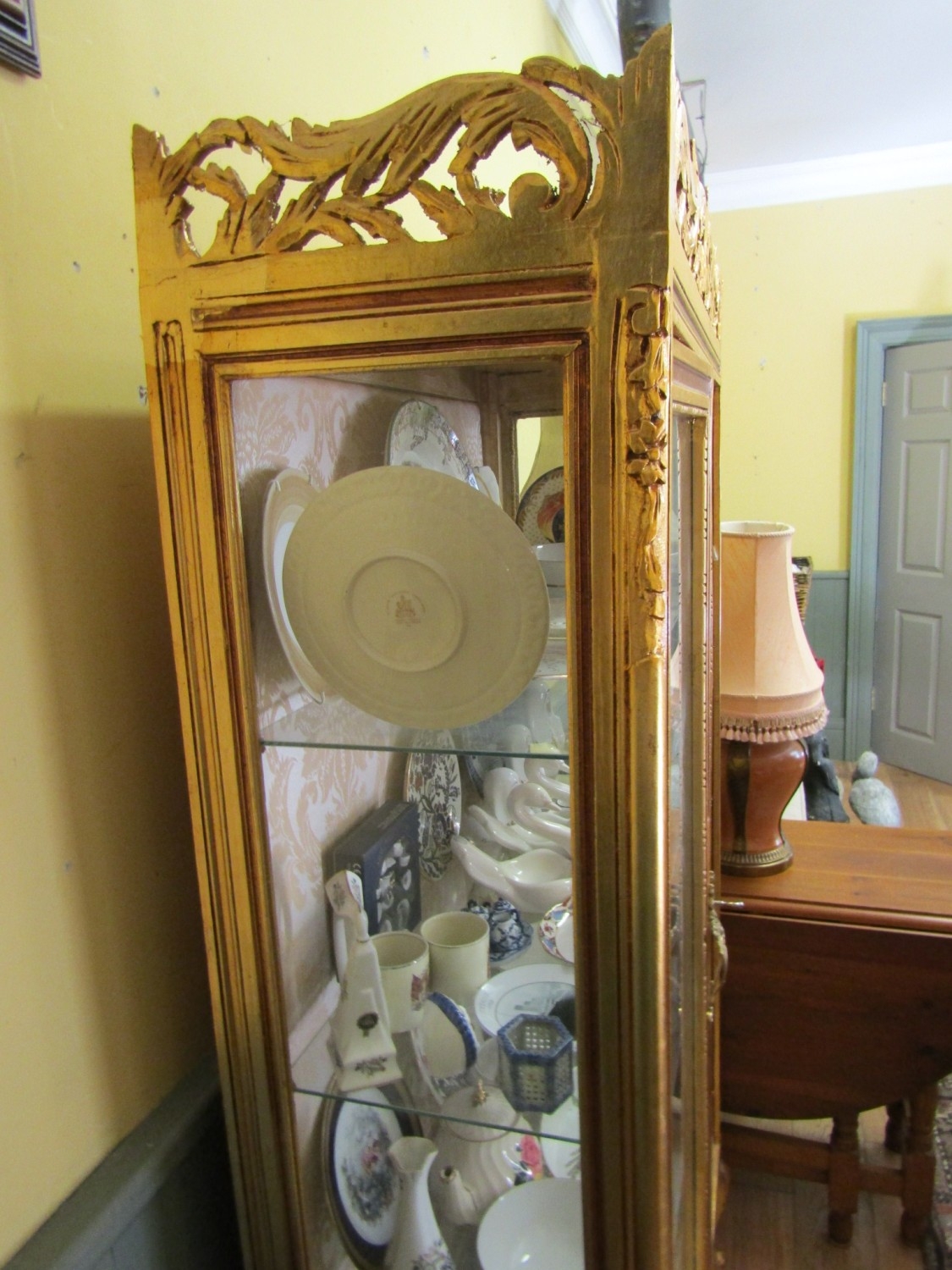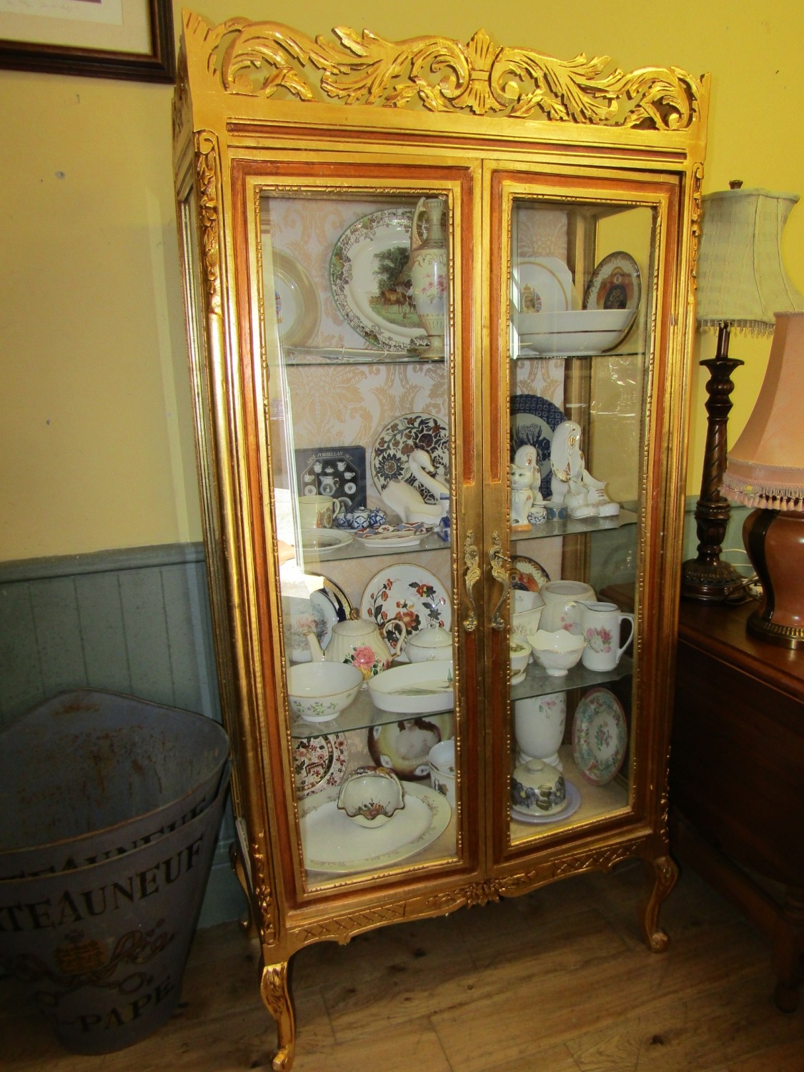 Gilded Twin Door Display Cabinet with Upper Carved Decoration Approximately 40 Inches Wide x 6ft 6 Inches High