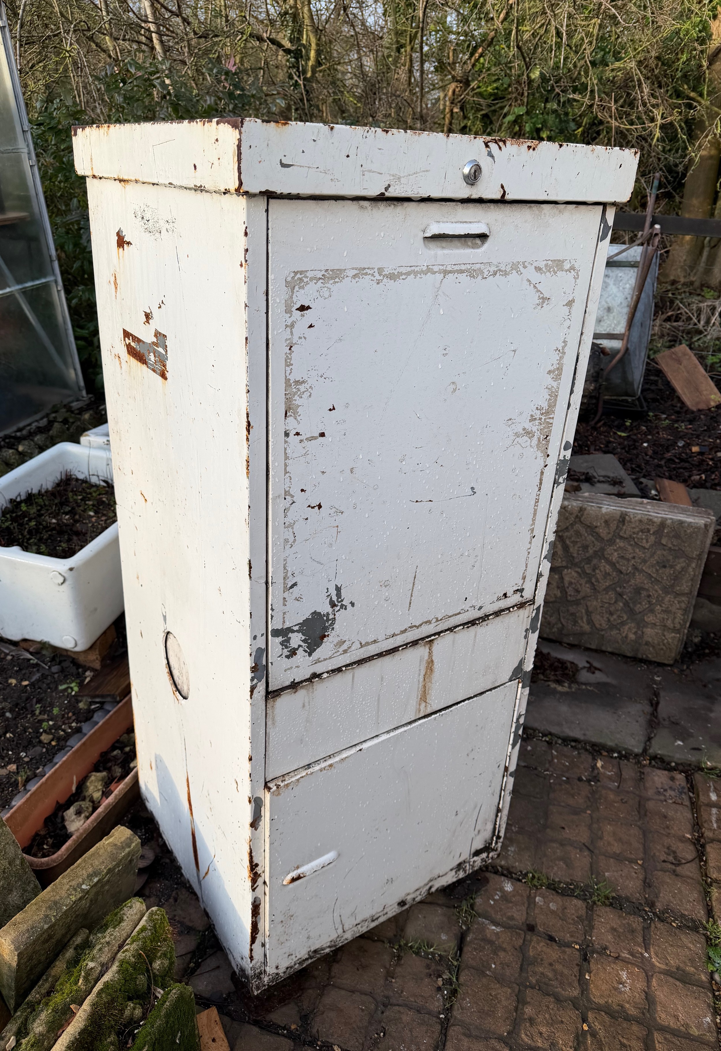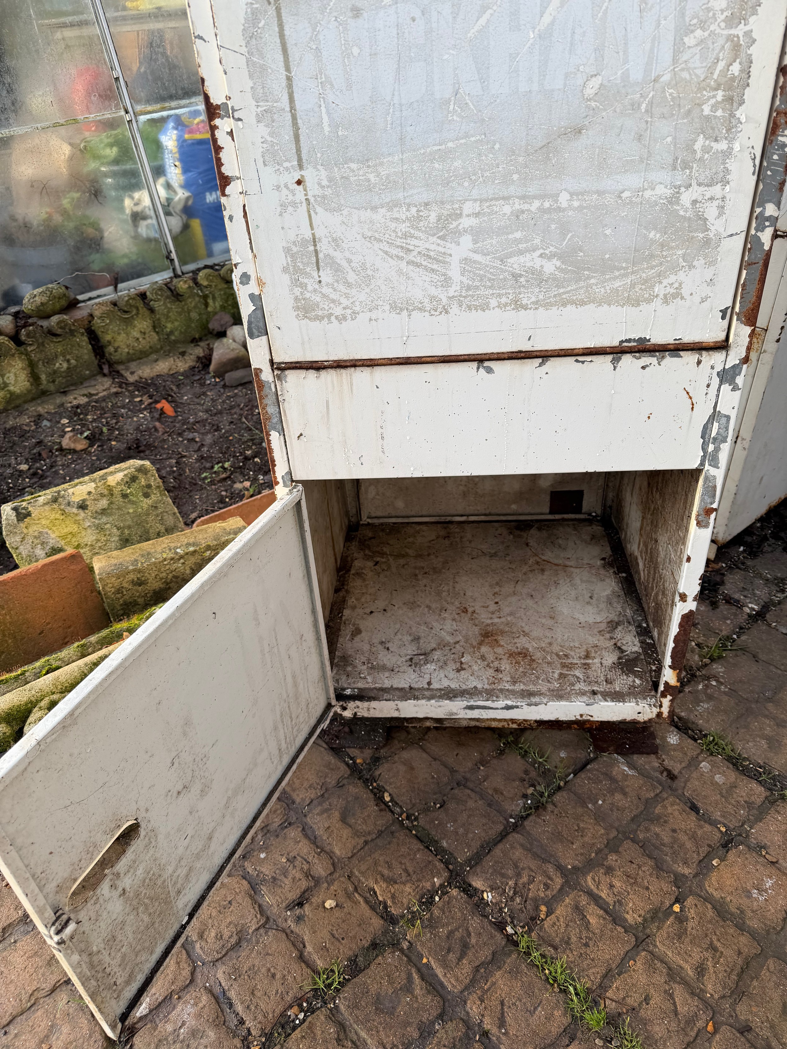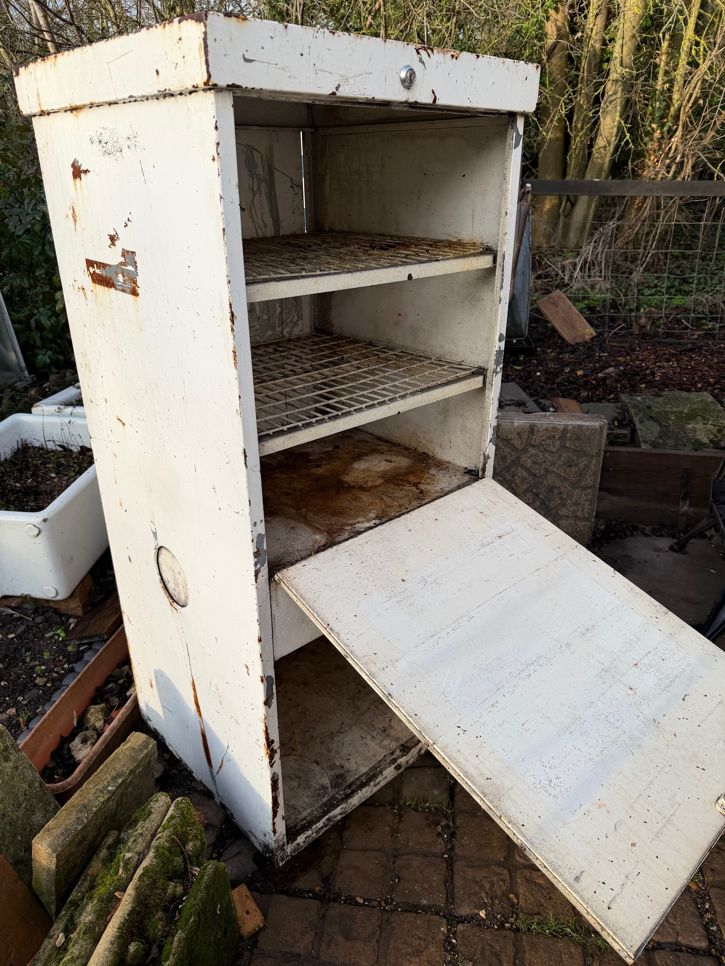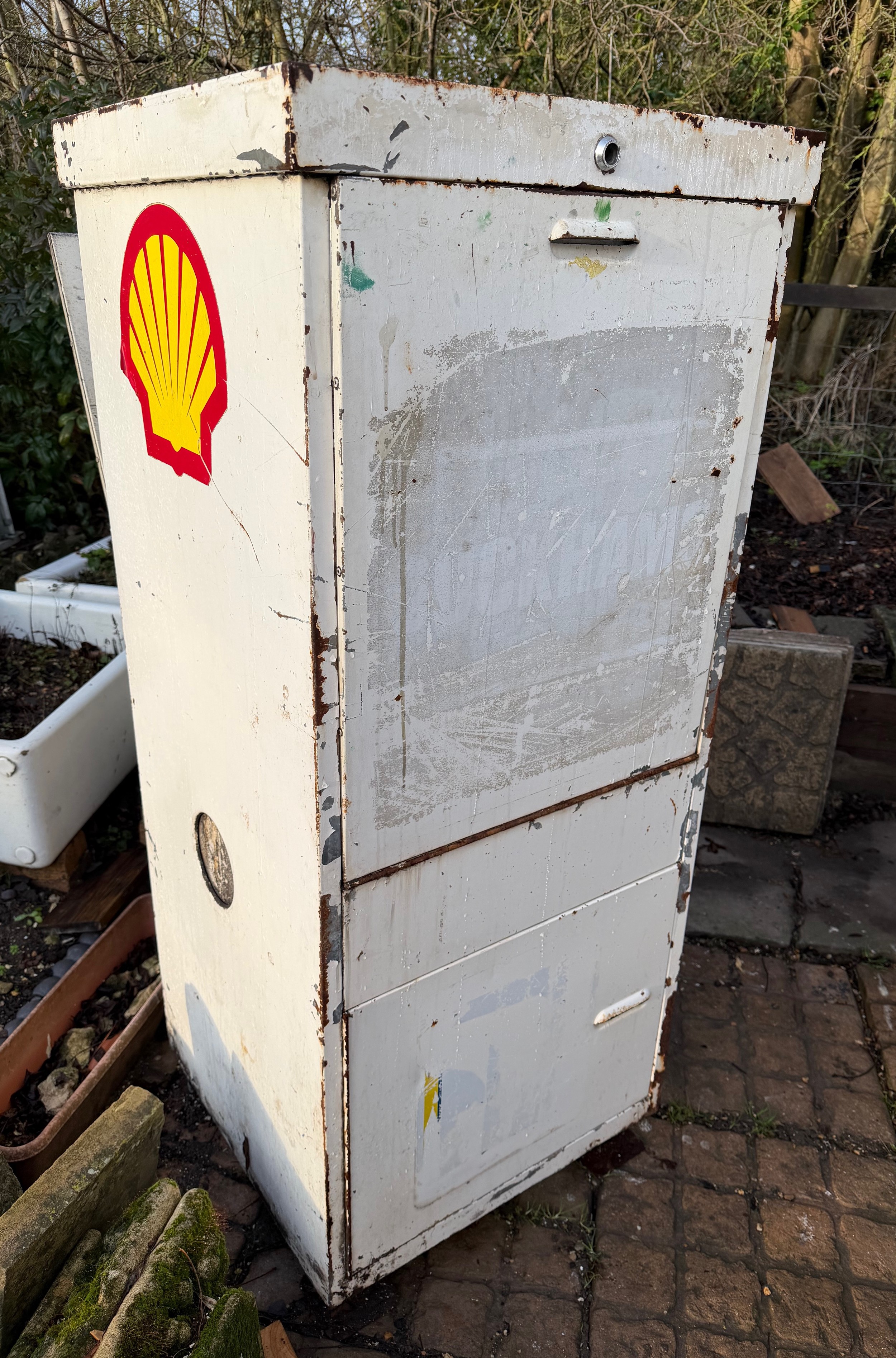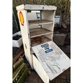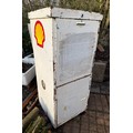Petrolania, Automobilia, forecourt oil dispenser, vintage garage double sided oil cabinet marked for Duckhams and Shell products, both upper and lower compartments allow access from each side. 58.5 cm x 55.5 cm x 136 cm tall.