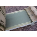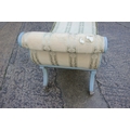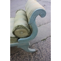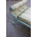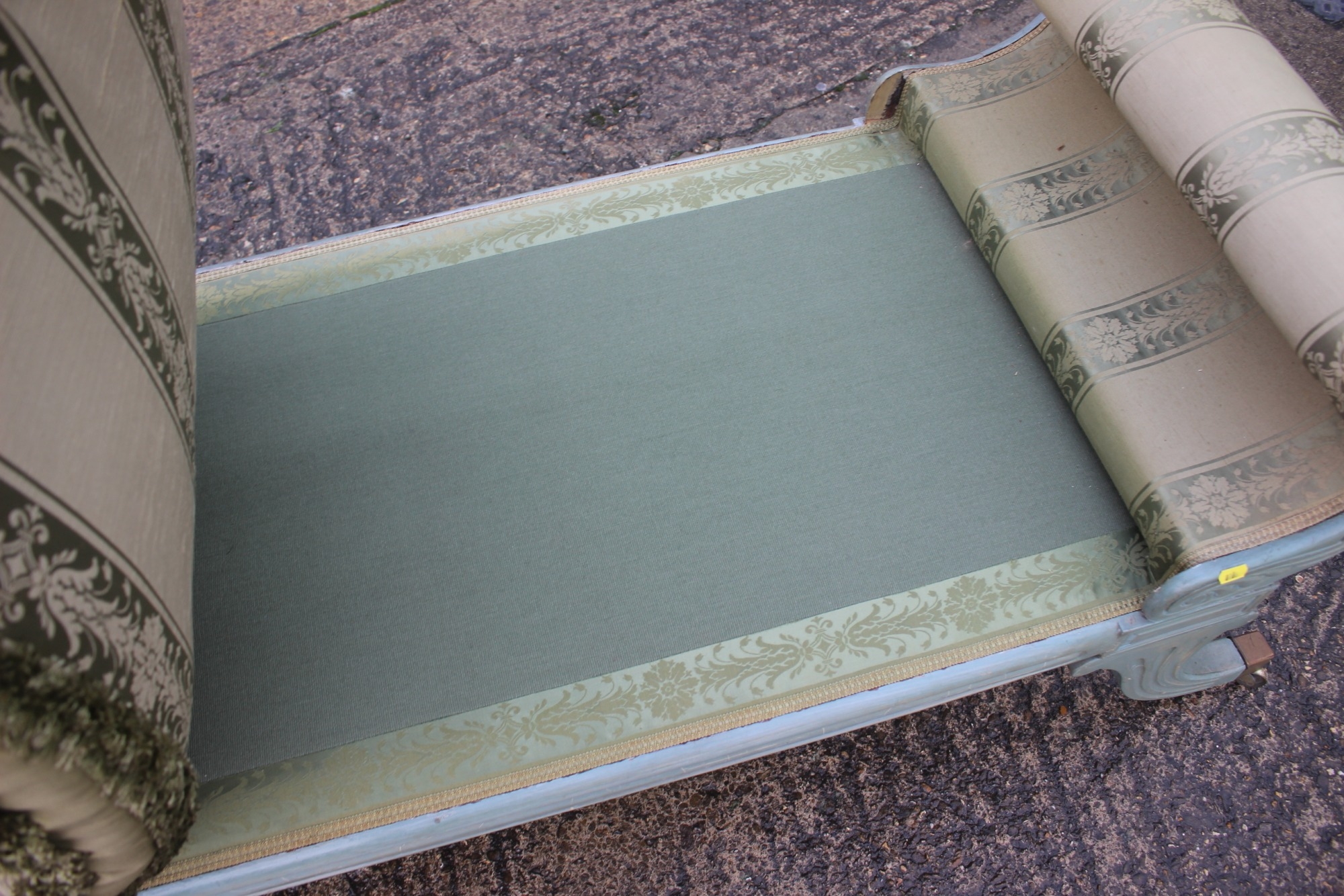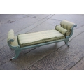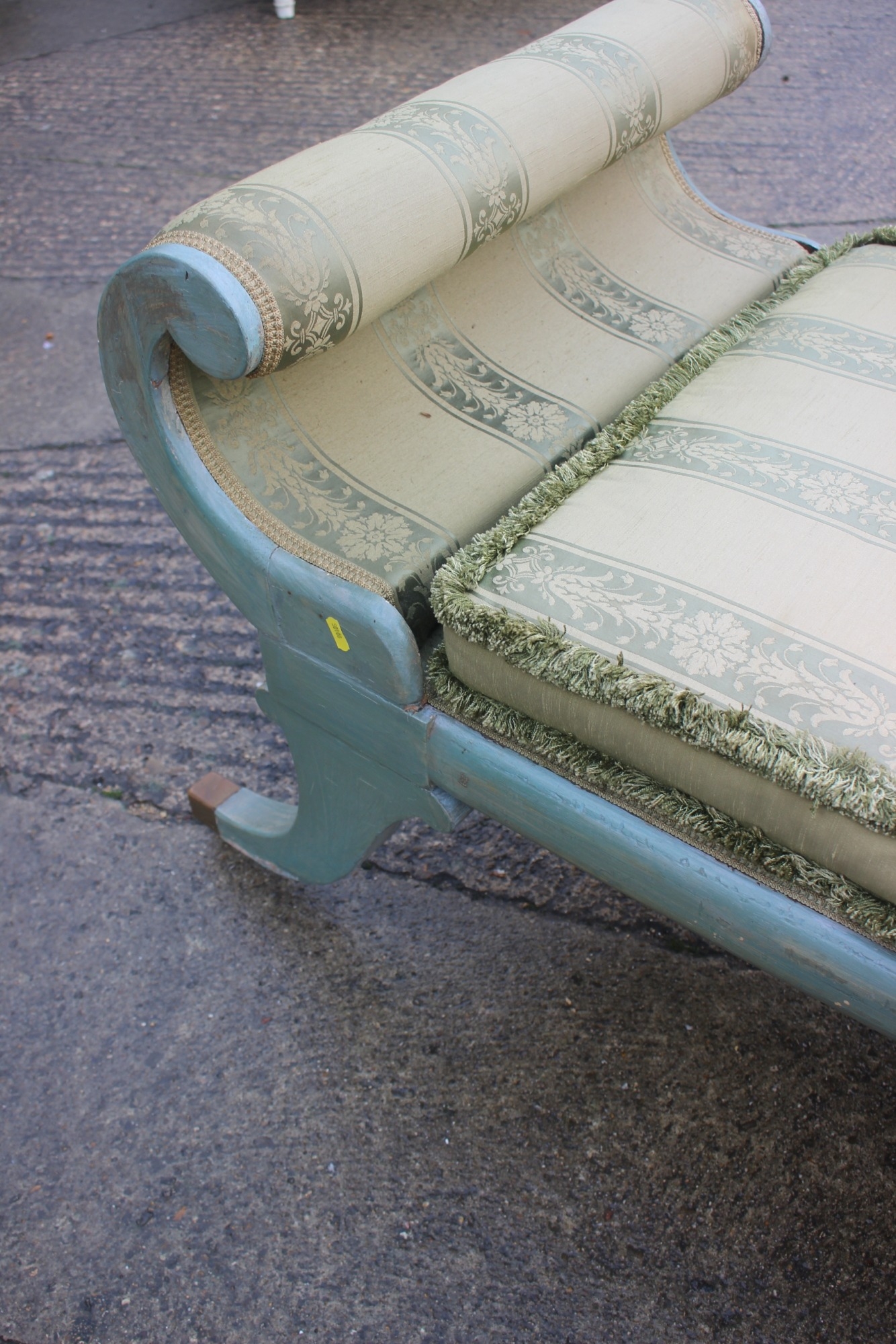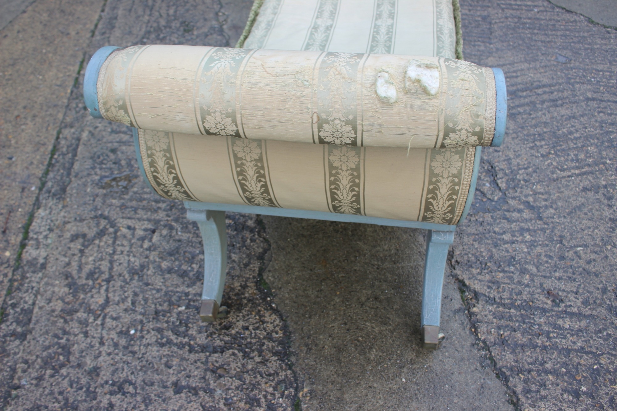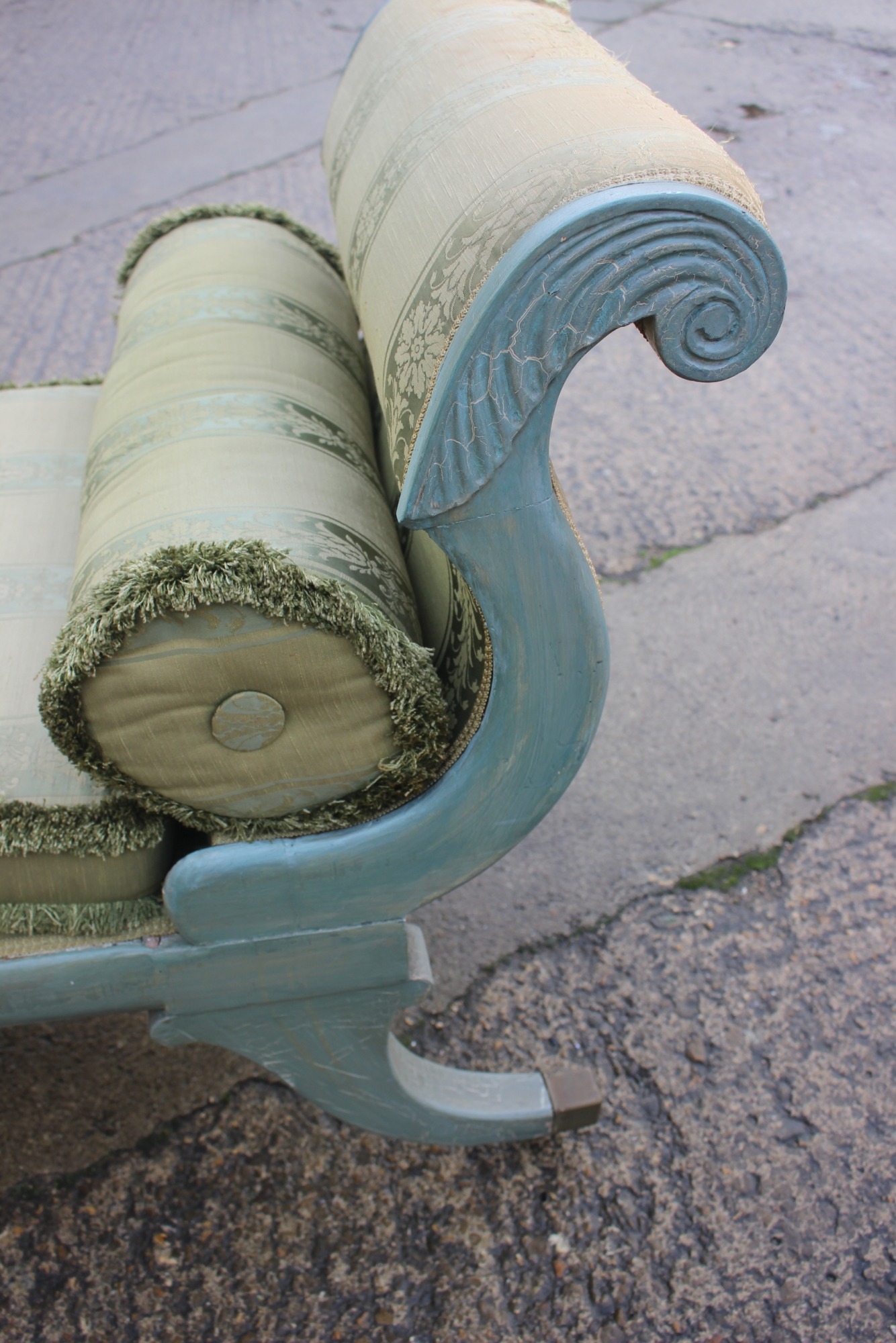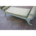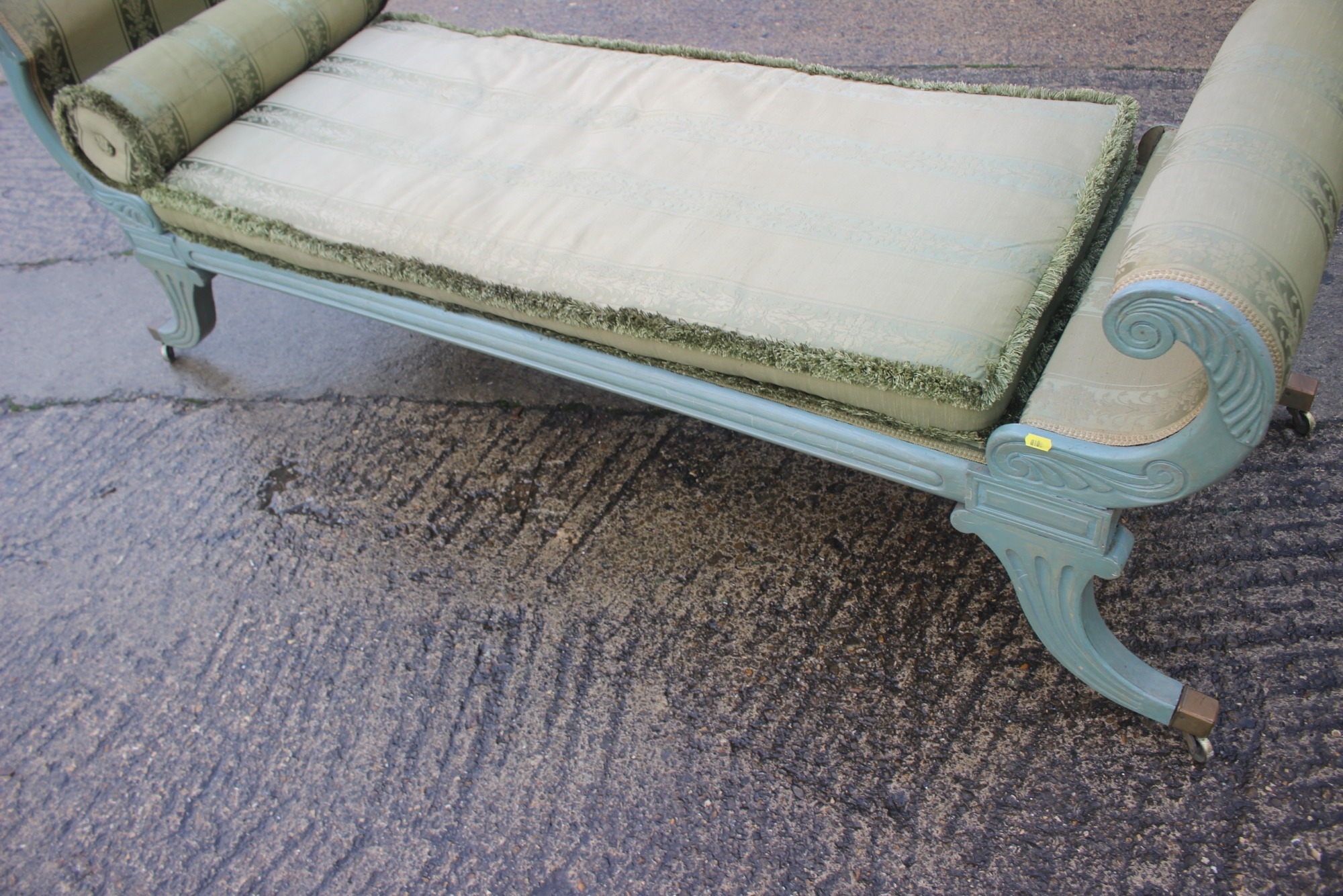 A Regency painted scroll end day bed with loose cushions, on splay castor supports, 207" long x 24" wide x 31" high