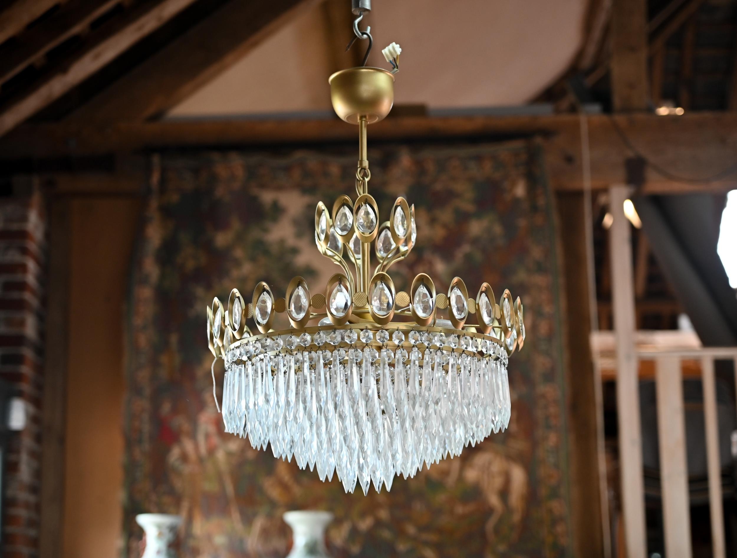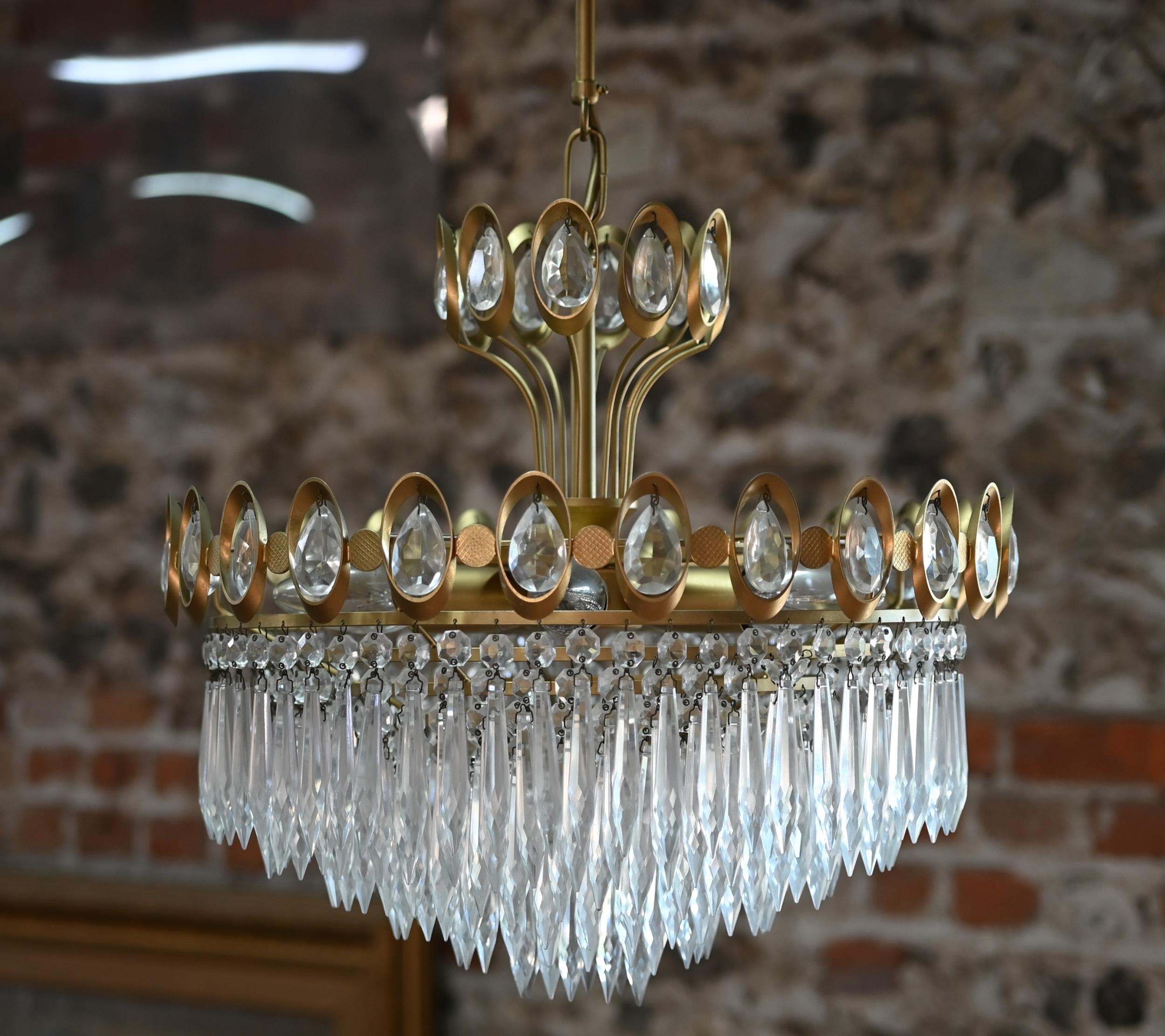 A good pair of brass framed lead crystal chandeliers by Joska, circa 1970's, each approx. 40 cm dia. x 45 cm h, c/with ceiling roses (2)
