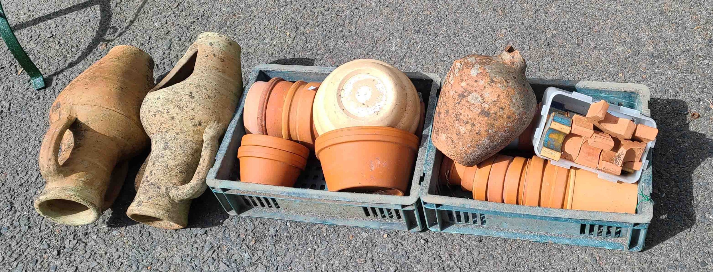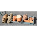 Two crates containing a quantity of assorted terracotta plant pots - sold with a quantity of plant pot feet and two amphora shaped planters