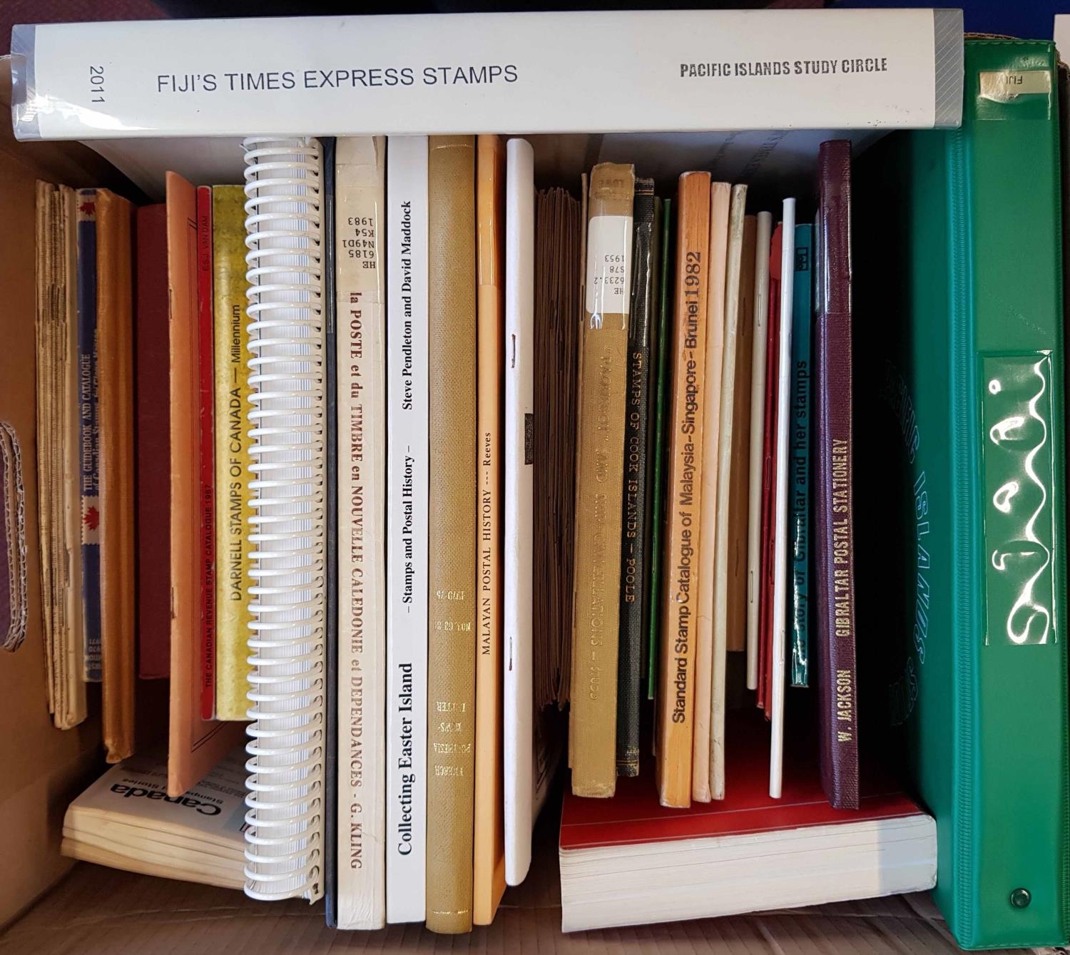 BRITISH COMMONWEALTH MISCELLANY: One box containing a large number of publications. Noted Cook Islands by Poole, Gibraltar Postal Stationery by Jackson, Malaya States by Wood, Easter Island by Pendleton. Viewing essential. (30) Cross Reference: BRITISH COMMONWEALTH COLLECTIONS, COOK ISLANDS, GIBRALTAR, MALAYA/MALAYSIA