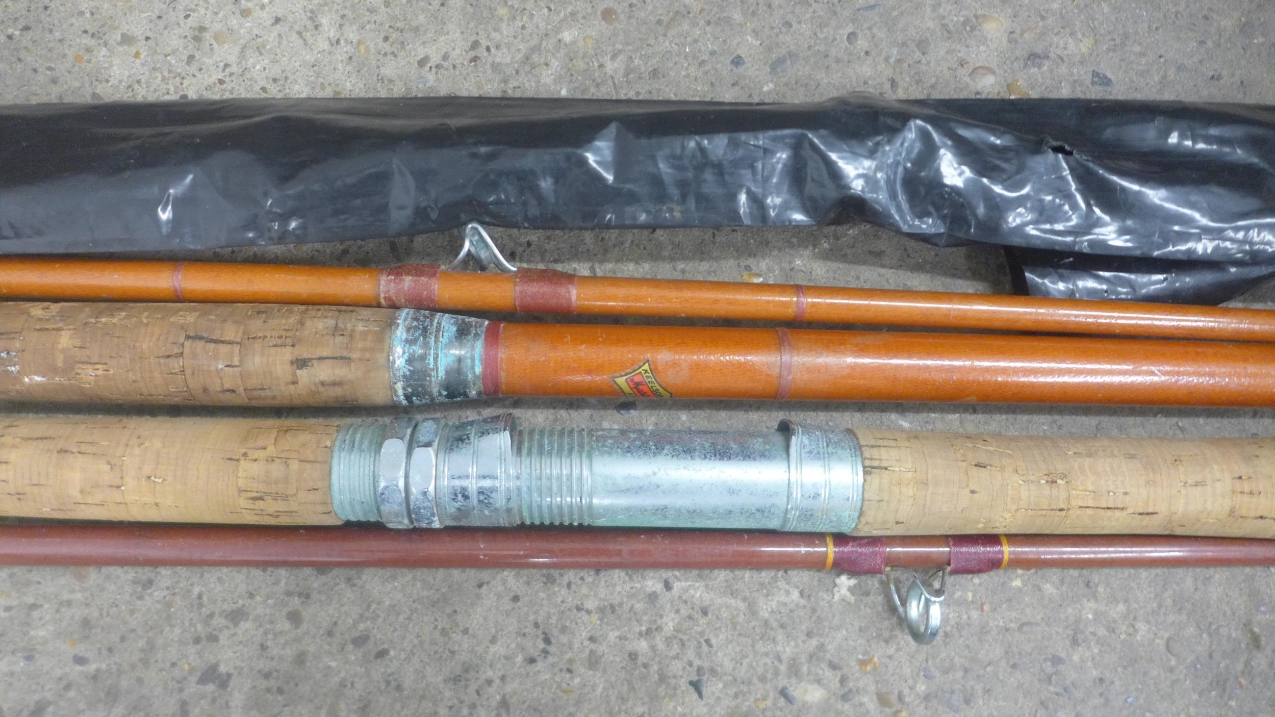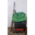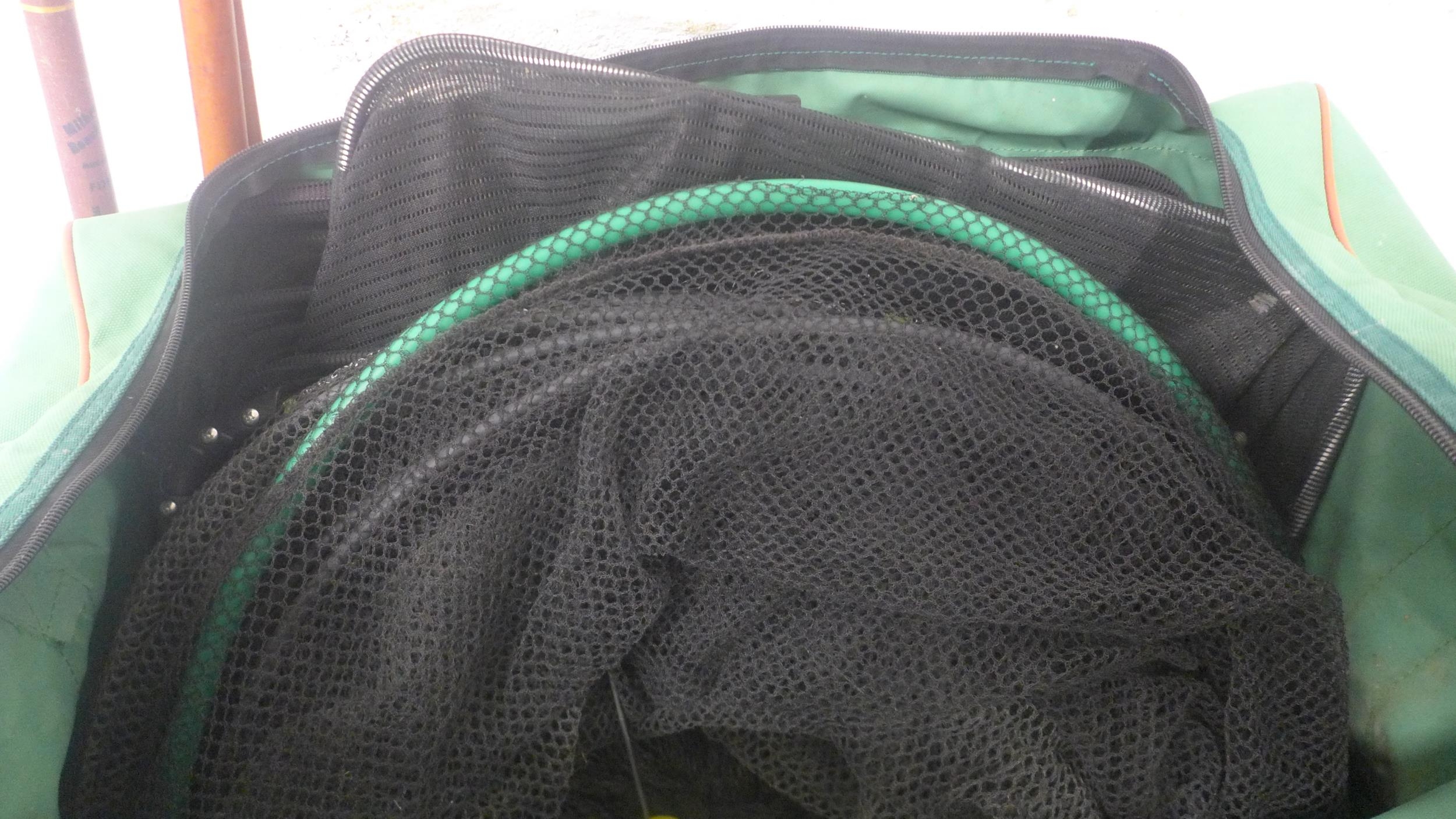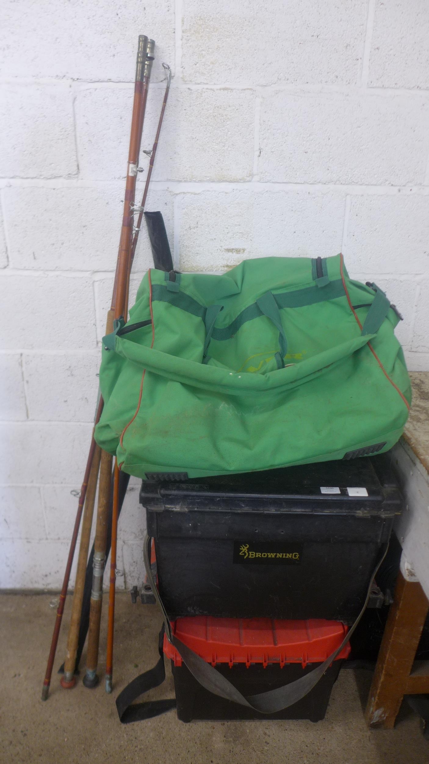 A large quantity of fishing equipment including 3 rods, large bag of keep nets/landing nets and 2 fishing boxes