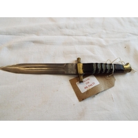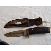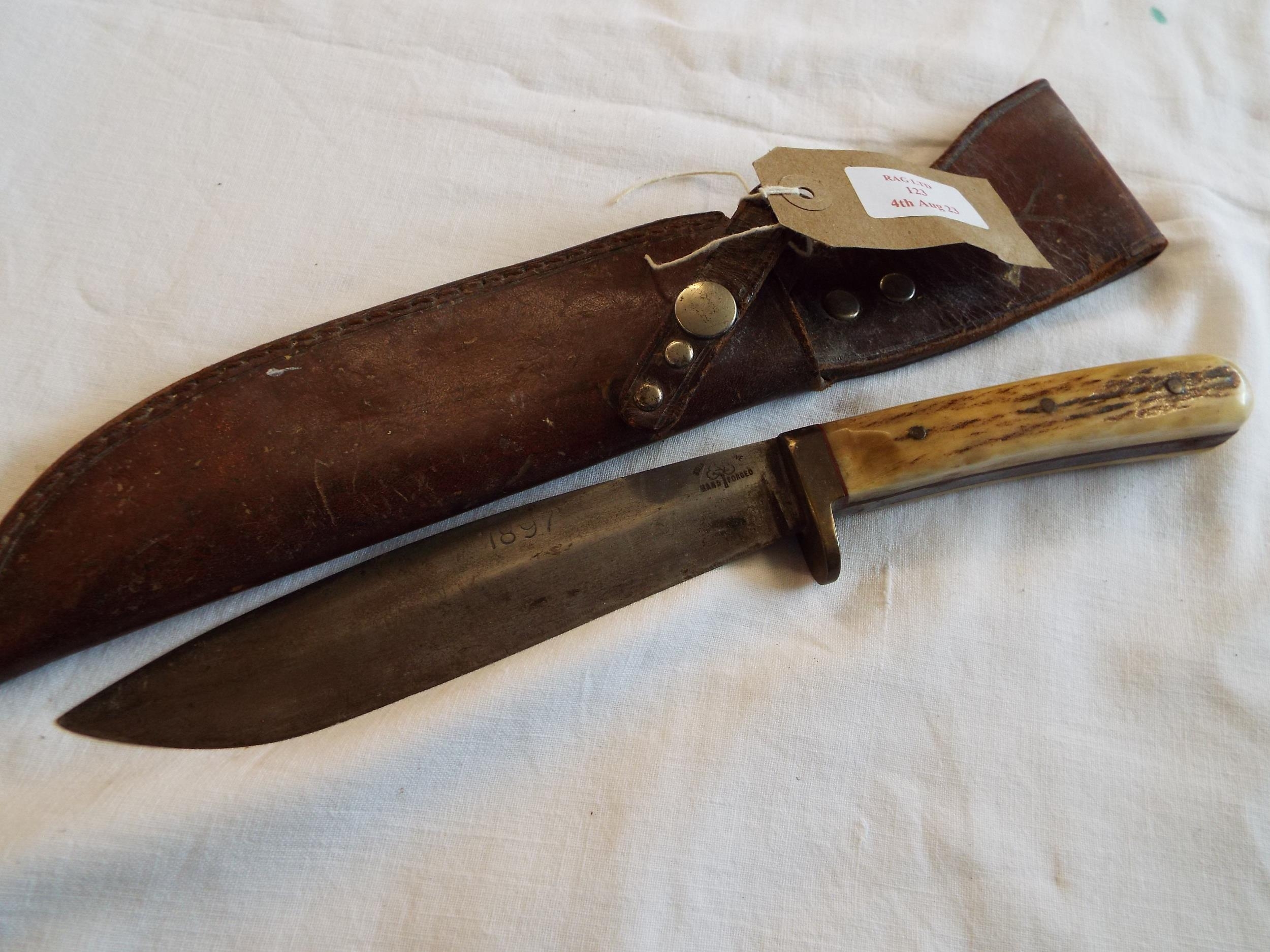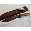 An 1897 bone handle bowie knife in leather scabbard