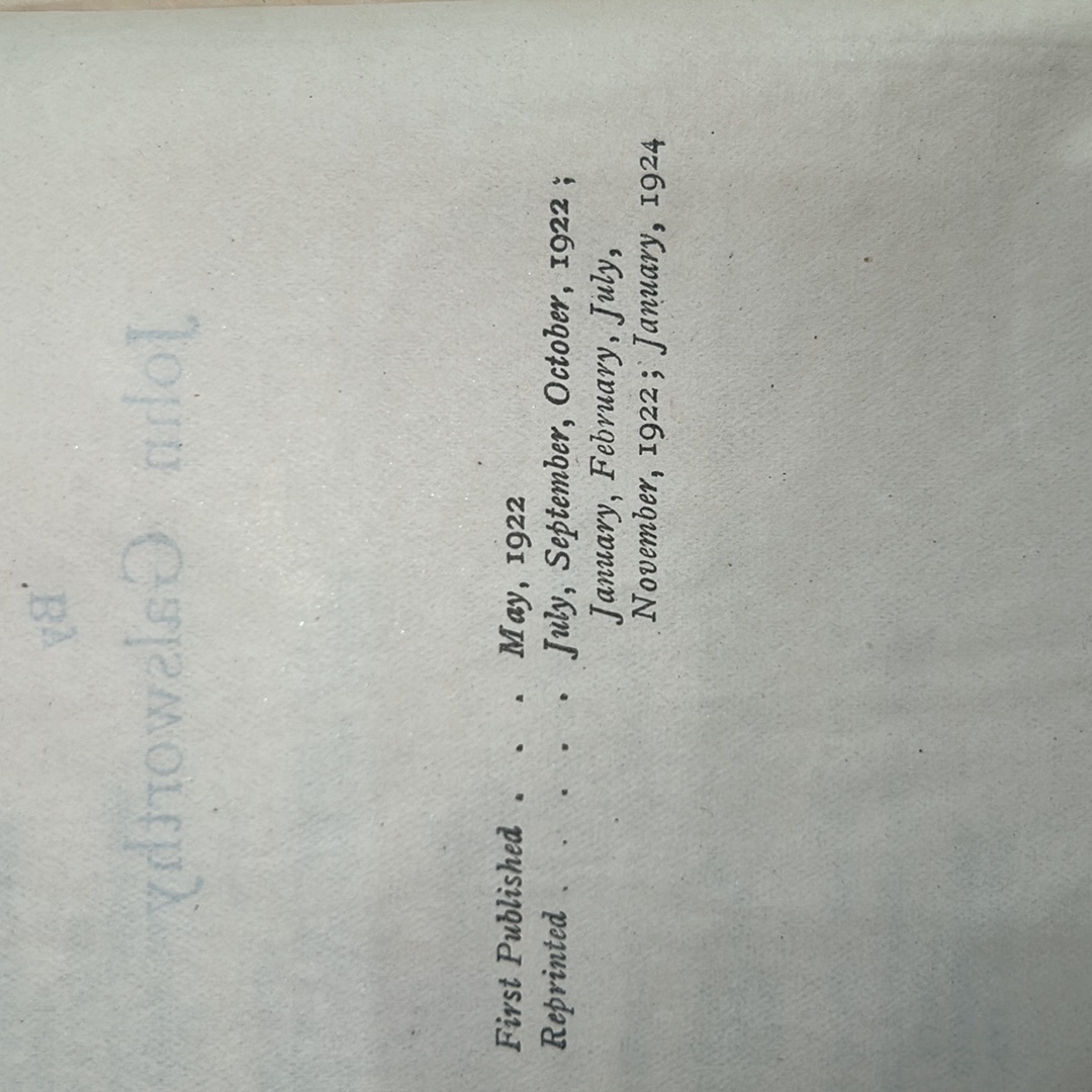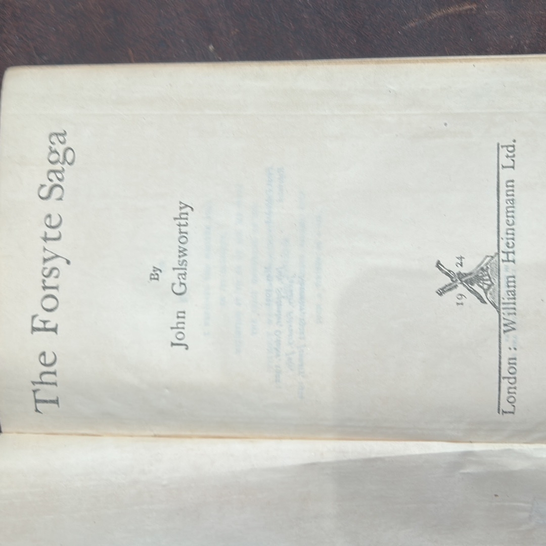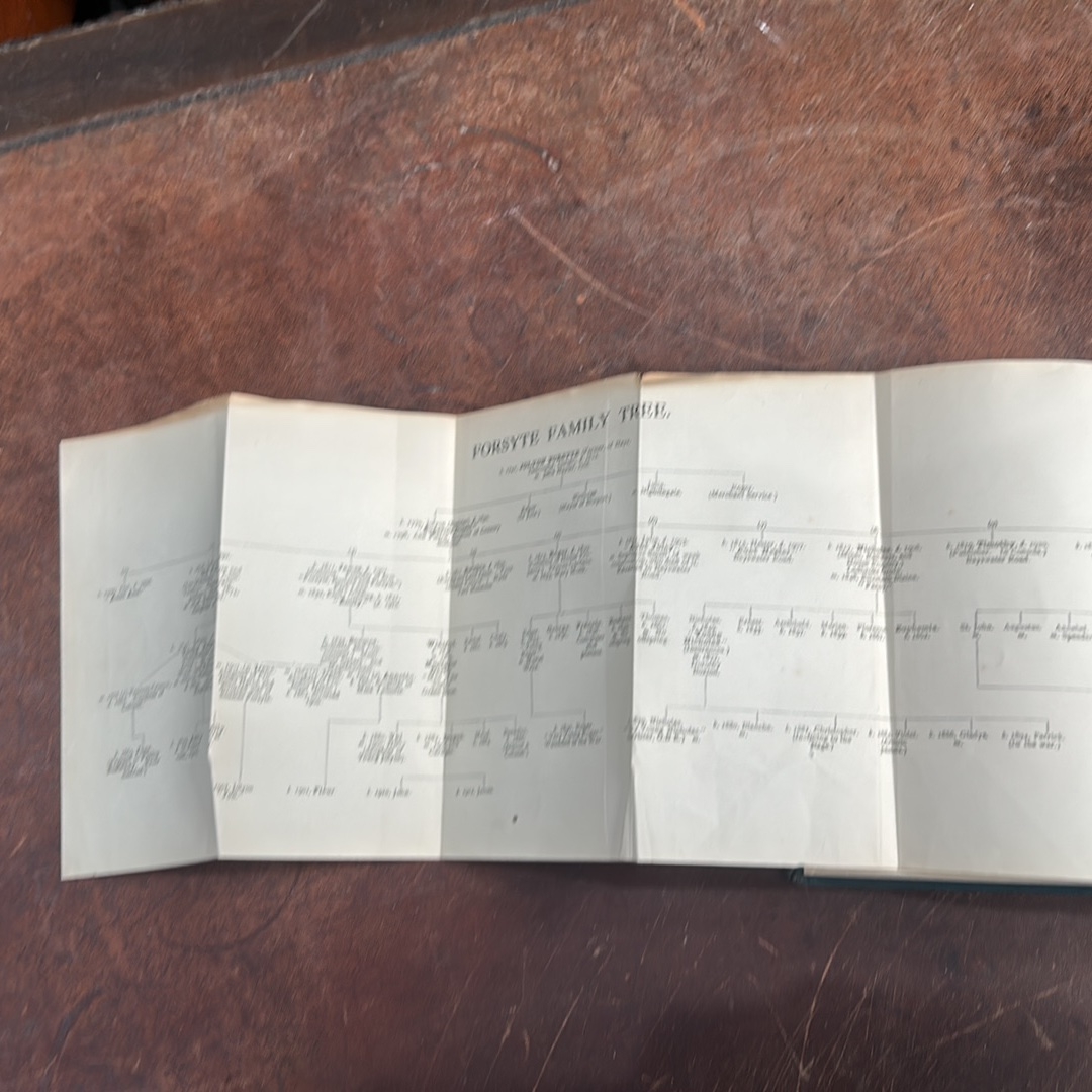 John Galsworthy, The Forsyte Saga, London: William Heinemann Ltd, reprint dated January 1924, green cloth hardback with folding "Forsyte Family Tree" frontispiece.