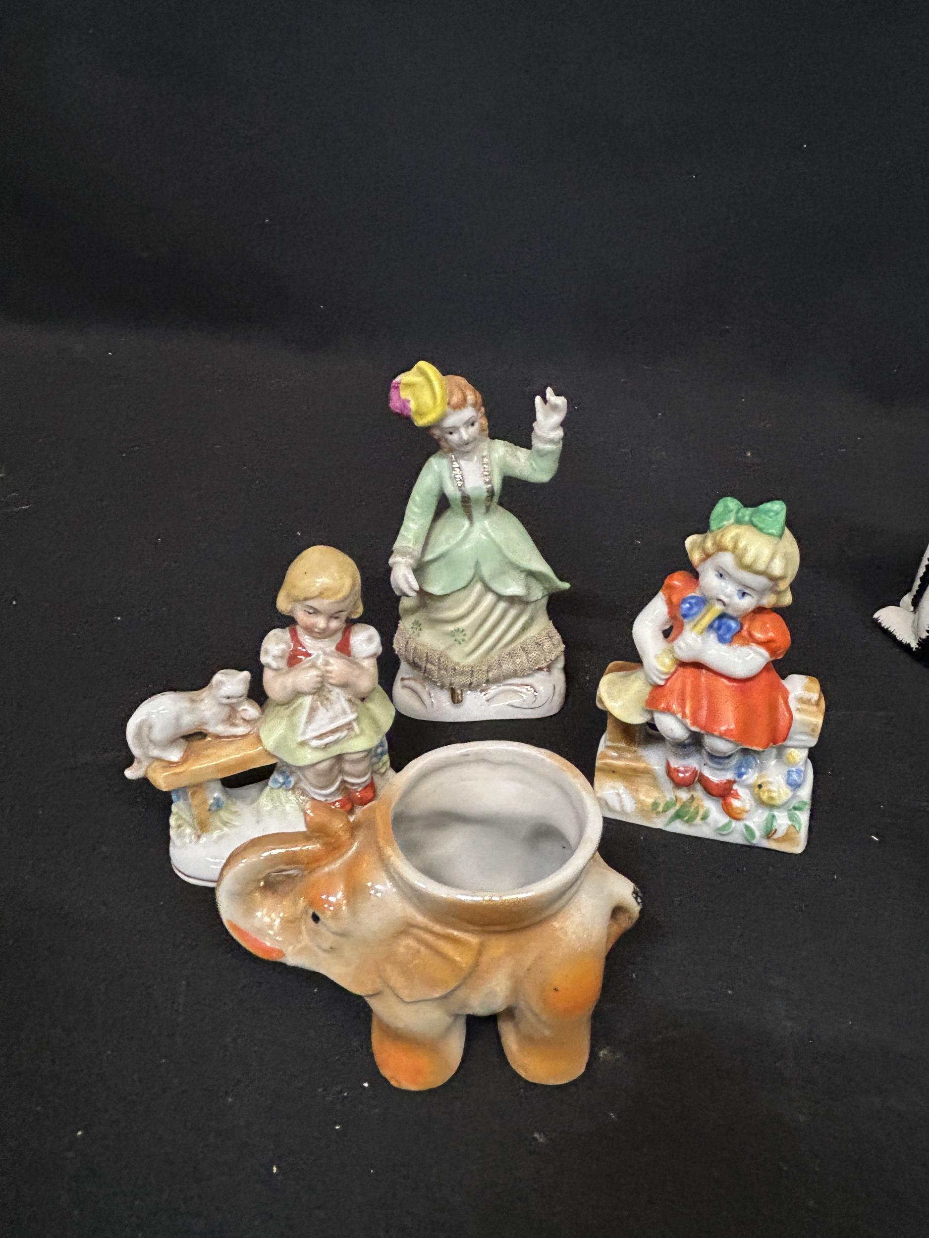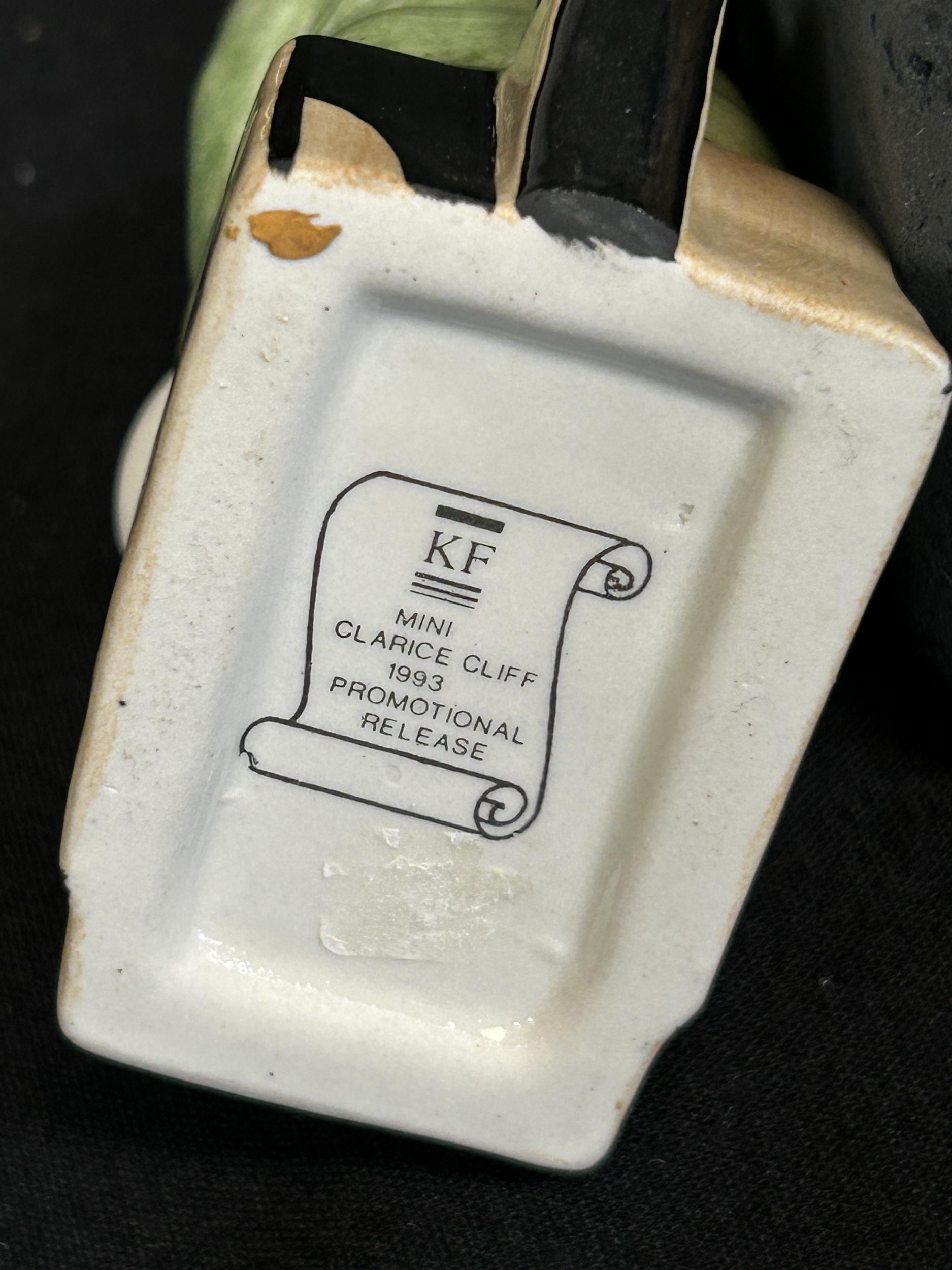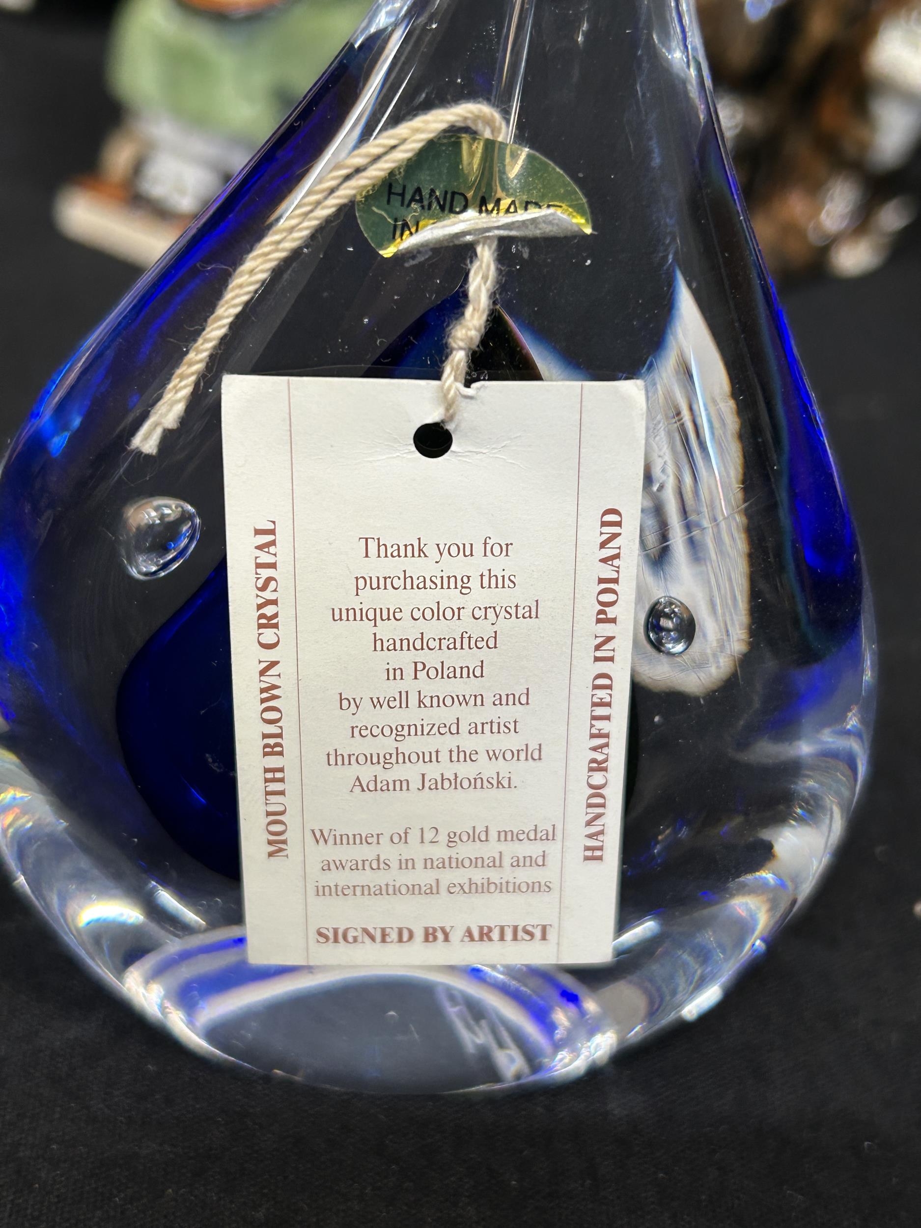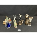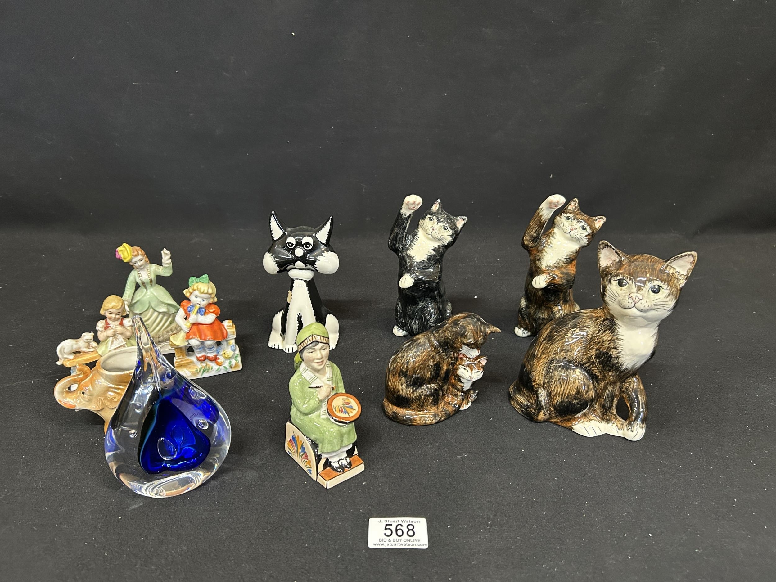 Set of 4 Babbacombe pottery cats, Tallest 16cms, Mini Clarice Cliff figure, Laura Green cat figure, signed Polish glass teardrop, plus other small figures