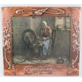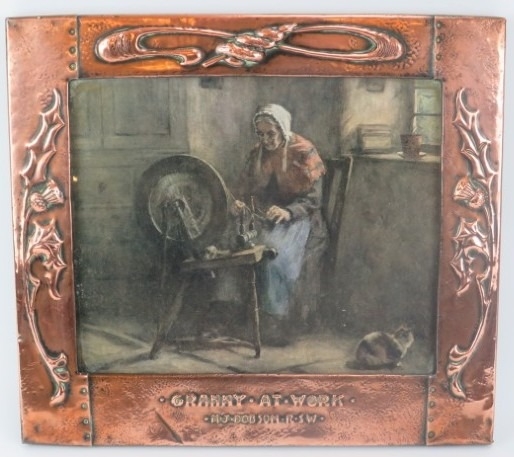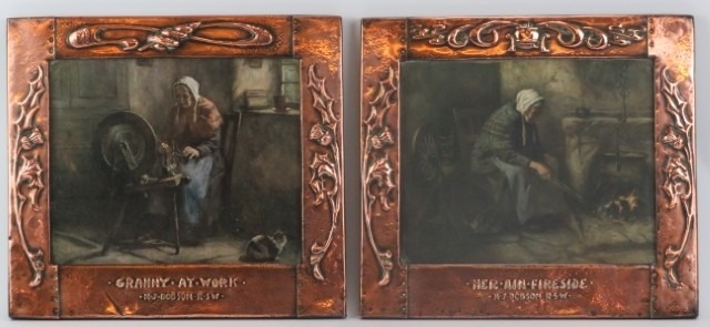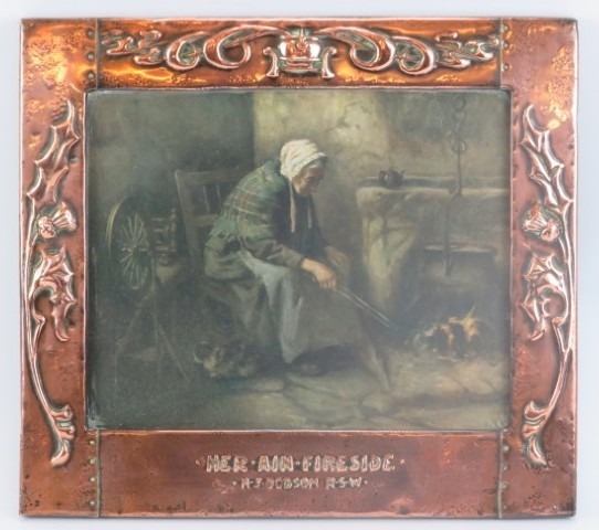 A pair of Arts and Crafts era ‘Boots picture framing department’ copper frames with printed scenes by Henry John Dobson. Boots label verso to one frame. Repoussé decorated with thistles and bearing inscriptions 'Granny at Work’ and ‘Her Ain Fireside’ by ‘H. J. Dobson R.S.W.’ with corresponding prints. Frame dimensions: 29.8 cm x 33.5 cm.