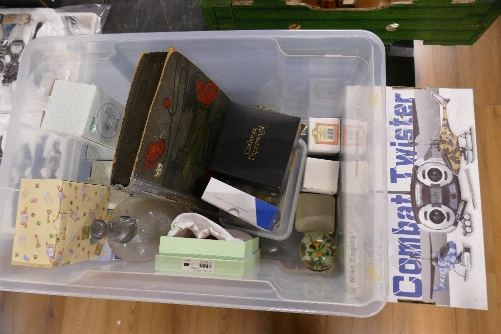 Combat Twister remote control helicopter, boxed Caithness paperweight The Queen Mother, Cherished Teddy ornaments, pink purse, soda siphon, vintage postcard album, quantity of boxed Hue hearing aids
