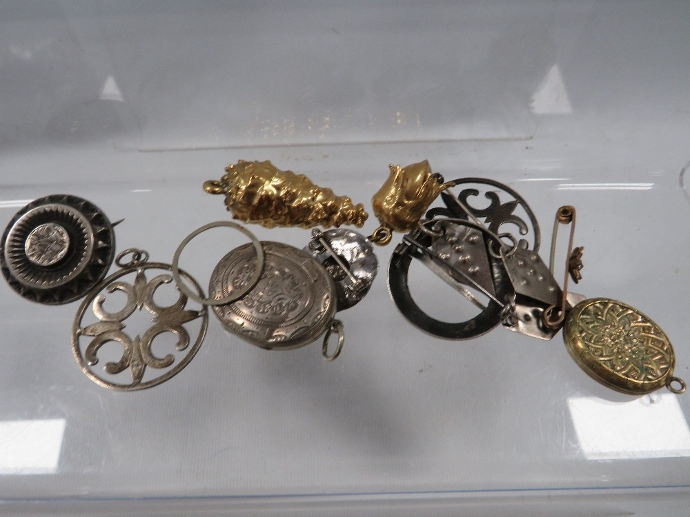 A bag of assorted vintage pendants, brooches etc