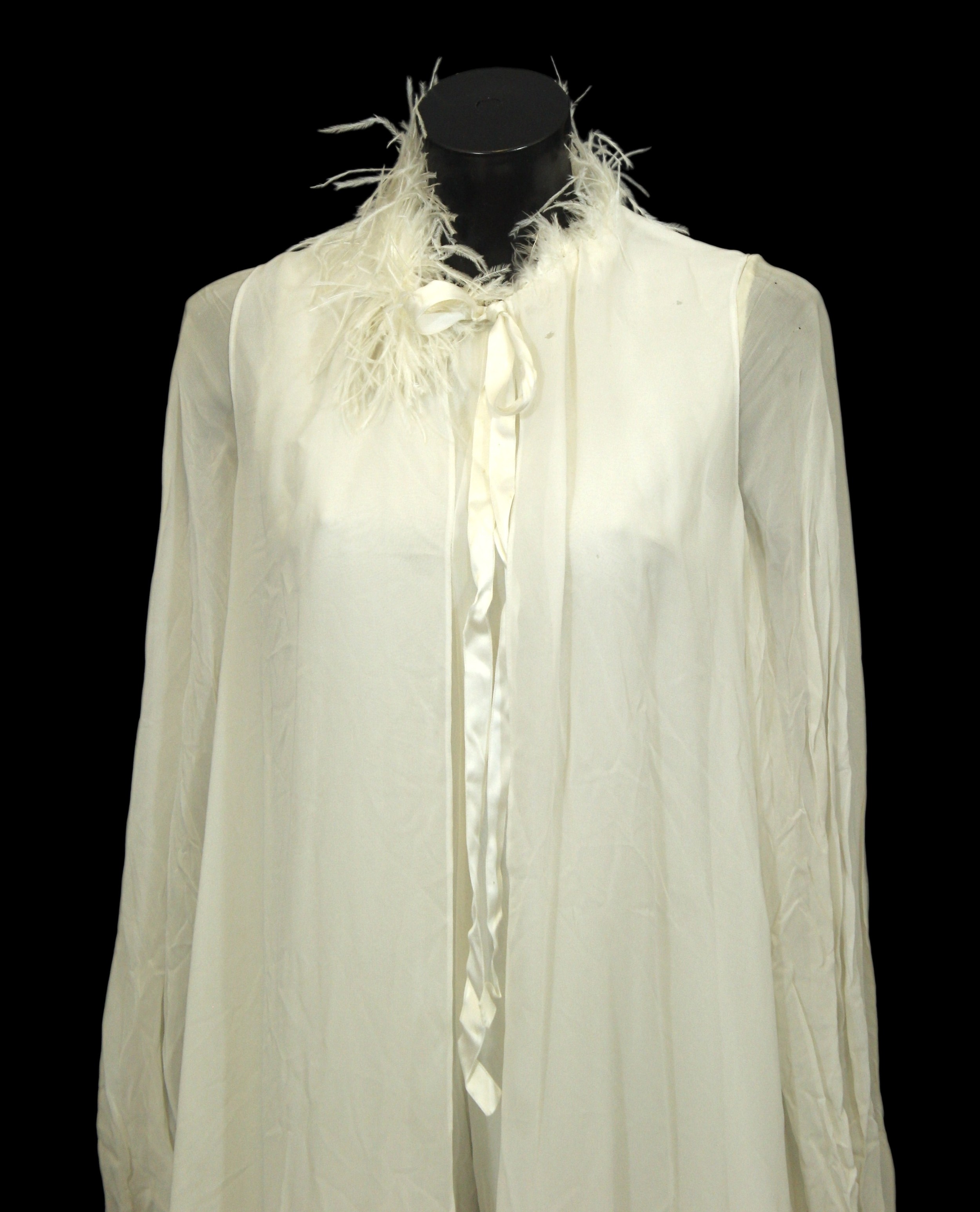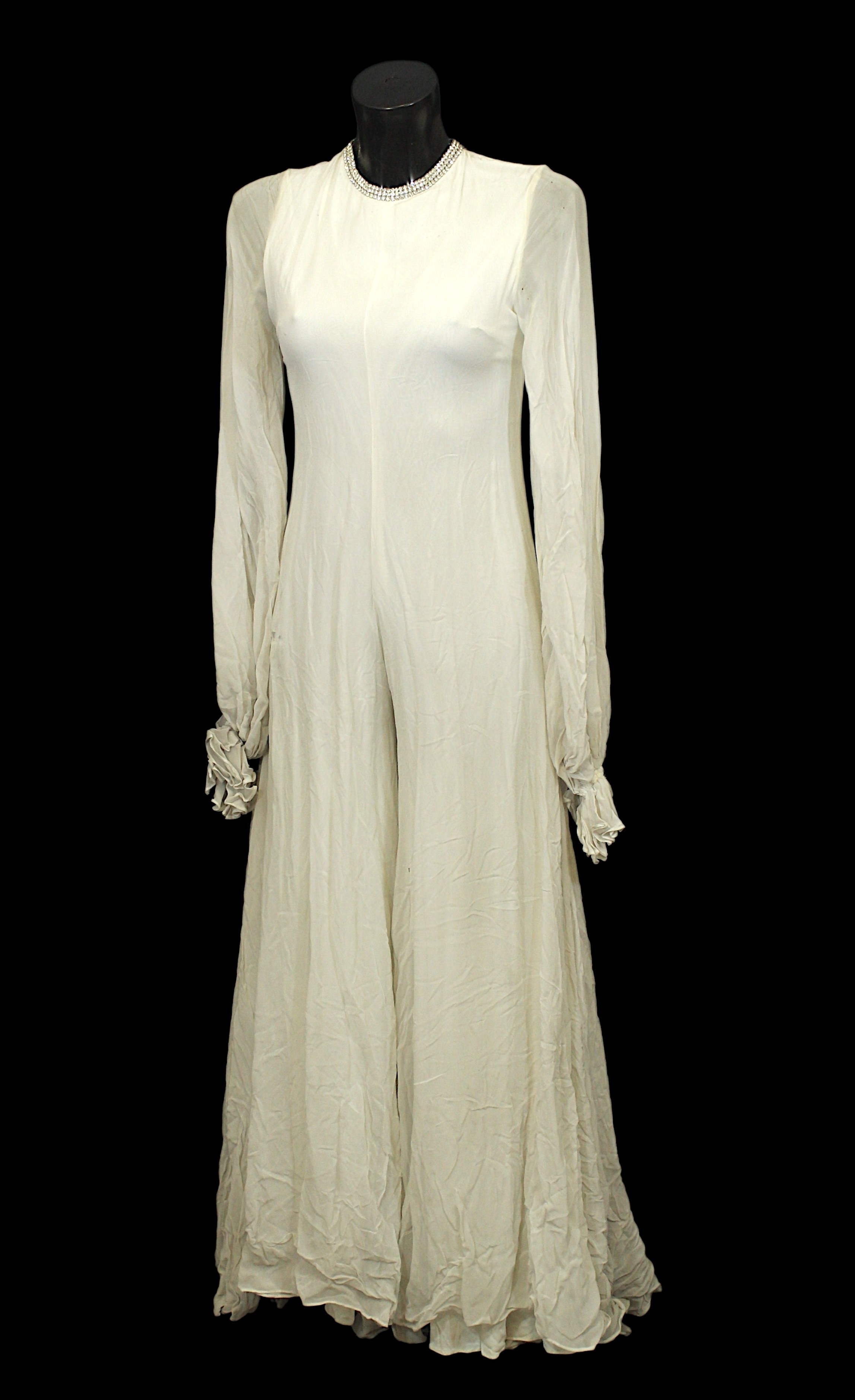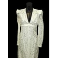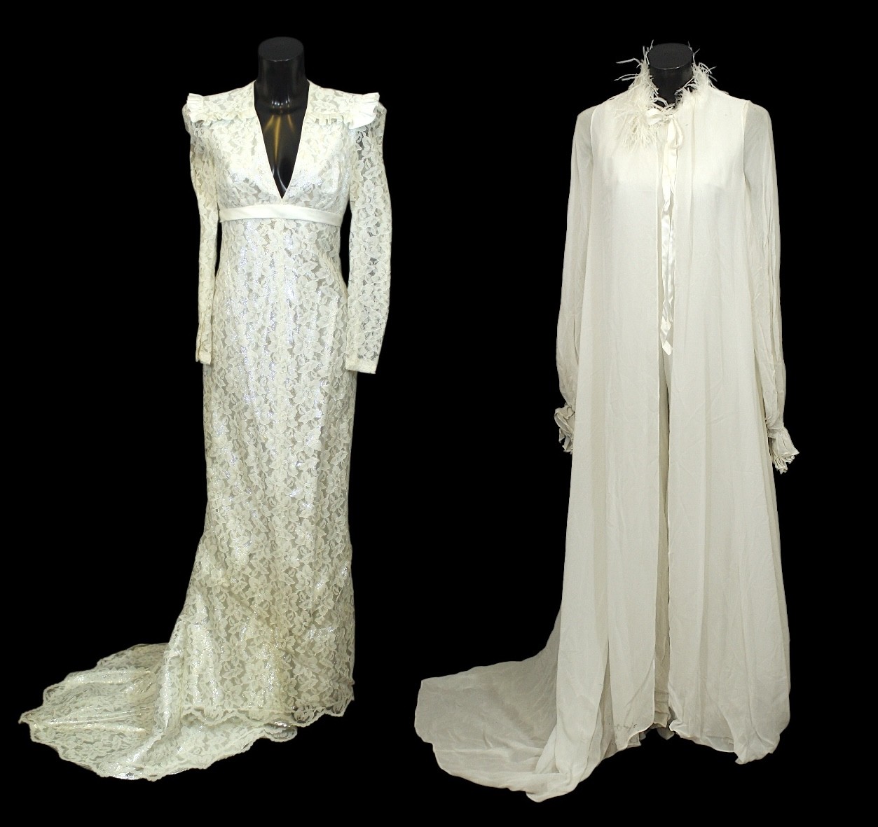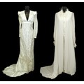 including: a white maxi dress, of floral net with silver mesh, wide collar, with satin effect trim and belt detail, waist flat approximately 32cm; a two piece ensemble in the manner of Jean Varon, comprising white chiffon effect evening coat and palazzo jumpsuit, the coat trimmed with feathers to collar, the dress with diamantés to collar waist approximately 34cm (3)