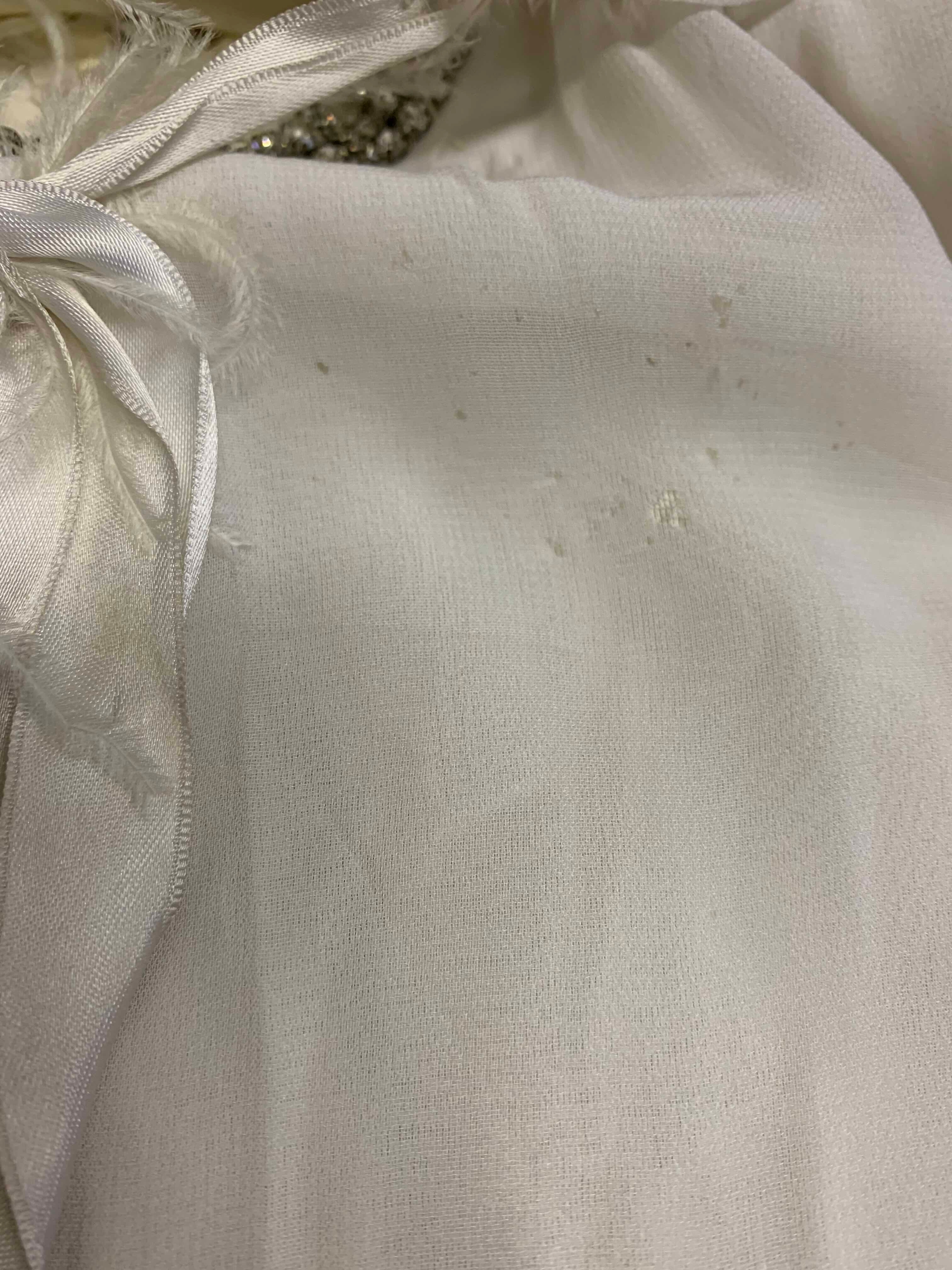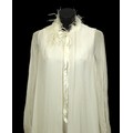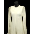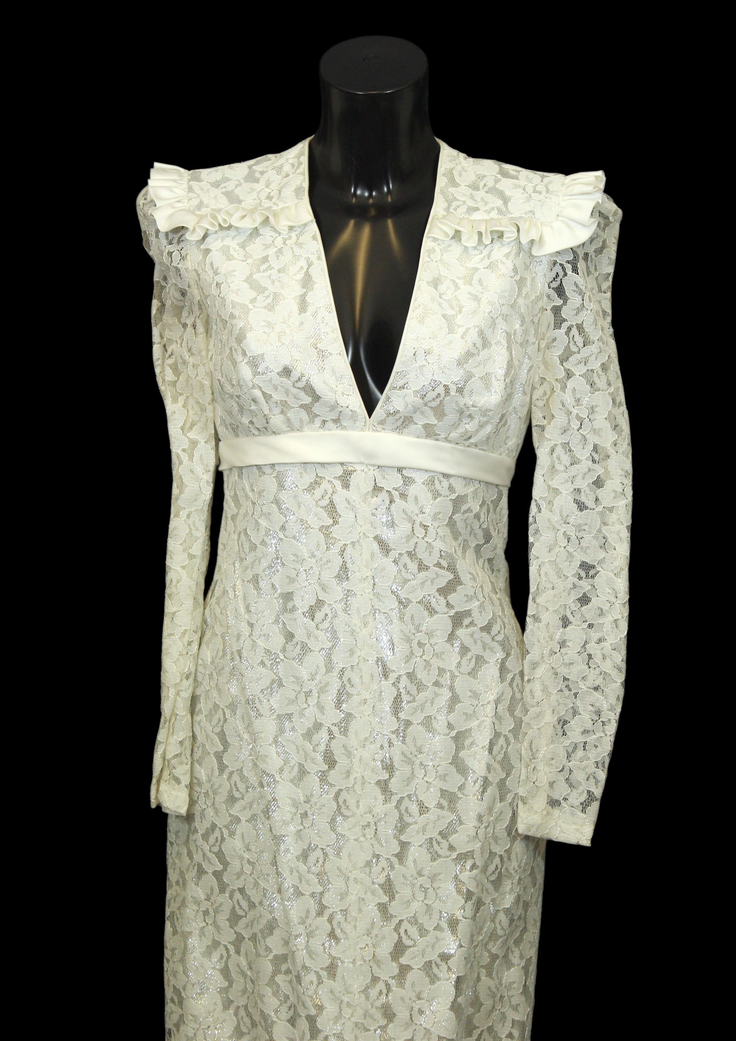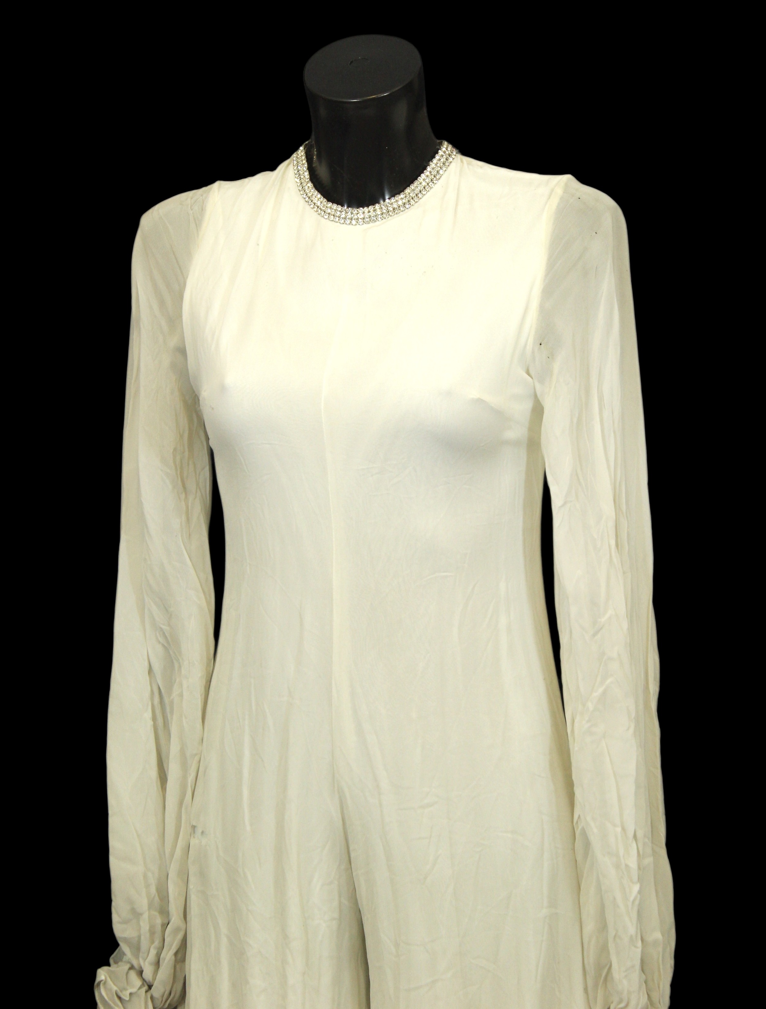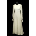 including: a white maxi dress, of floral net with silver mesh, wide collar, with satin effect trim and belt detail, waist flat approximately 32cm; a two piece ensemble in the manner of Jean Varon, comprising white chiffon effect evening coat and palazzo jumpsuit, the coat trimmed with feathers to collar, the dress with diamantés to collar waist approximately 34cm (3)