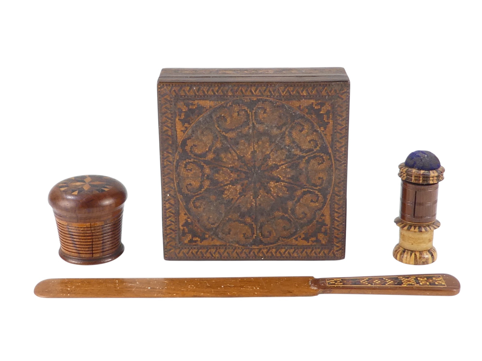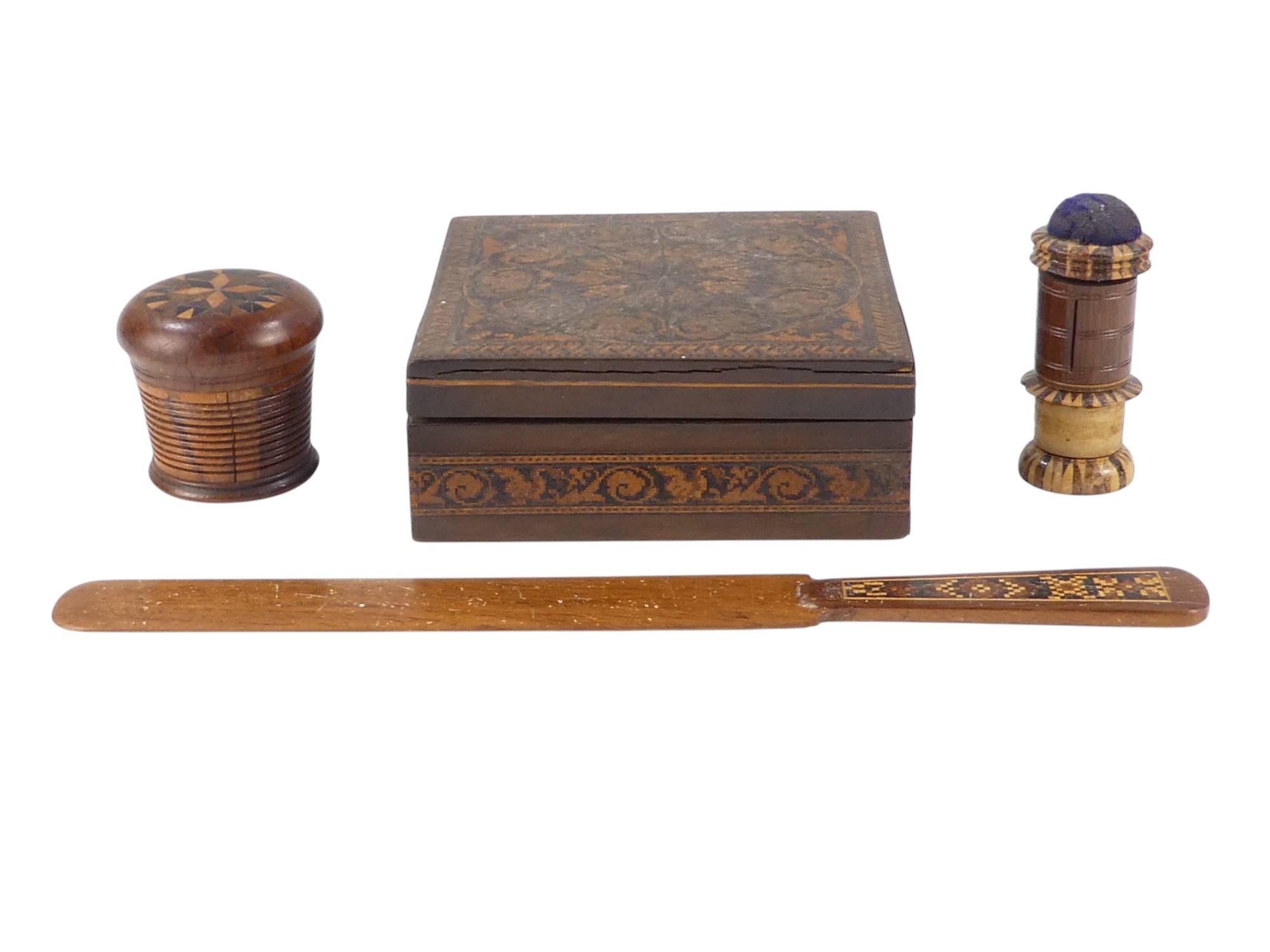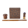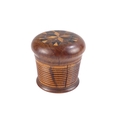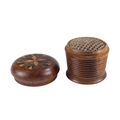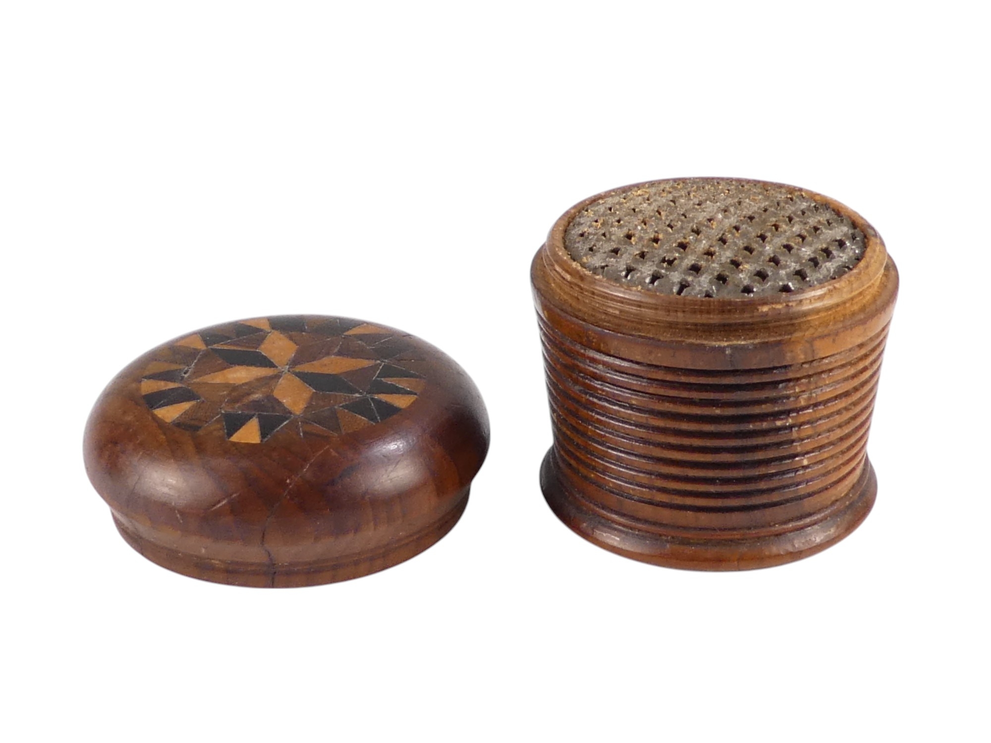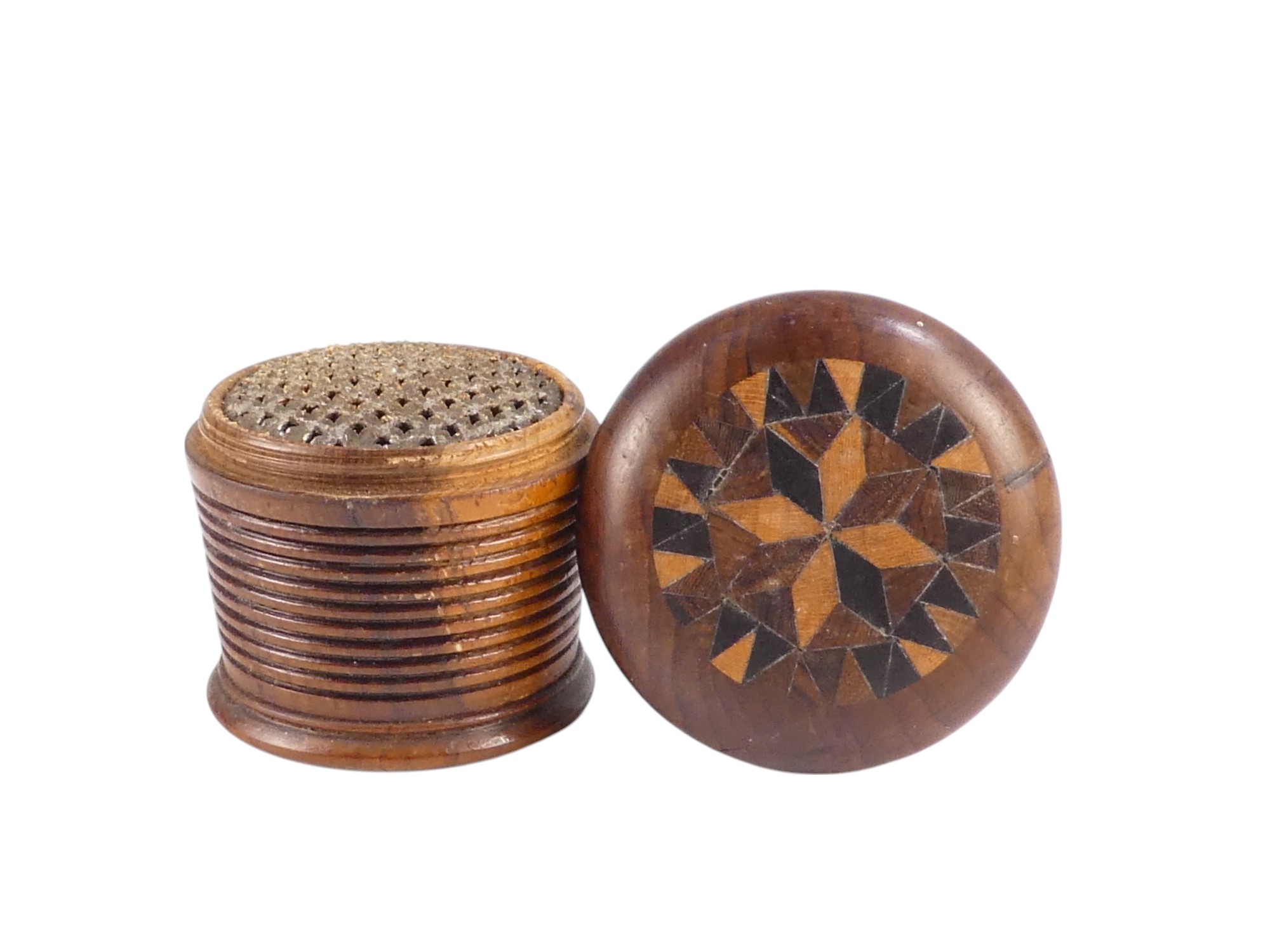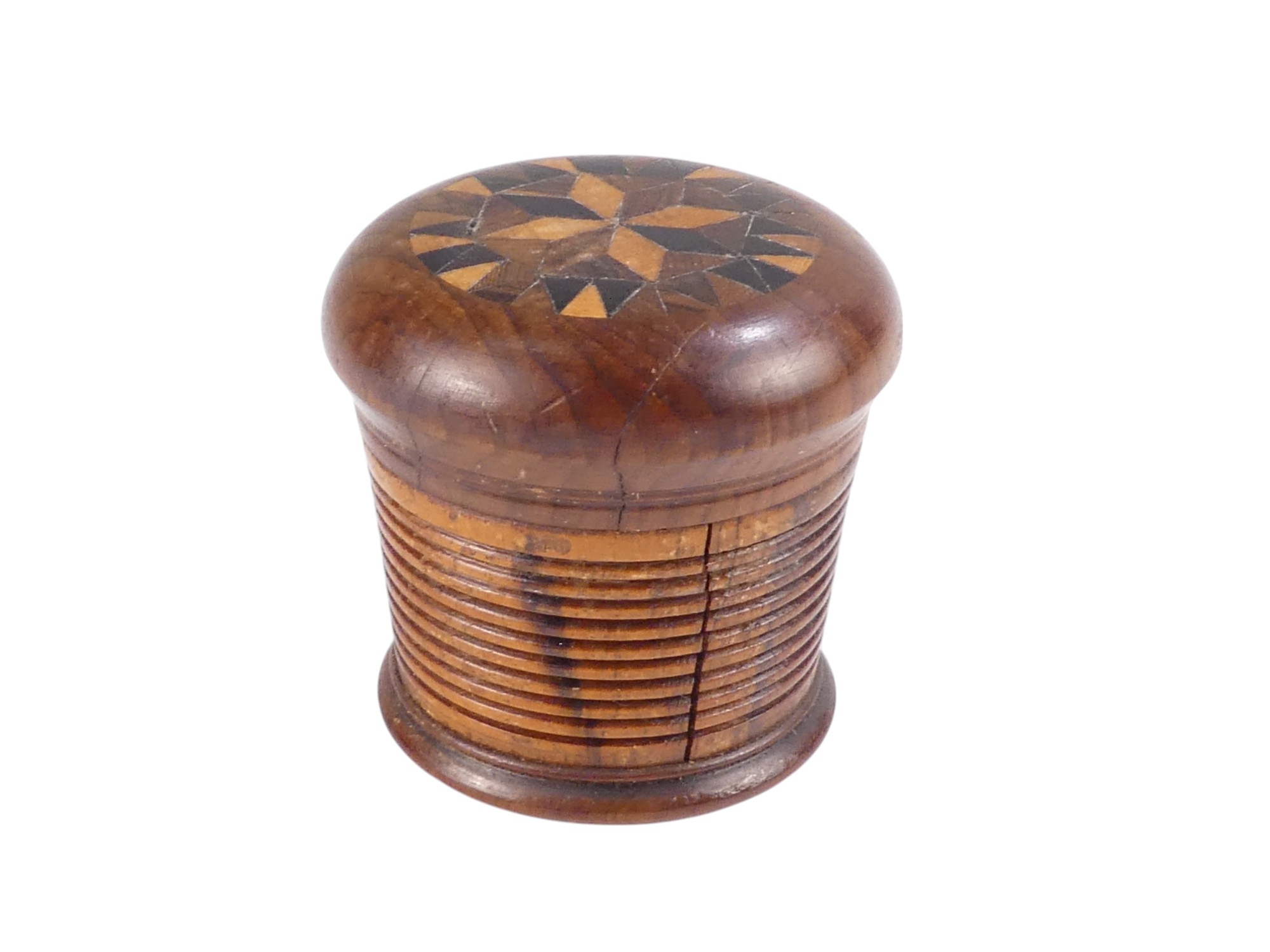 A 19th century Tunbridgeware nutmeg grater - the domed marquetry top above a tapering ribbed body and enclosing a steel grater, 5cm high, together with three other marquetry treen items.