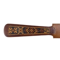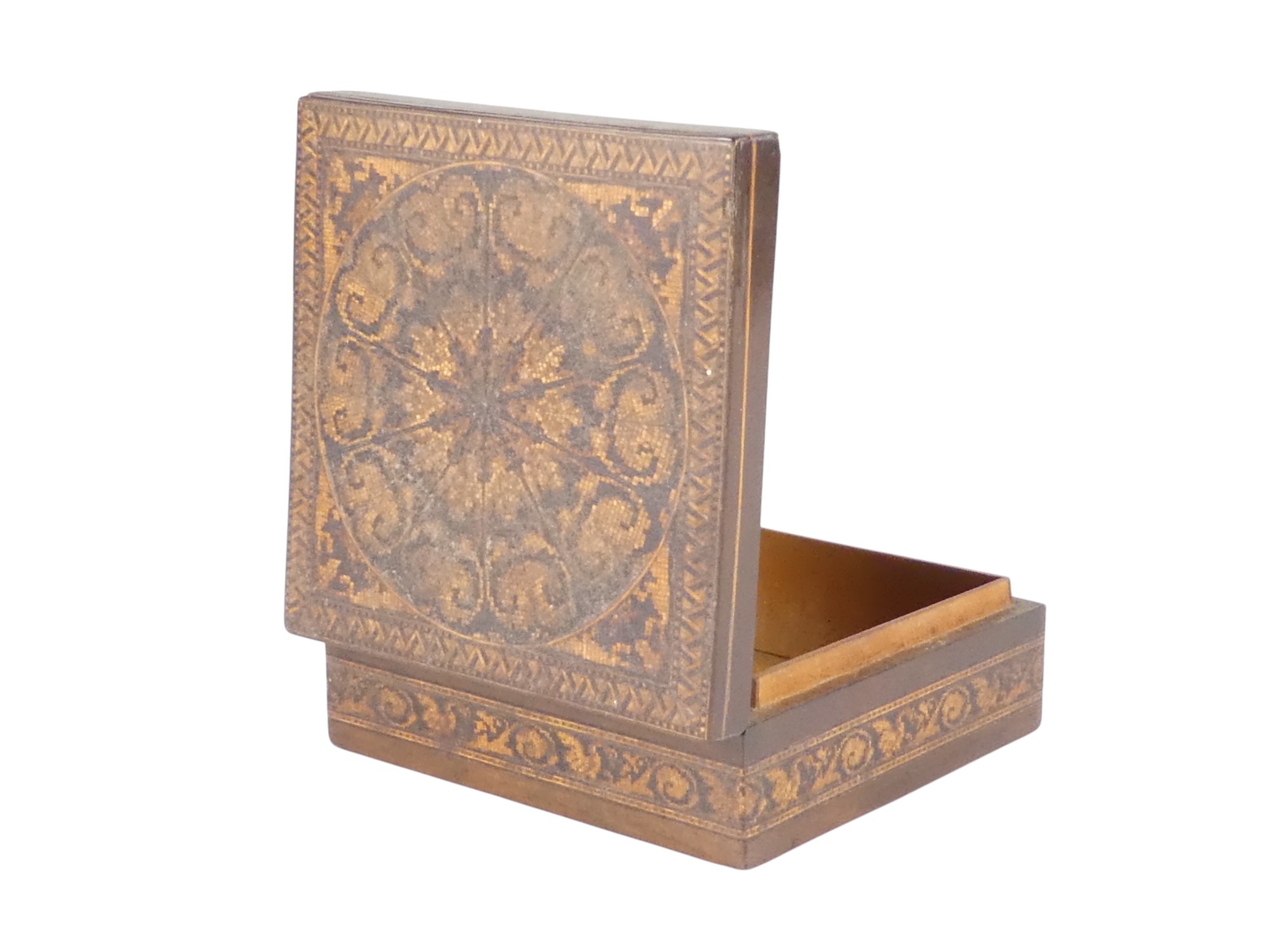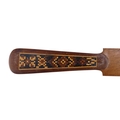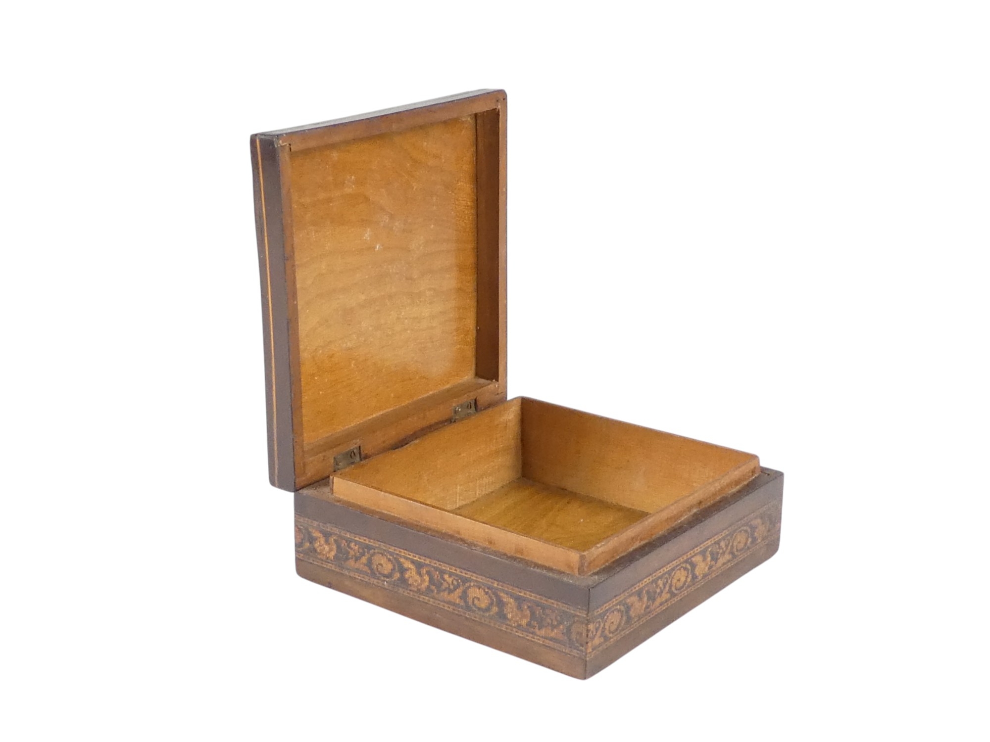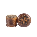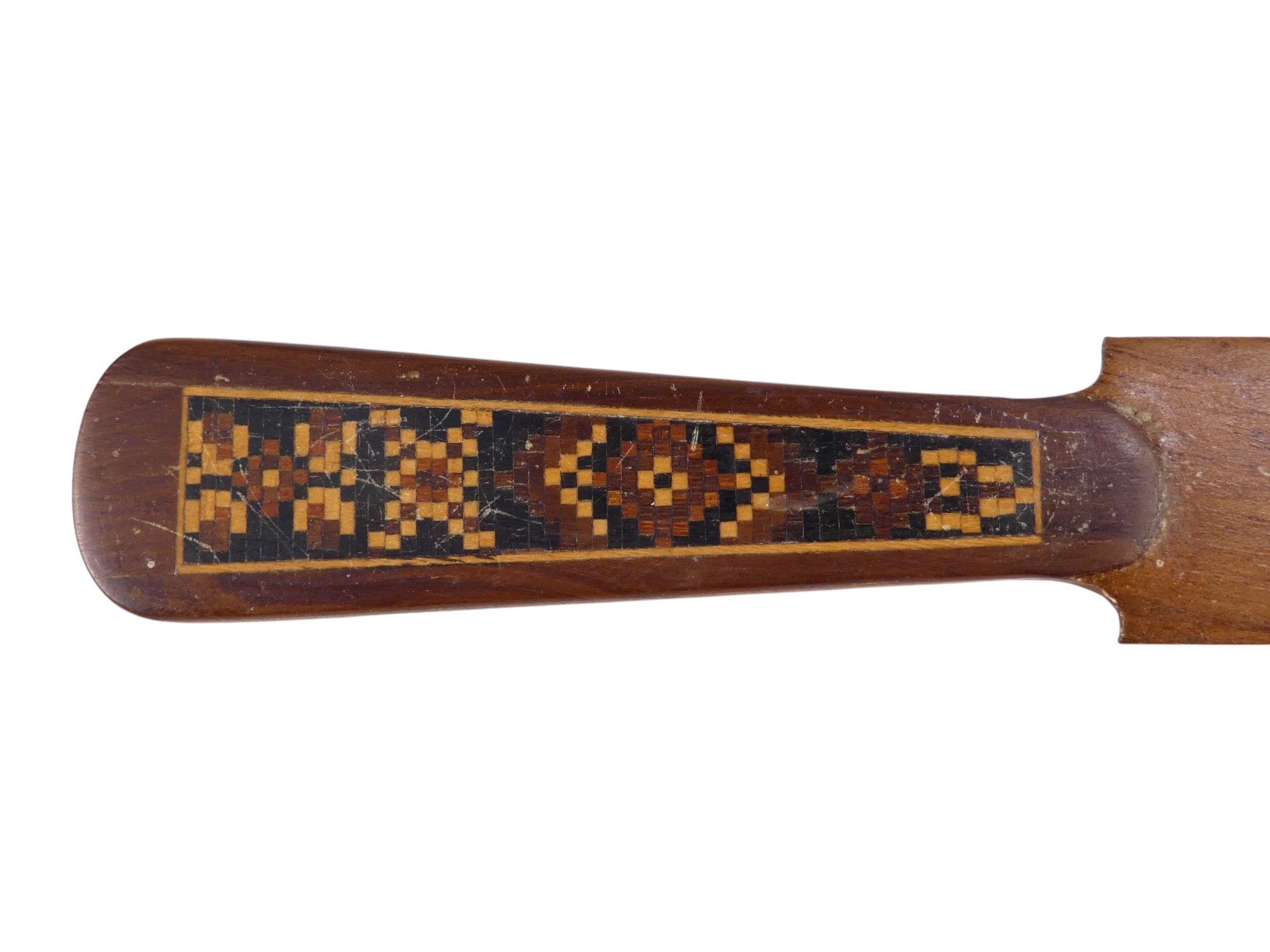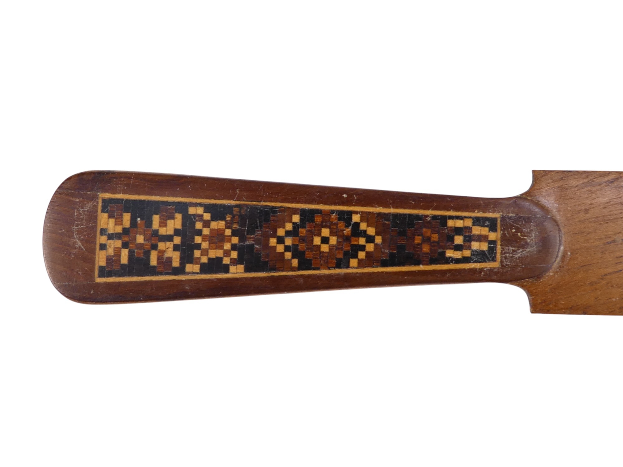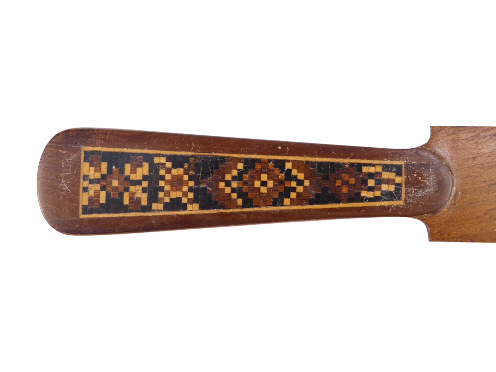A 19th century Tunbridgeware nutmeg grater - the domed marquetry top above a tapering ribbed body and enclosing a steel grater, 5cm high, together with three other marquetry treen items.