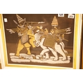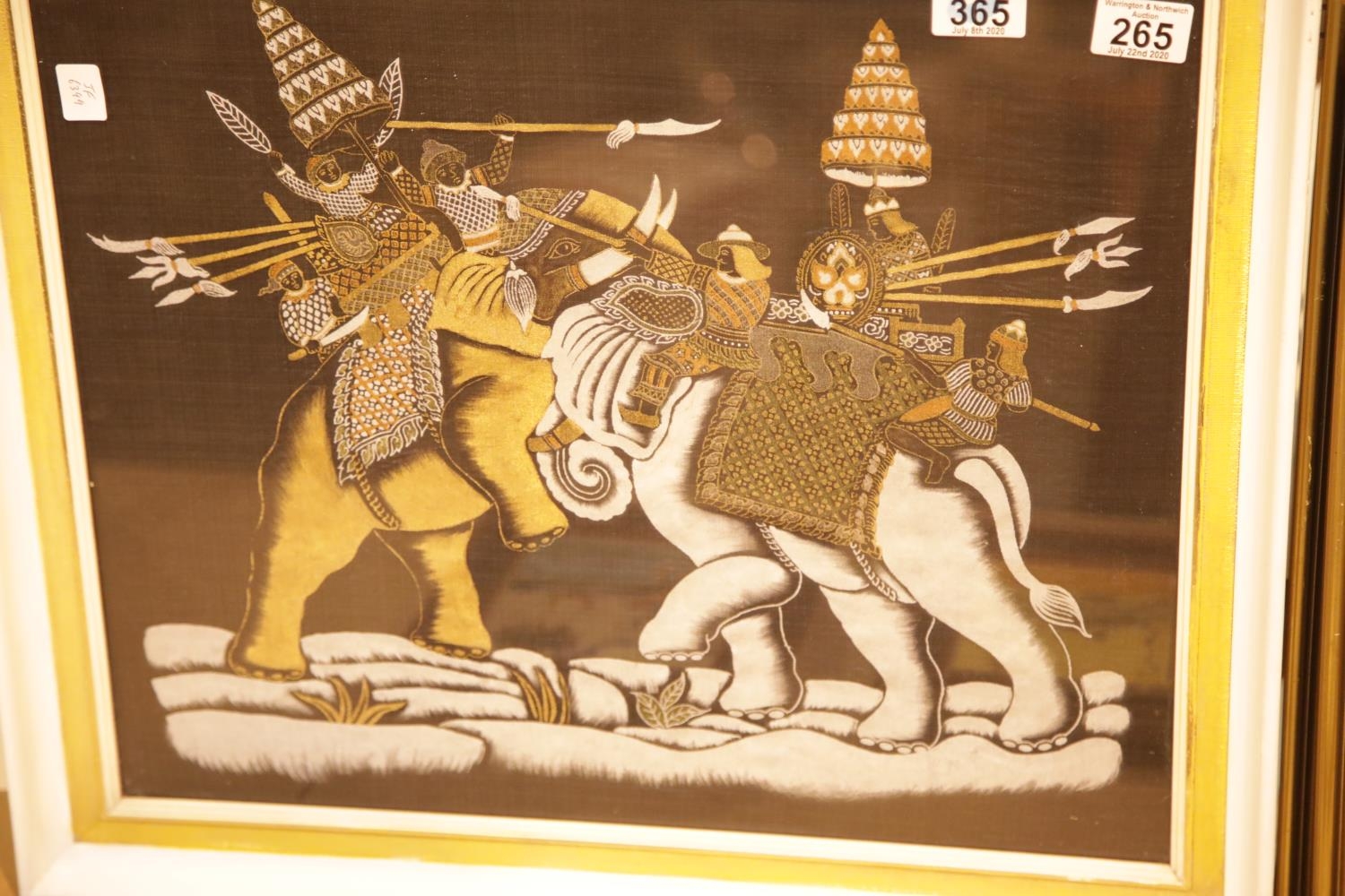 Framed and glazed fighting elephants print on cotton. This lot is not available for in-house P&P.