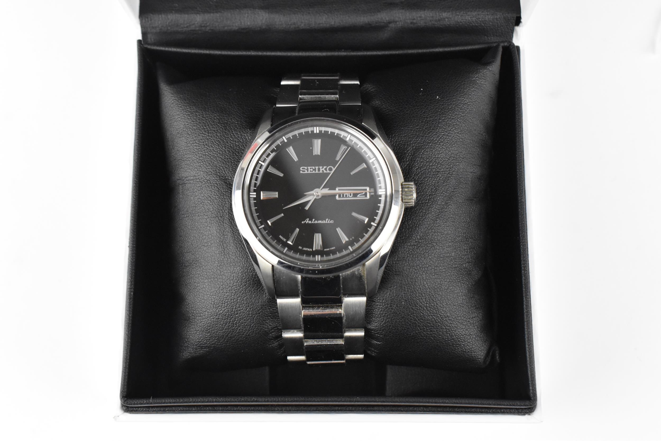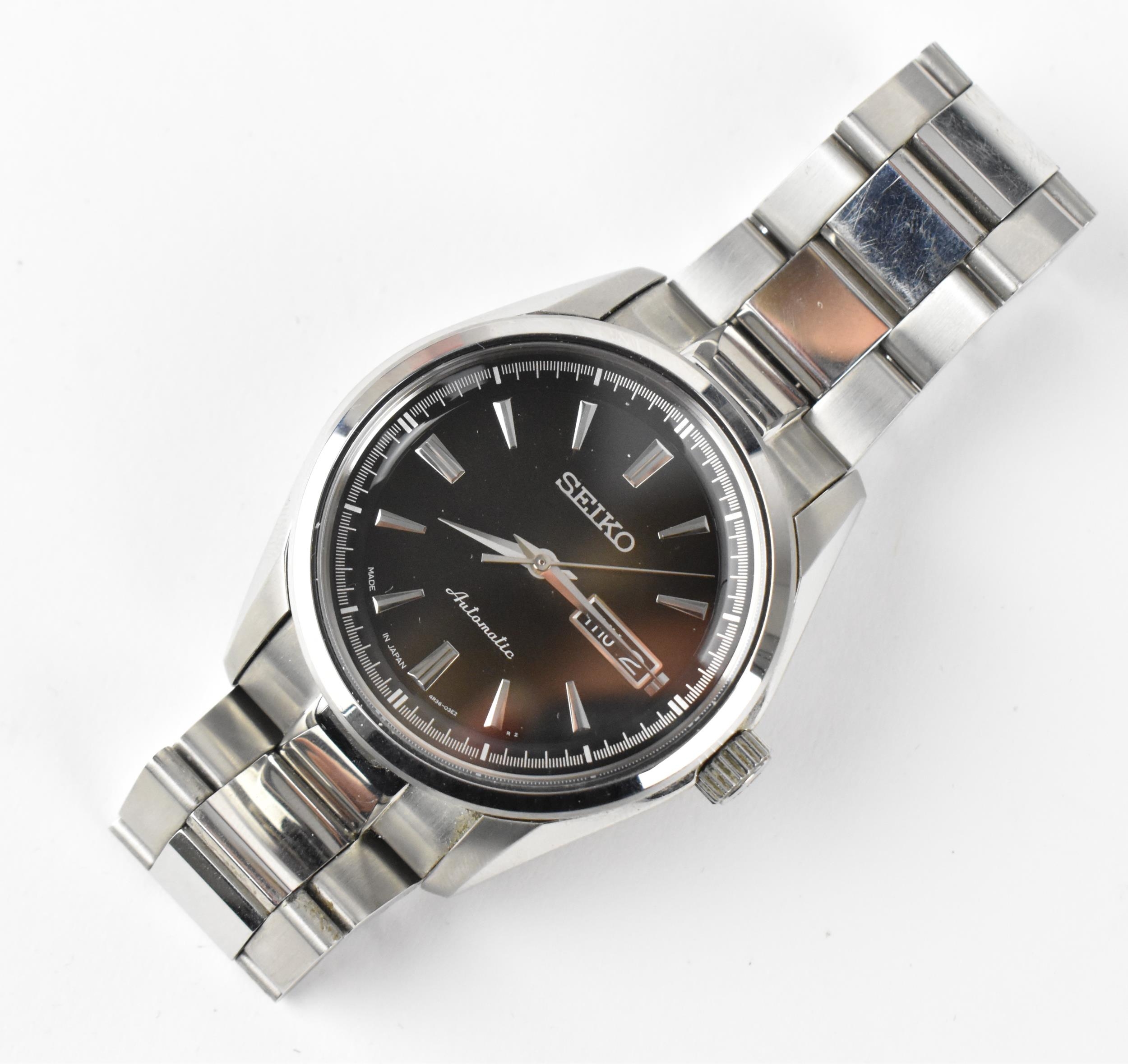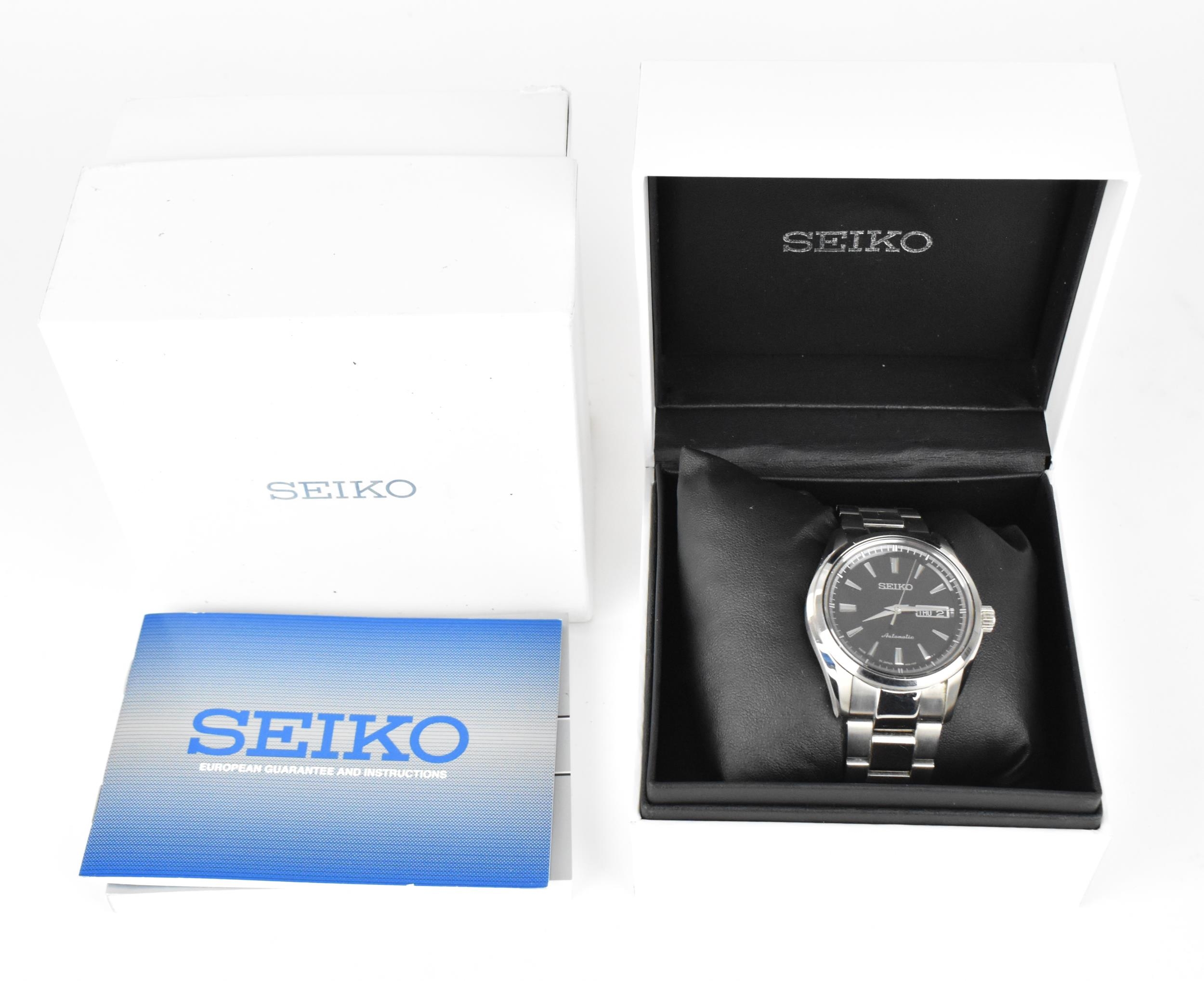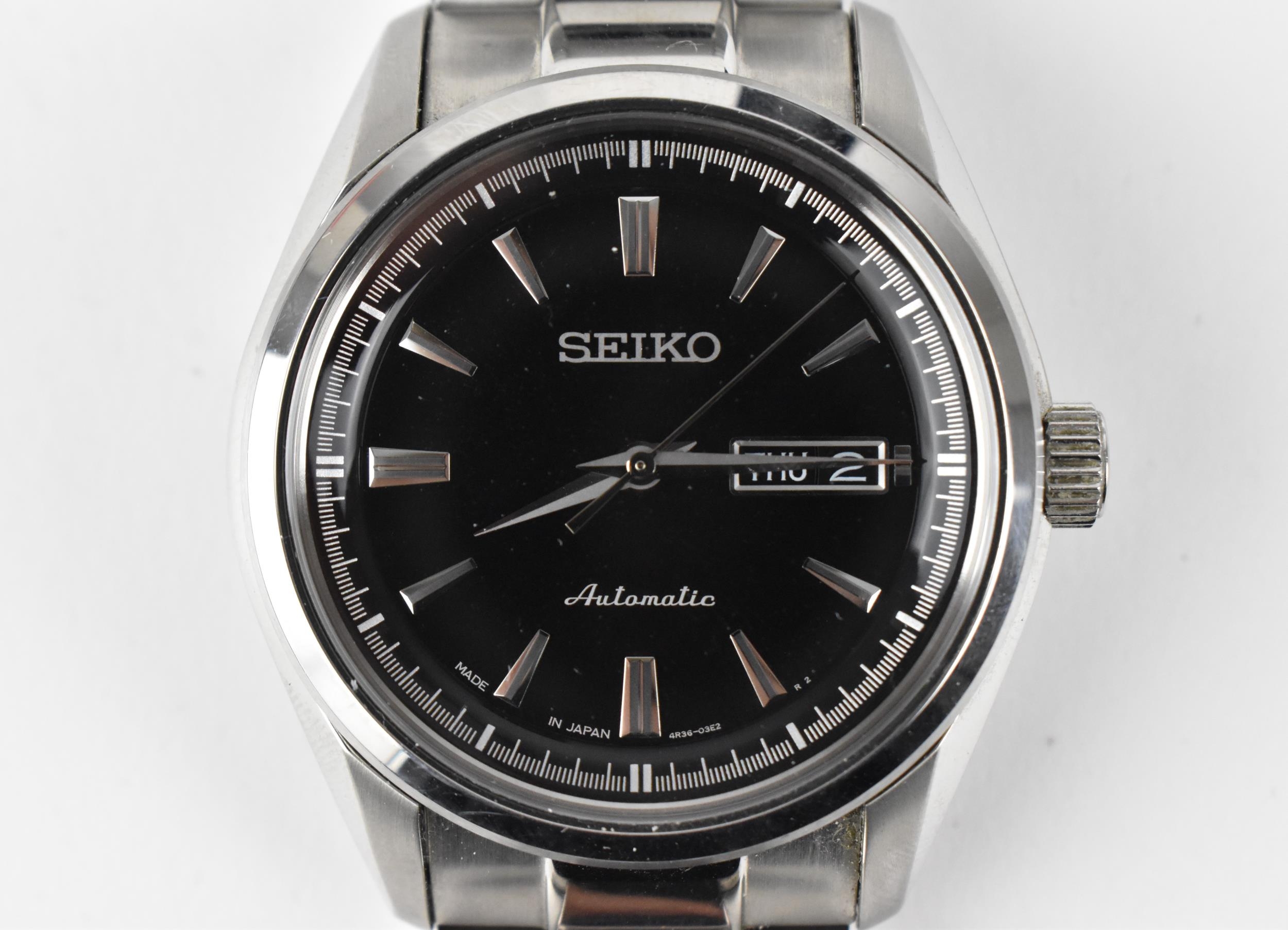 A Seiko, automatic, gents, stainless steel wristwatch, circa 2017, model 4R36-03H0, having a black dial with baton markers, centre seconds, day and date aperture at '3', stainless steel bracelet, with exhibition case back, with original box and paperwork, 42mm