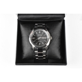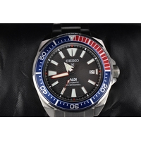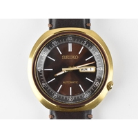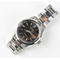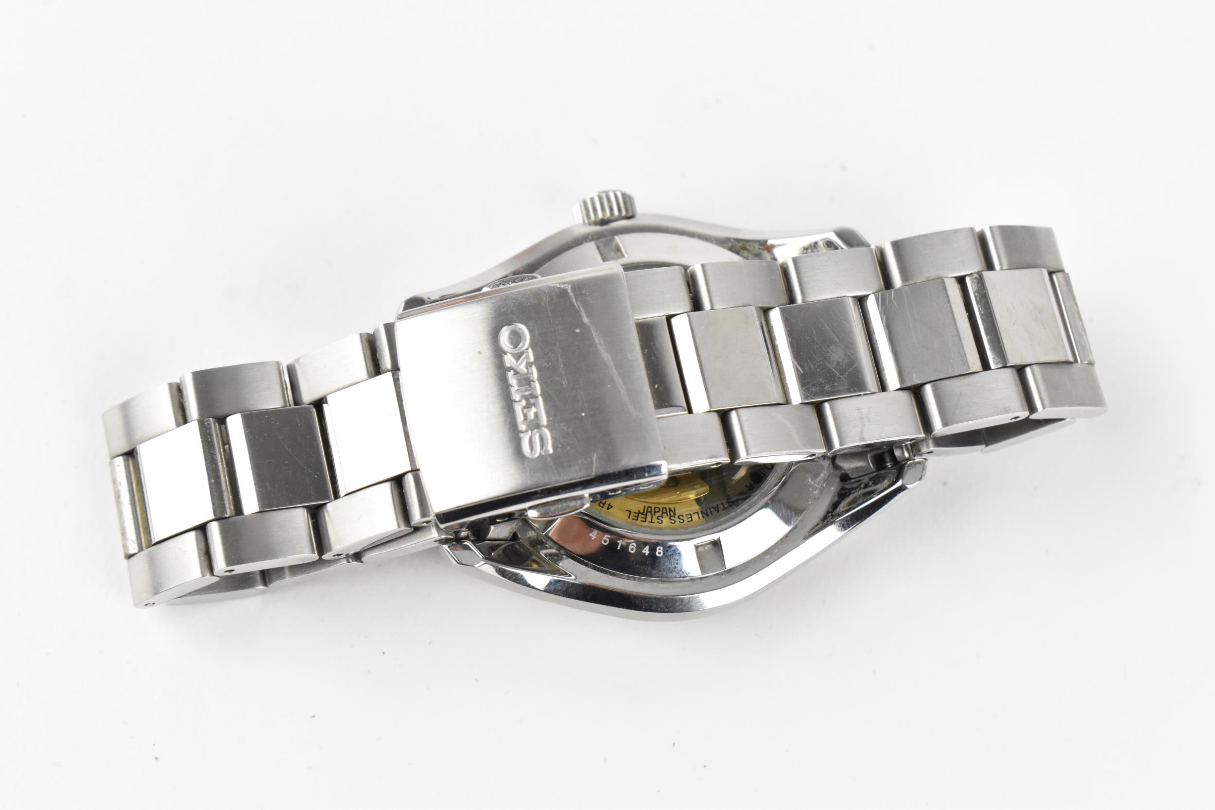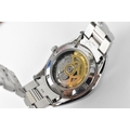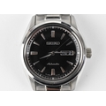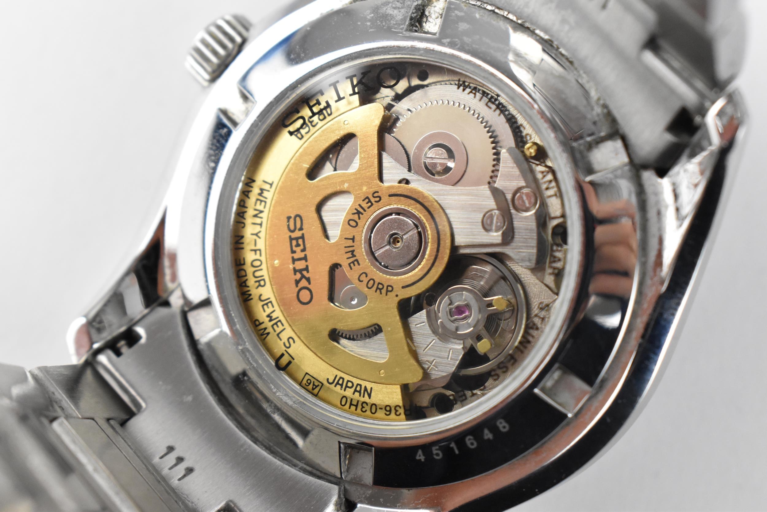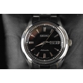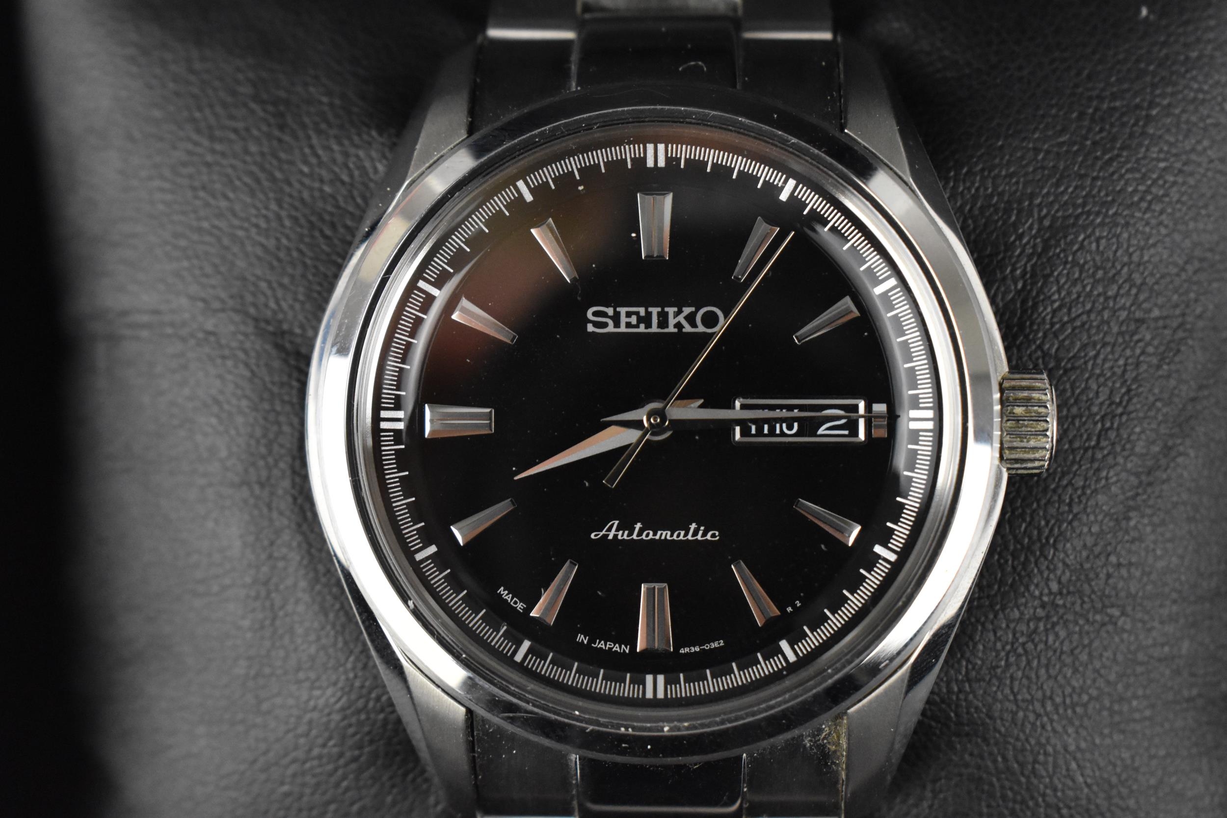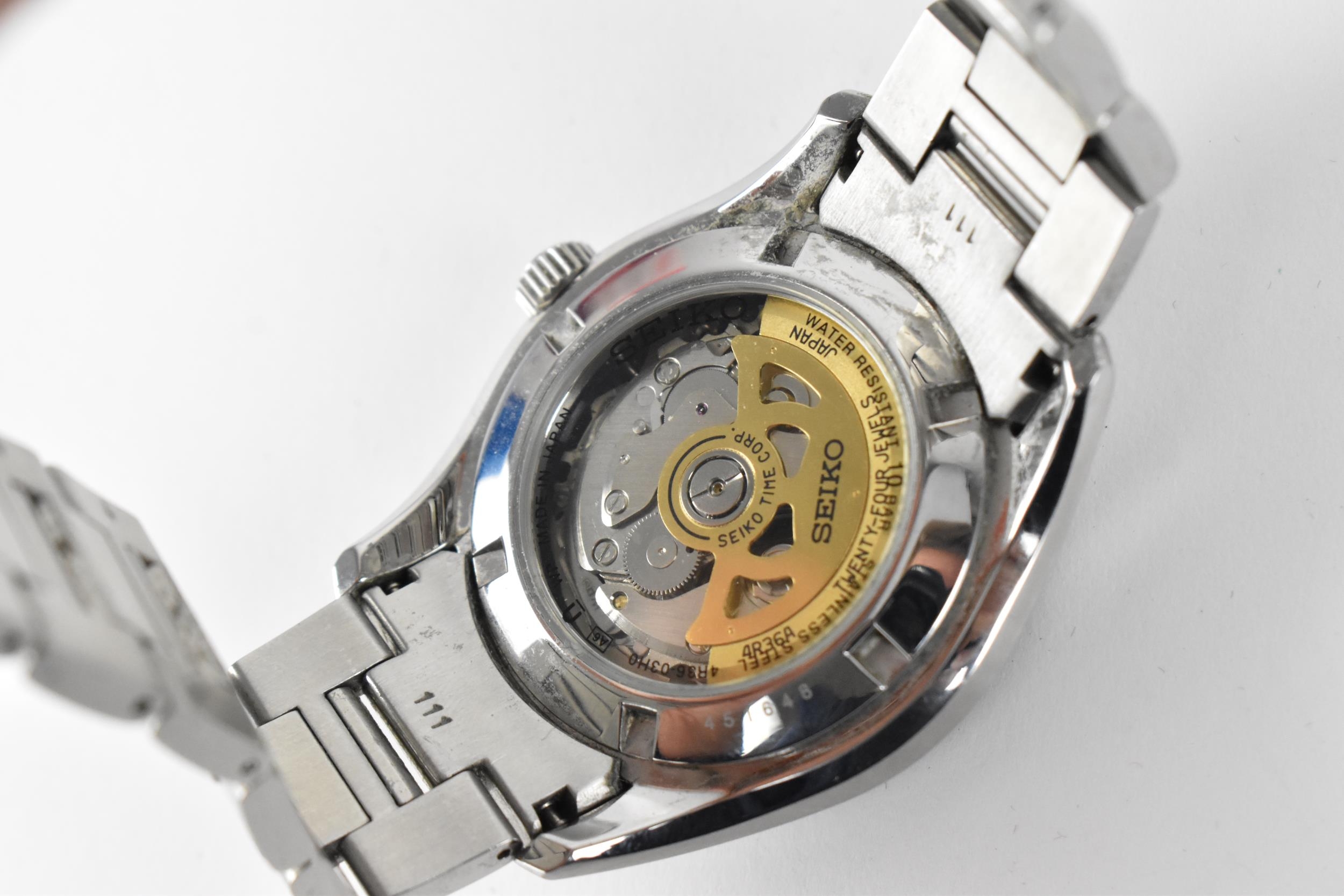 A Seiko, automatic, gents, stainless steel wristwatch, circa 2017, model 4R36-03H0, having a black dial with baton markers, centre seconds, day and date aperture at '3', stainless steel bracelet, with exhibition case back, with original box and paperwork, 42mm