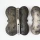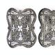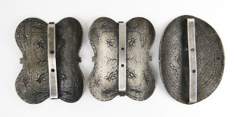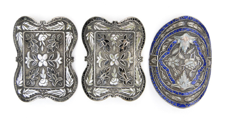Three enamel and silver coloured metal shoe buckles with floral decoration, each approximately 5cm in length