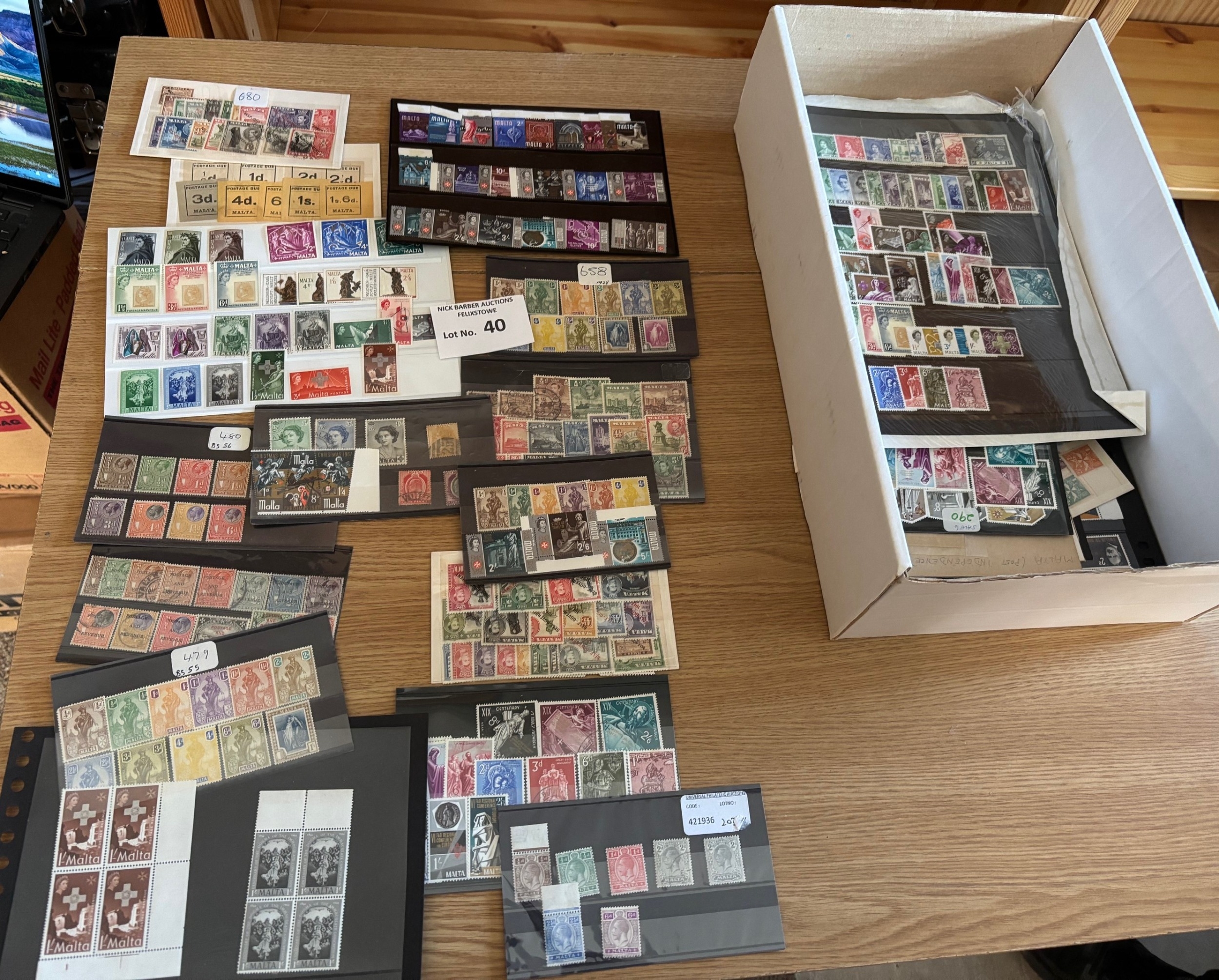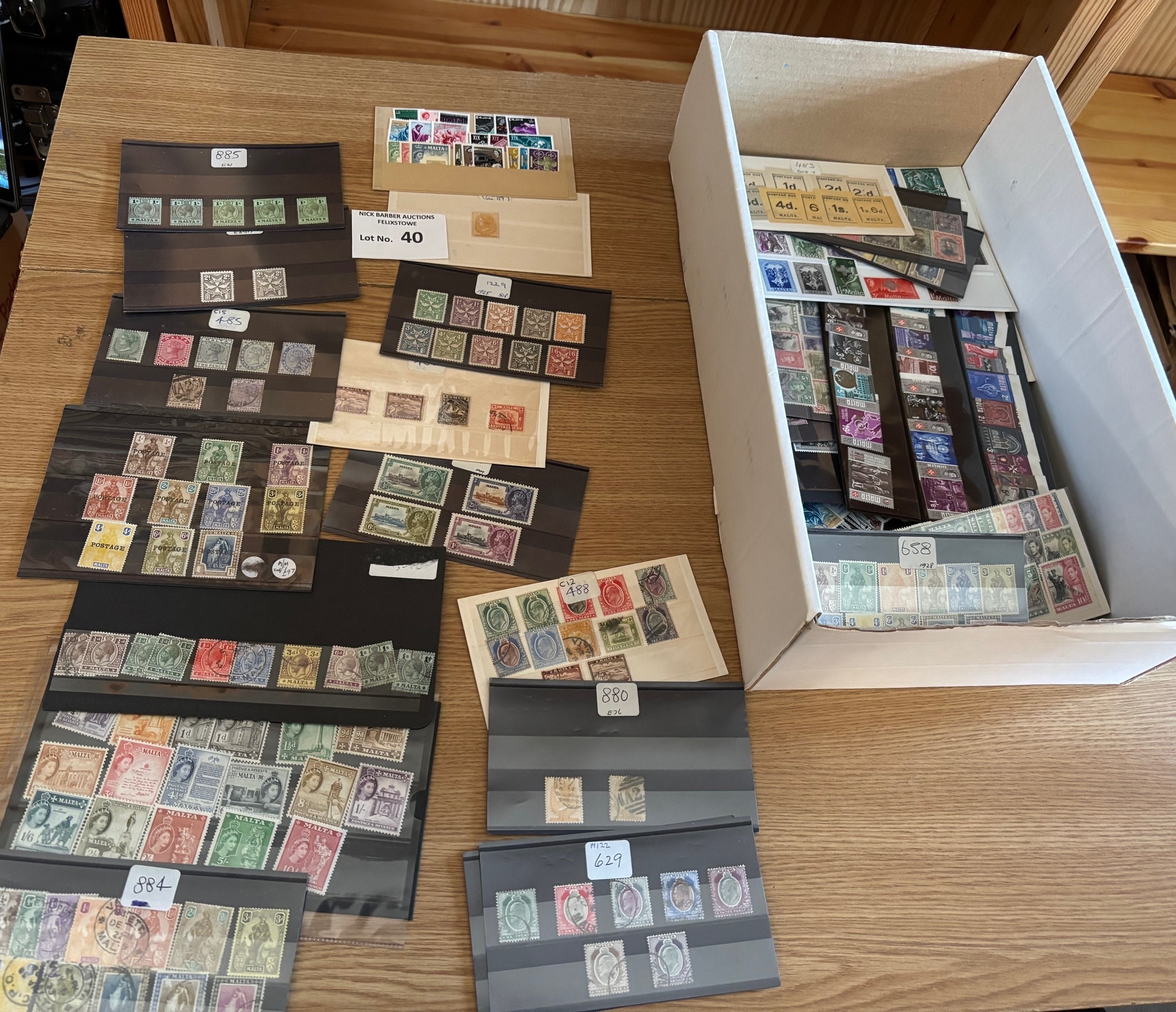 Stamps : Malta. Box containing old auction lots mostly on stock cards including many of the elusive higher values. Loads of complete mint sets. Huge amount to sort through.