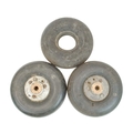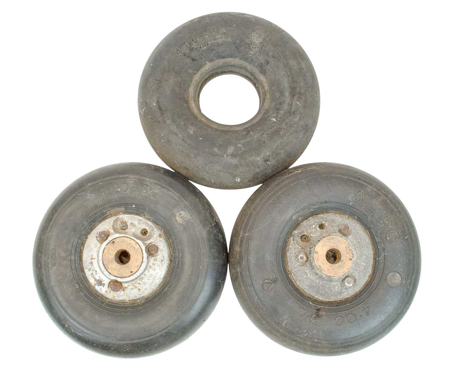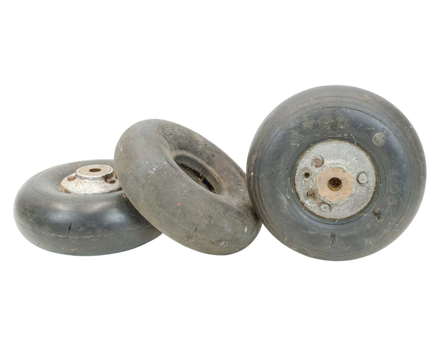 Two WWII RAF Hurricane aircraft tail wheels. The aluminium hubs stamped with serial and other numbers, the tyres marked 'electrically conducting', diameter 26cm, and a spare tyre (3).