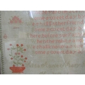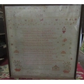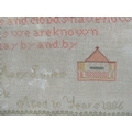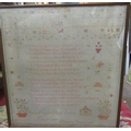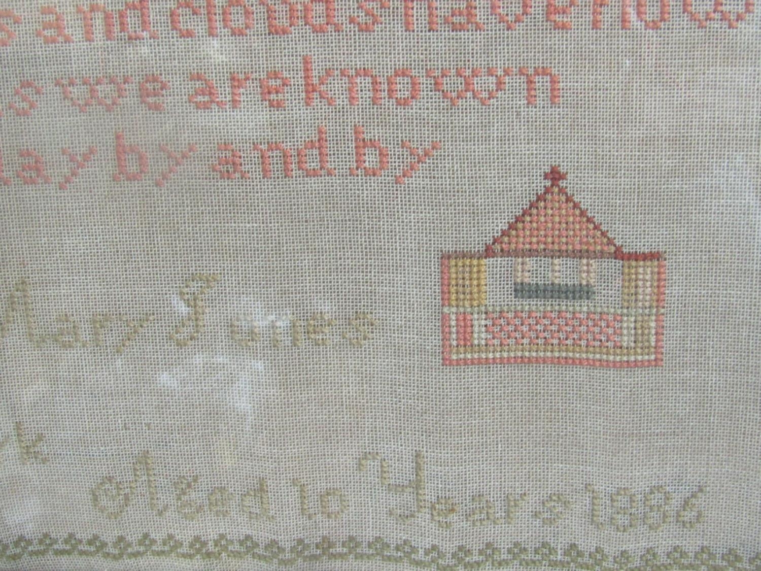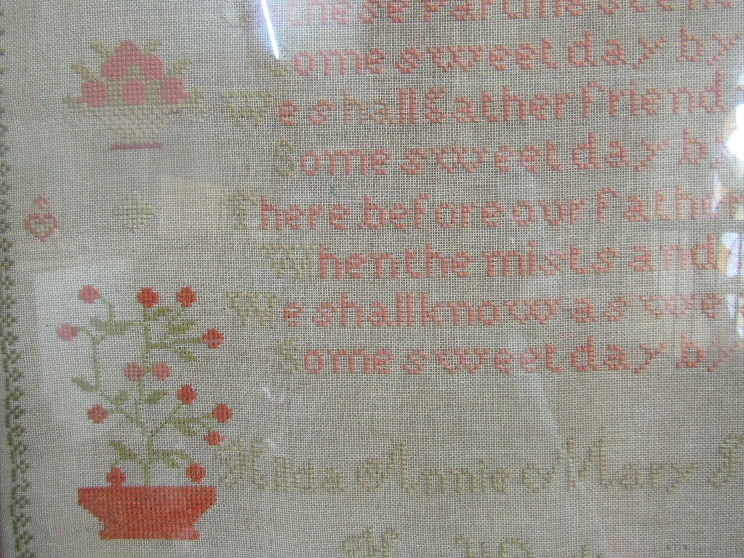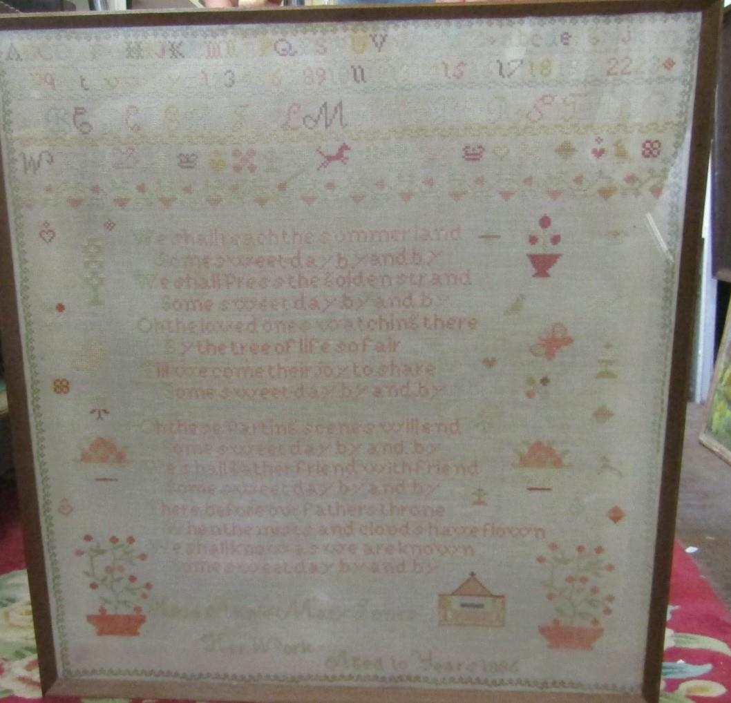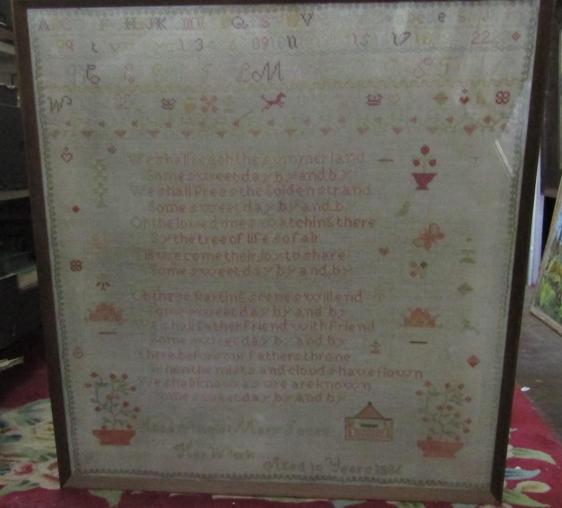 A late 19th century cross stitch needlework sampler by Hilda Annie Mary Jones aged 10 years, dated 1886, incorporating flower vases, verse, alphabet, etc, 63.5 x 59cm approx, framed