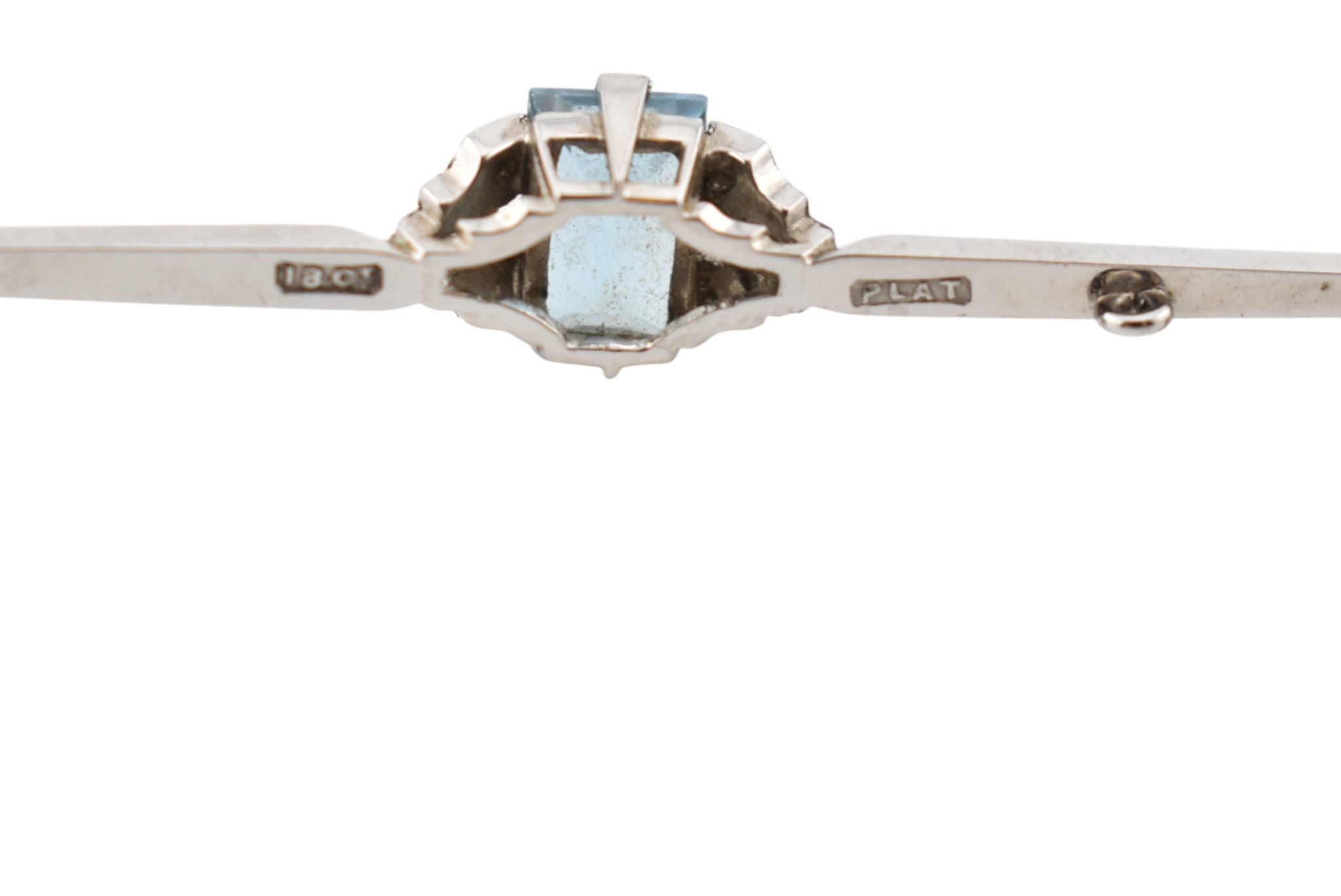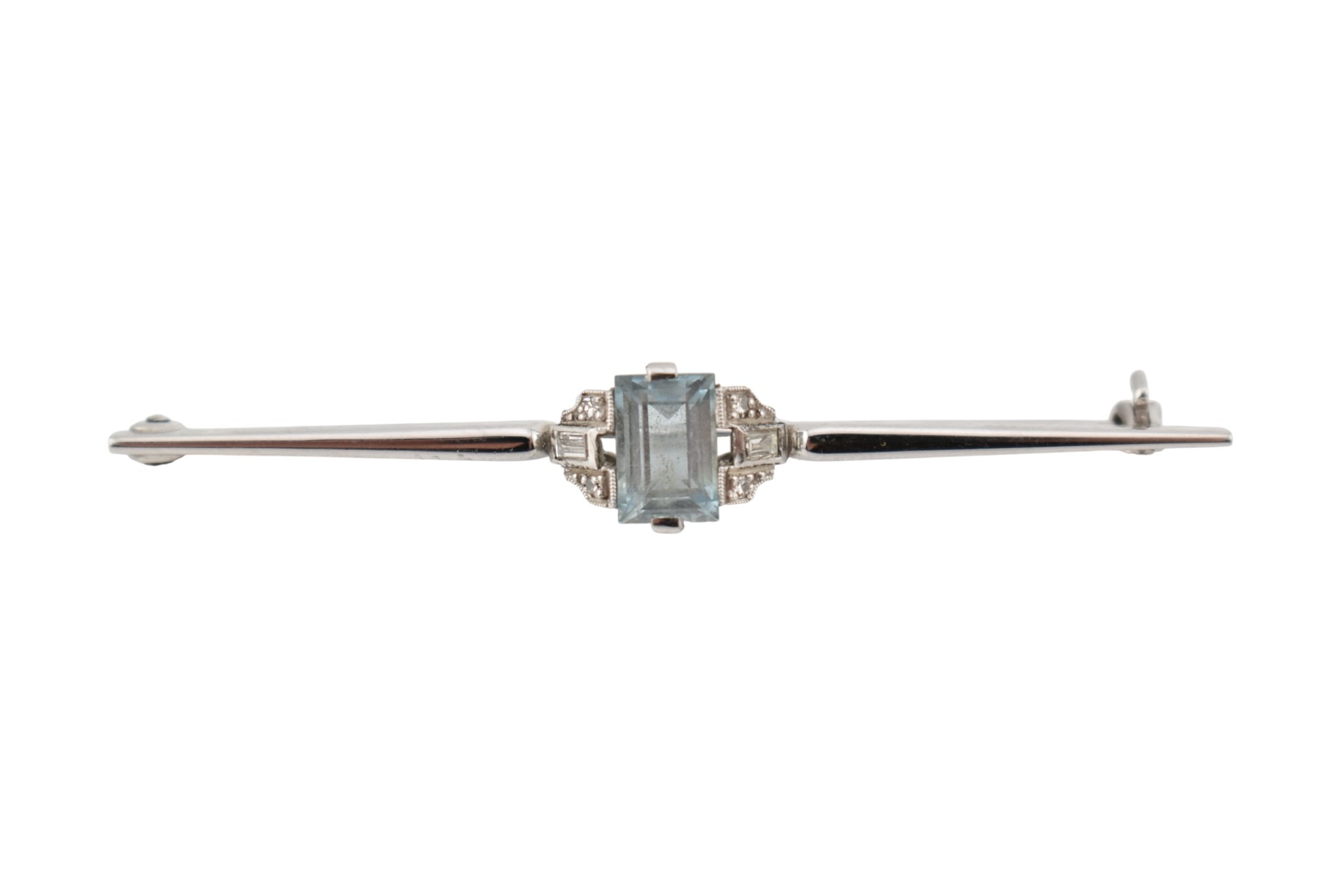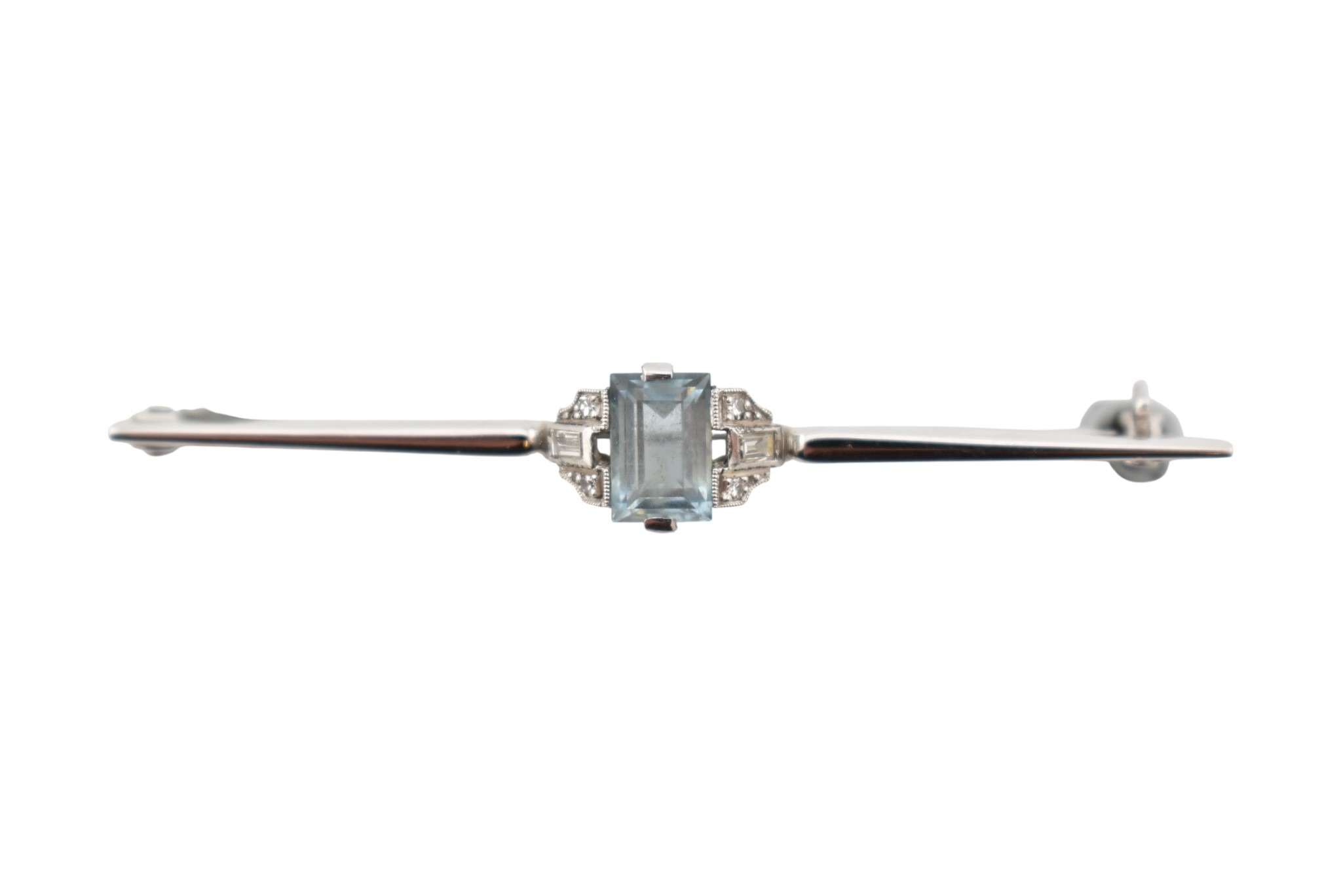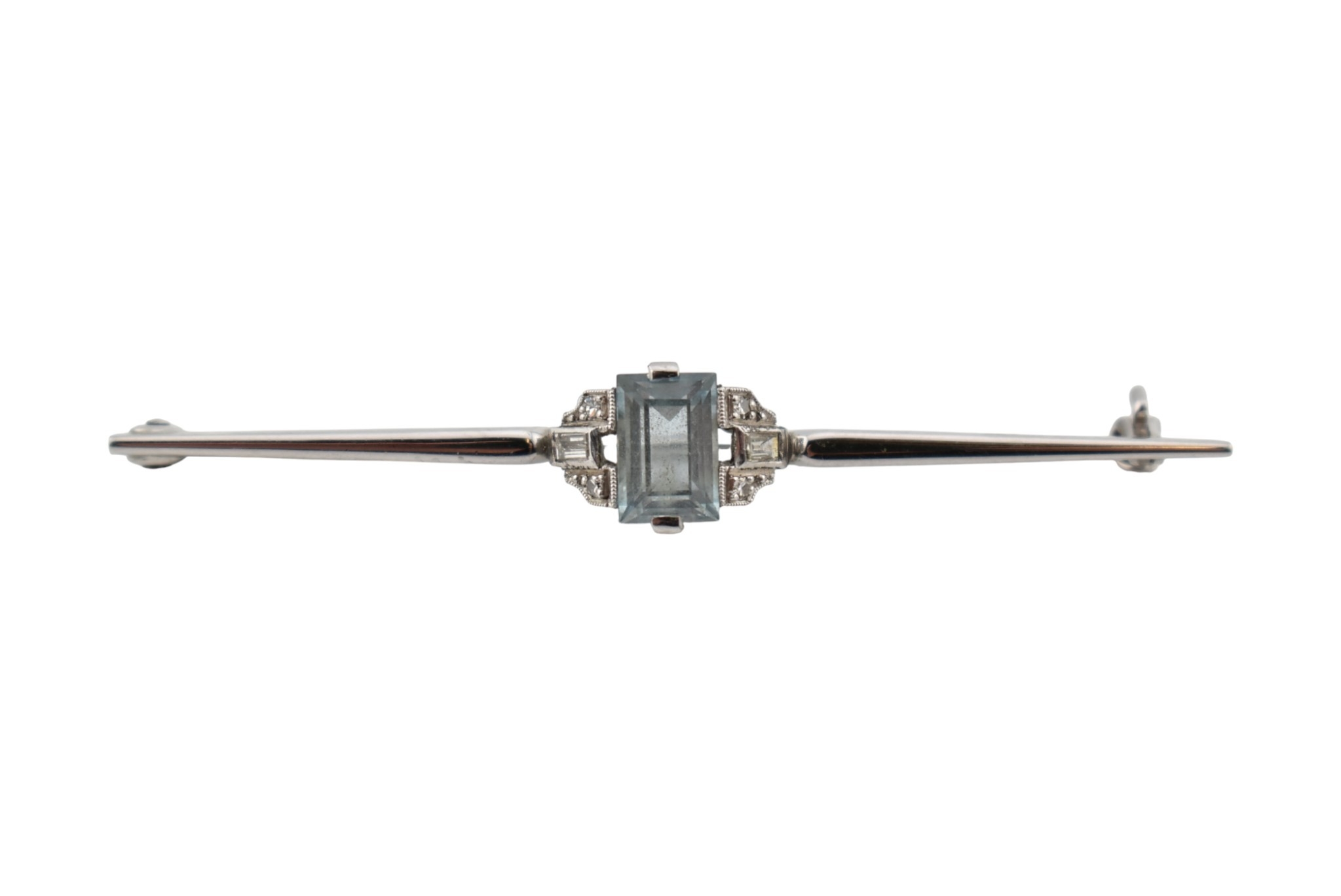 An Art Deco 18ct gold, platinum, aquamarine and diamond bar brooch pin. Stamped 18ct & Plat. Weight 3.8g. Measures 5.7cm.