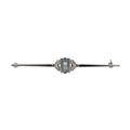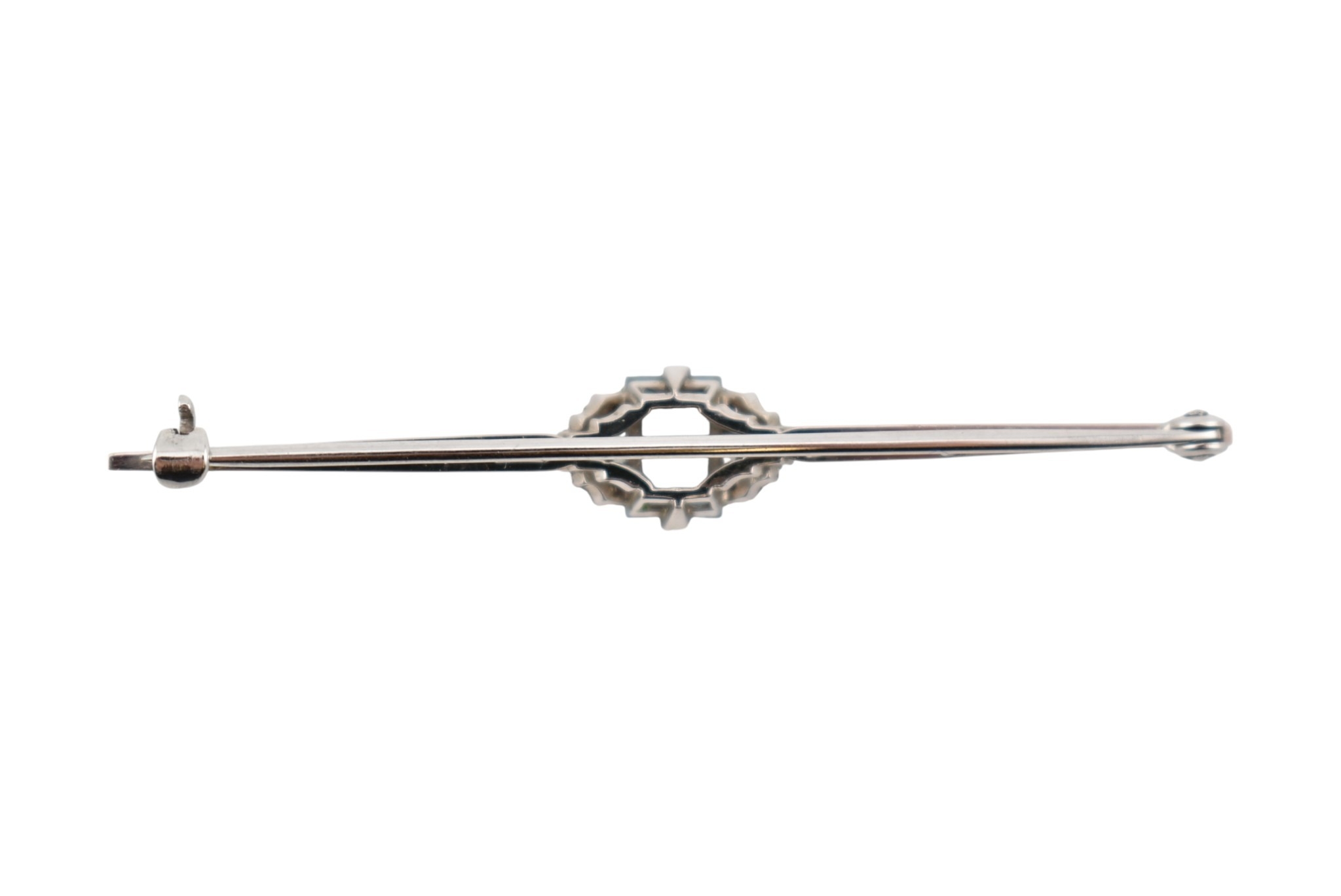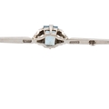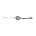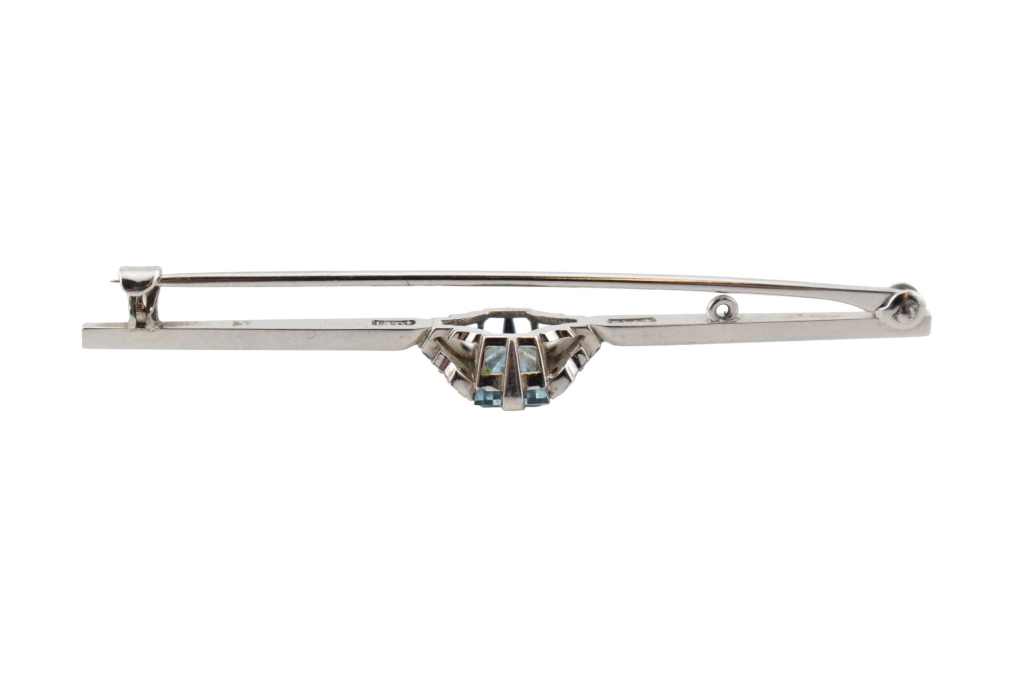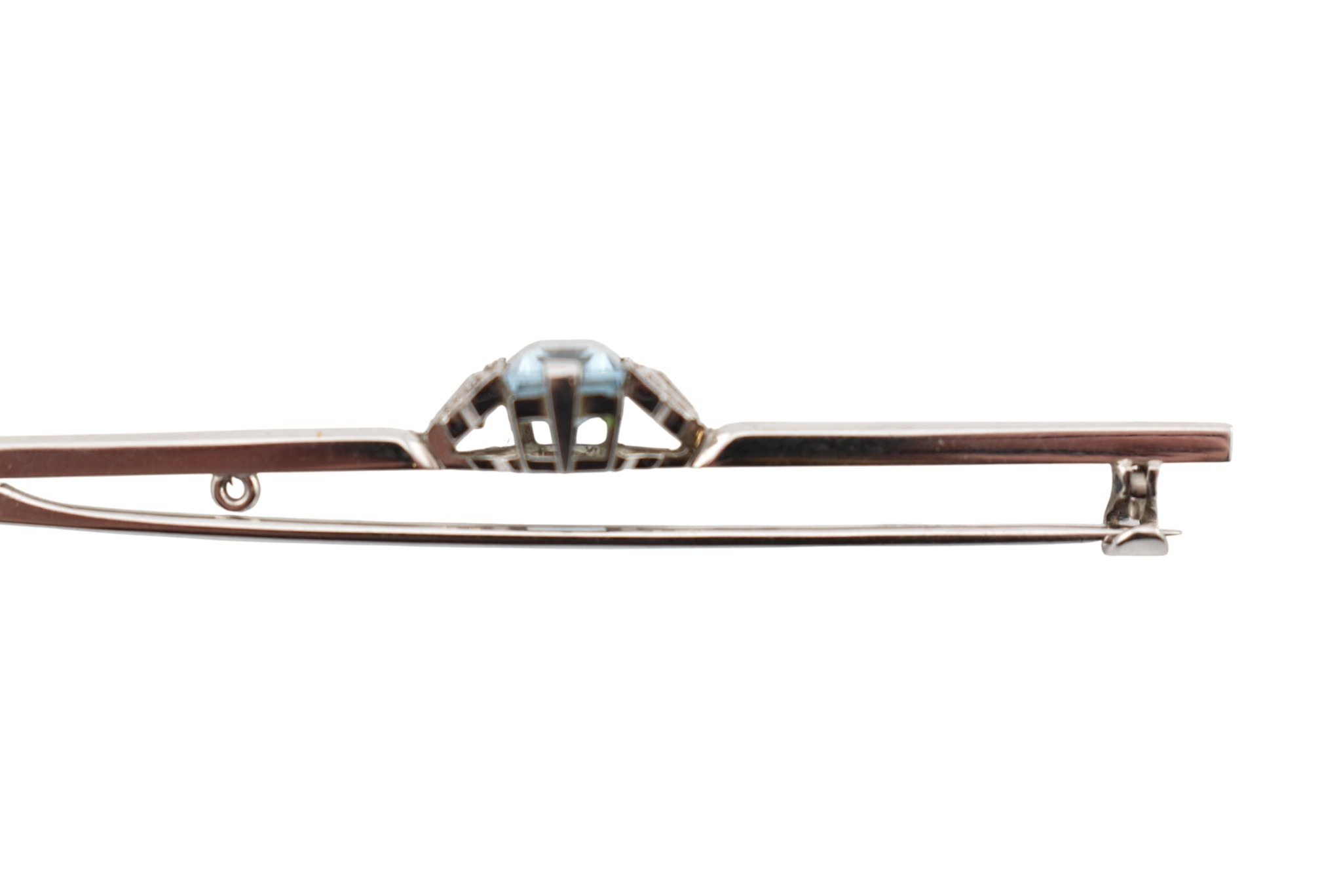 An Art Deco 18ct gold, platinum, aquamarine and diamond bar brooch pin. Stamped 18ct & Plat. Weight 3.8g. Measures 5.7cm.
