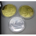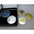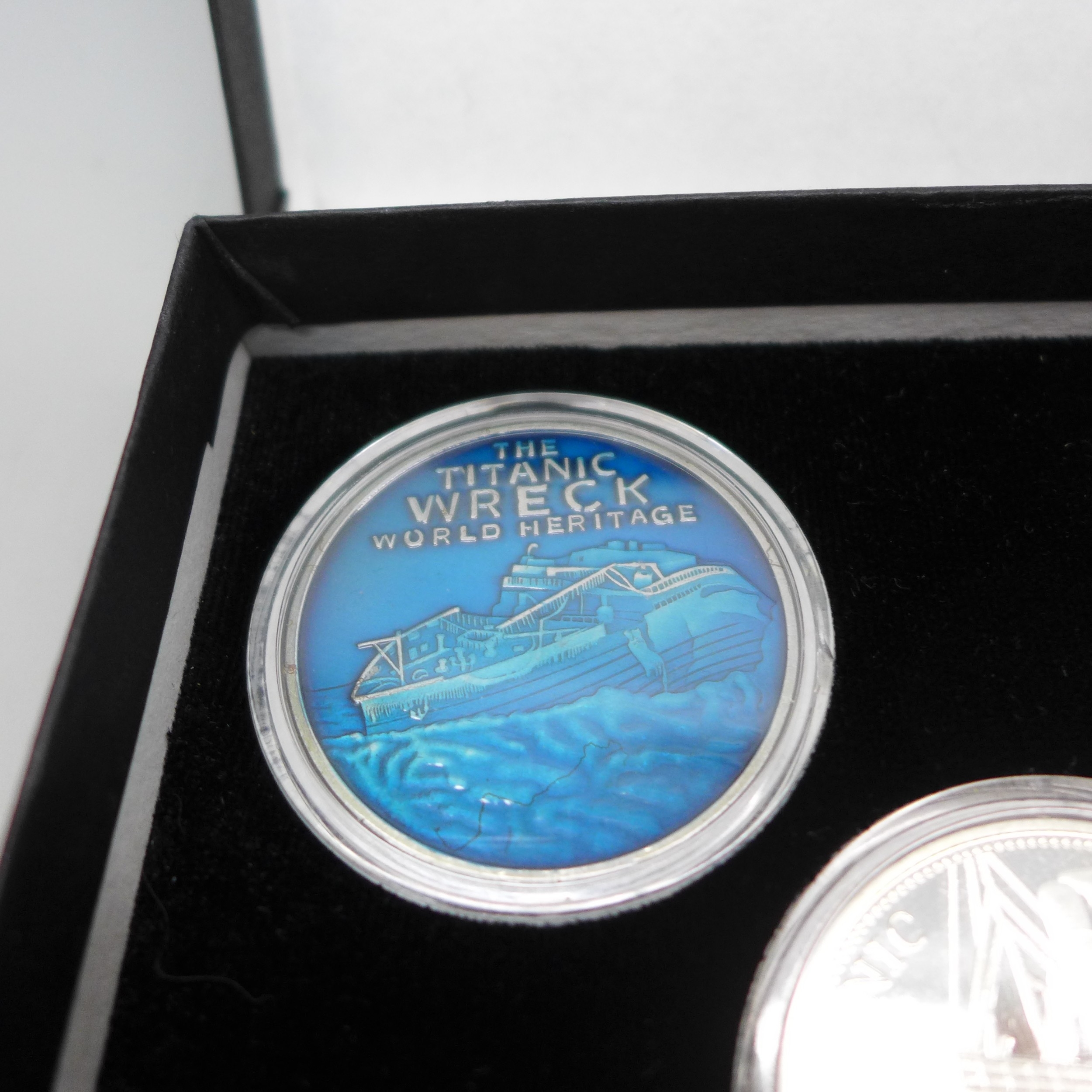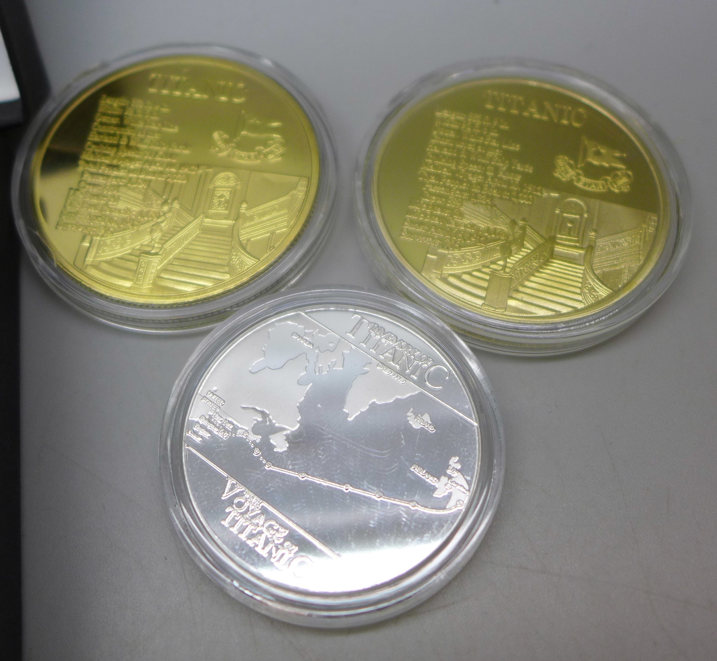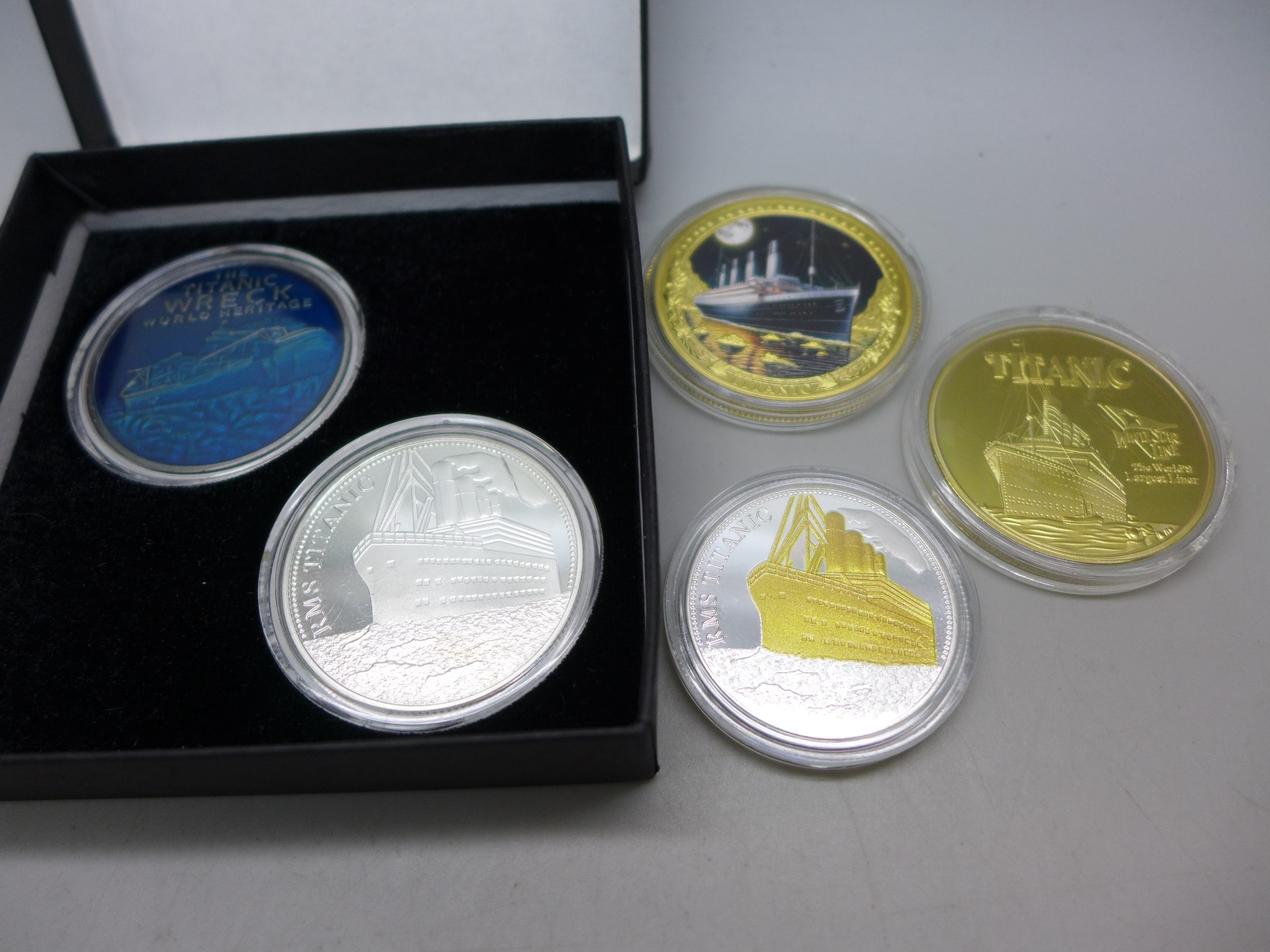 Coins - The Titanic, a set of five medallions in colour, gold, silver and blue, each medal shows the historic event